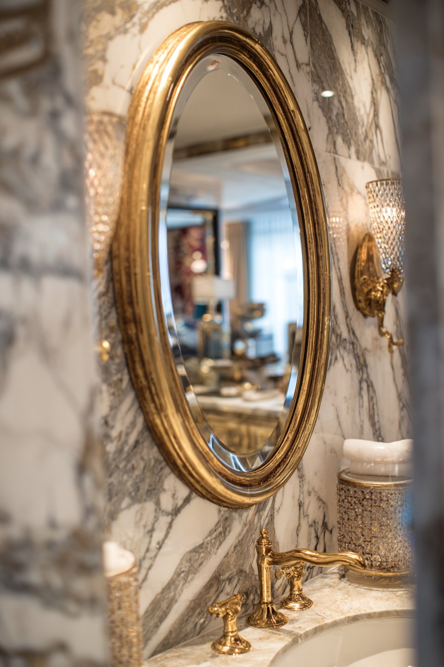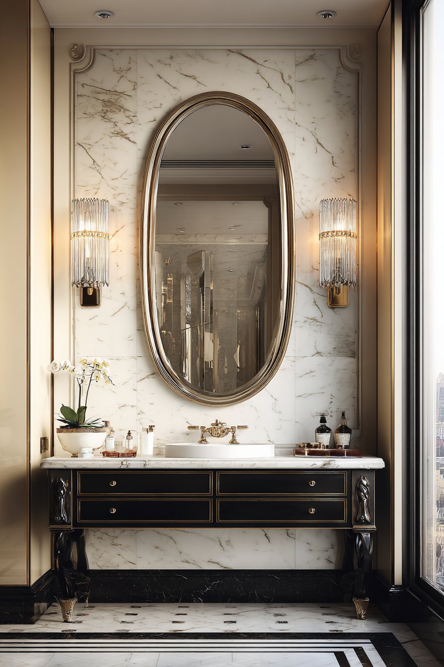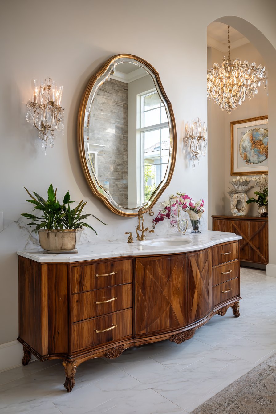 Wide-angle photography capturing the mirror’s elegant proportions and surrounding luxurious materials reveals a bathroom designed for those who appreciate traditional craftsmanship and enduring style. This large bathroom mirror idea works beautifully in powder rooms where making an impression is paramount, master bathrooms seeking old-Hollywood glamour, and any space where creating a sense of occasion is central to the design concept. The combination of oval form, substantial brass frame, and crystal lighting creates unabashed luxury that never apologizes for its opulence.