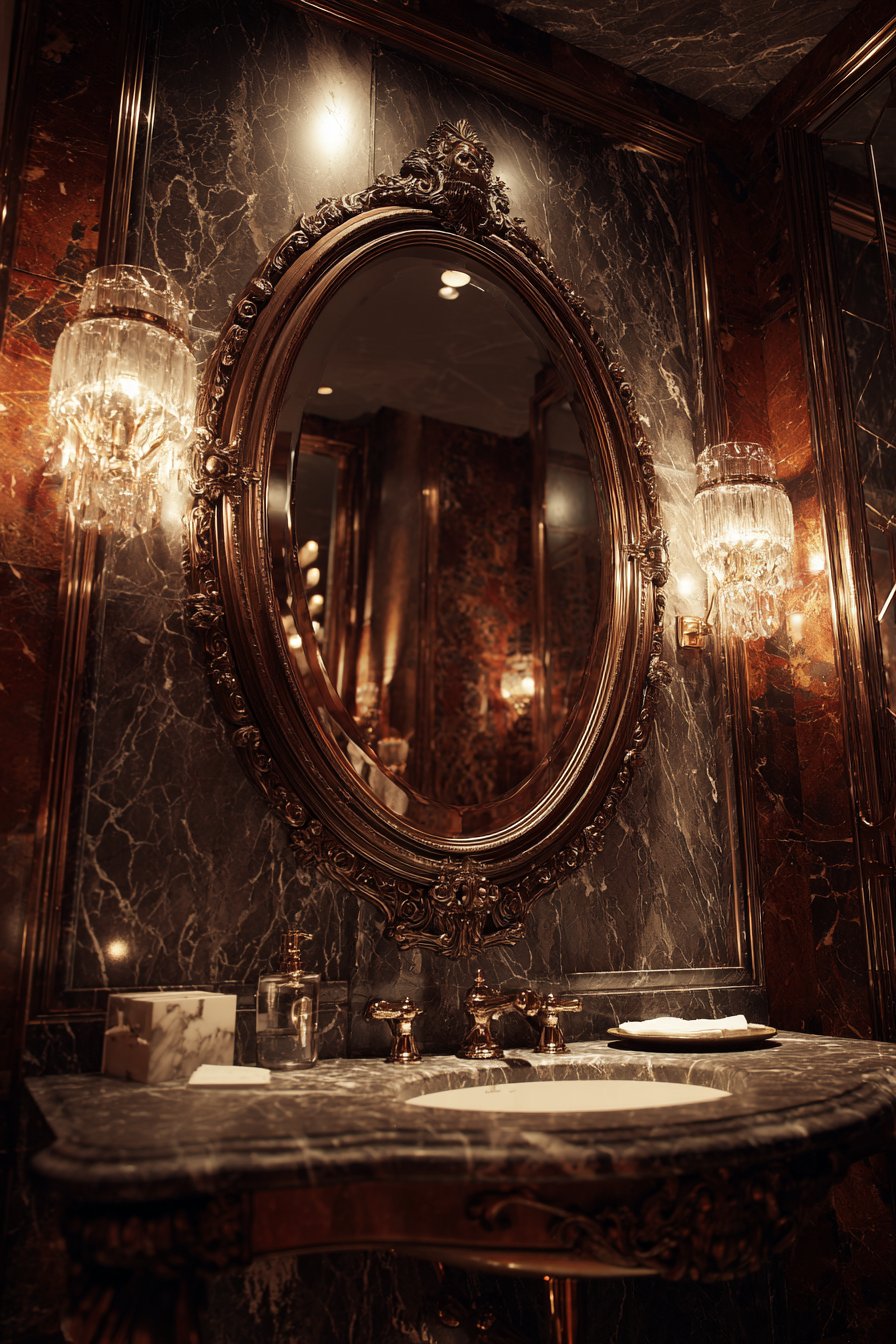 For those drawn to timeless glamour and sophisticated luxury, this large bathroom mirror idea delivers drama through classic proportions and luxurious materials. A substantial oval mirror with a thick brass frame, measuring five feet in vertical height, commands attention when mounted on a marble accent wall above a vintage-inspired console vanity with elegantly carved legs. The substantial brass frame—perhaps three inches wide—provides significant visual weight that establishes the mirror as a statement piece rather than a mere functional element. Crystal sconces flanking the mirror create a jewel-like quality, their faceted surfaces catching light and casting delicate patterns across surrounding surfaces.