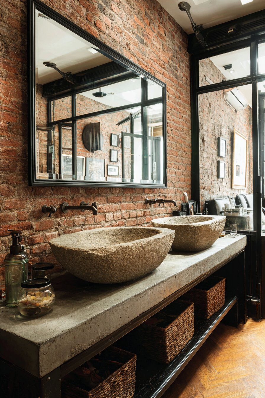 Key Design Tips: Ensure the concrete trough sink is properly sealed against water absorption and staining. Verify wall structure can support the mirror’s substantial width—professional installation is essential. Consider adding supplemental lighting beyond natural clerestory windows for evening and overcast days. Coordinate all black iron fixtures and hardware for consistent industrial aesthetic. Seal exposed brick to prevent dust while maintaining authentic appearance. Position the mirror to capture and reflect the exposed brick feature wall. Include proper drainage in the trough sink with adequate slope to prevent standing water.