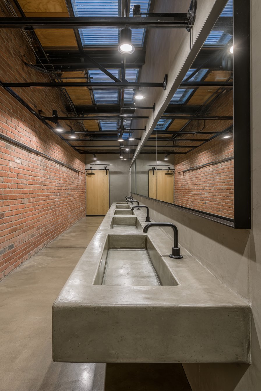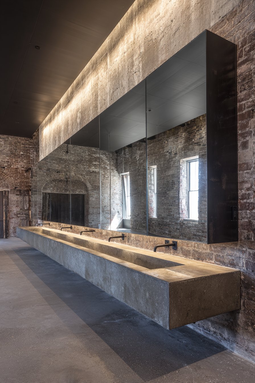 The concrete trough sink represents bold material choice that anchors the space with raw, tactile presence. Its substantial length allows multiple users simultaneously while its trough configuration maintains clean lines and minimalist form. The expansive mirror above serves multiple purposes in this industrial setting: it reflects the exposed brick’s texture and color variations, effectively doubling the visual impact of this architectural feature; it bounces precious natural light from the high clerestory windows throughout the space; and it provides the functional reflection necessary for a working bathroom. The frameless installation prevents visual clutter and allows the industrial materials—concrete, brick, iron—to dominate the aesthetic narrative.