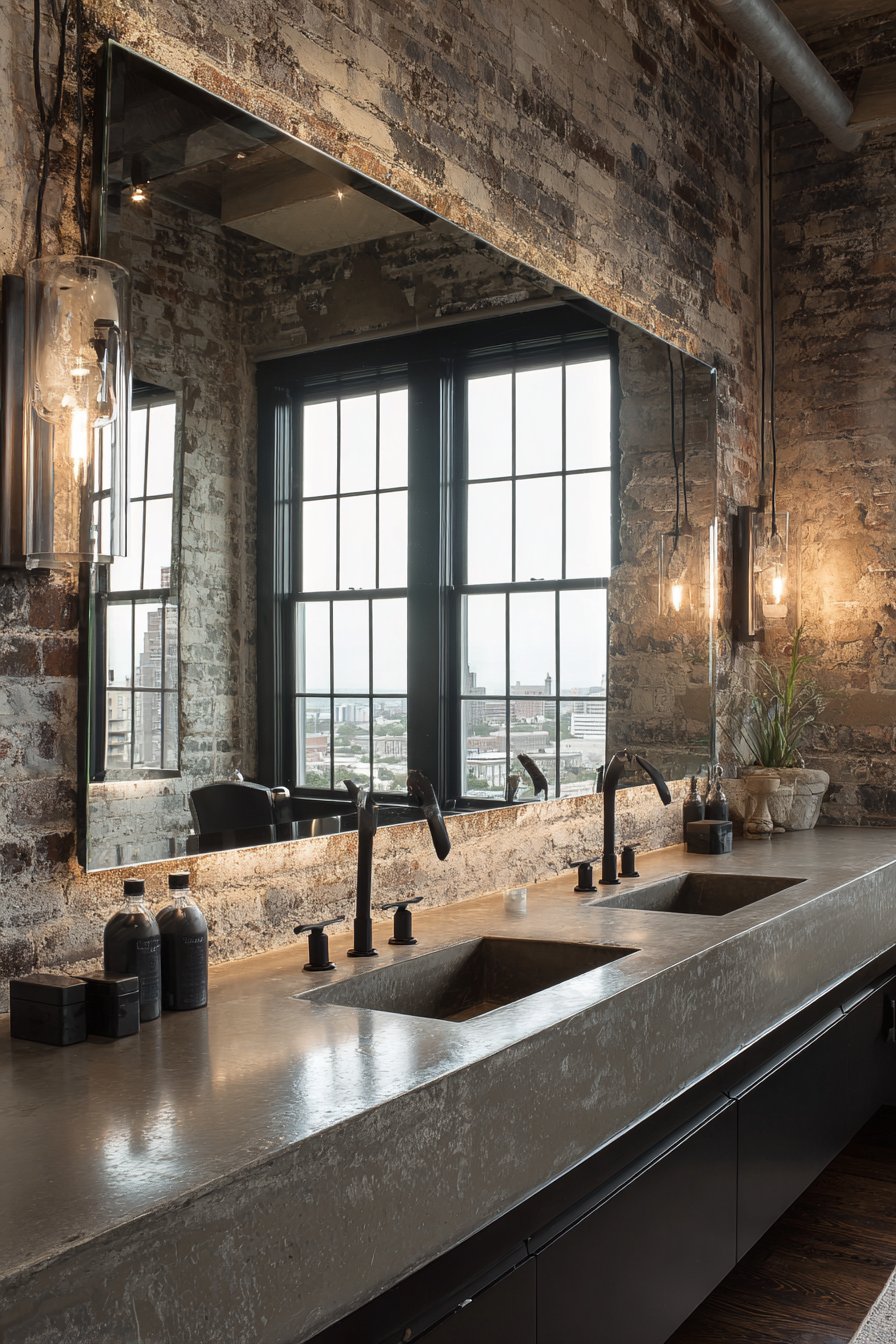 Embracing industrial aesthetic with refined execution, this large bathroom mirror idea features a wall-spanning frameless mirror with beveled edges installed above a concrete trough sink that extends an impressive eight feet. The industrial-chic bathroom includes exposed brick walls and black iron fixtures that create authentic urban loft character. Natural light from clerestory windows positioned high on the walls reflects throughout the space via the expansive mirror, bouncing light deep into the room and preventing the industrial materials from feeling dark or oppressive. The beveled mirror edges catch this natural light and refract it into subtle prismatic effects.