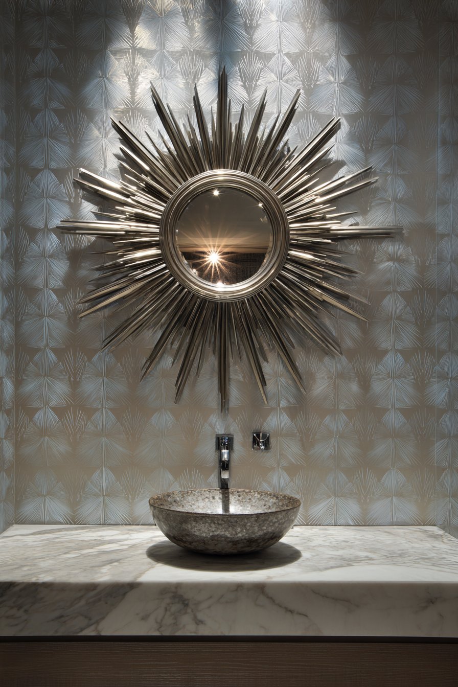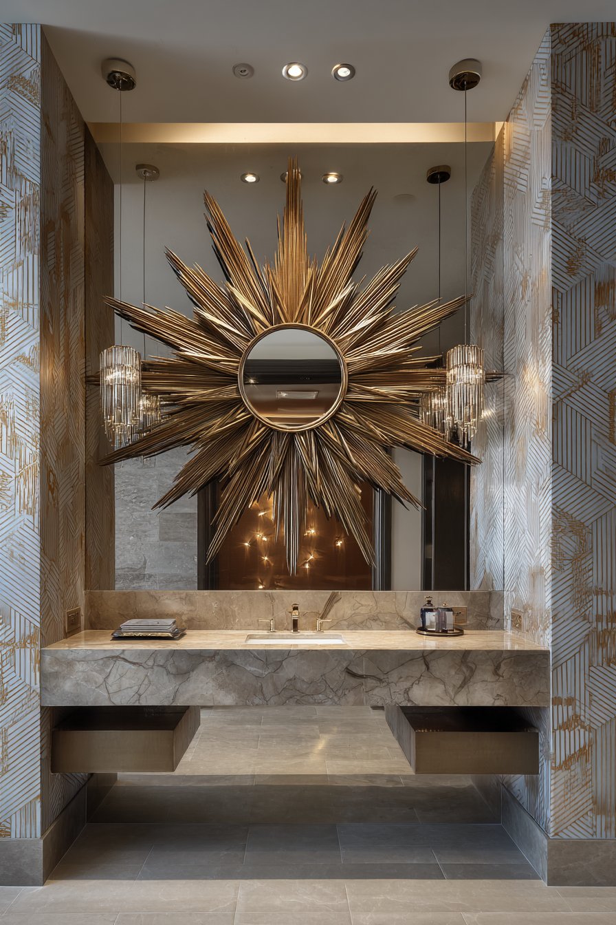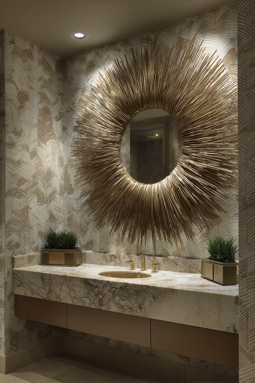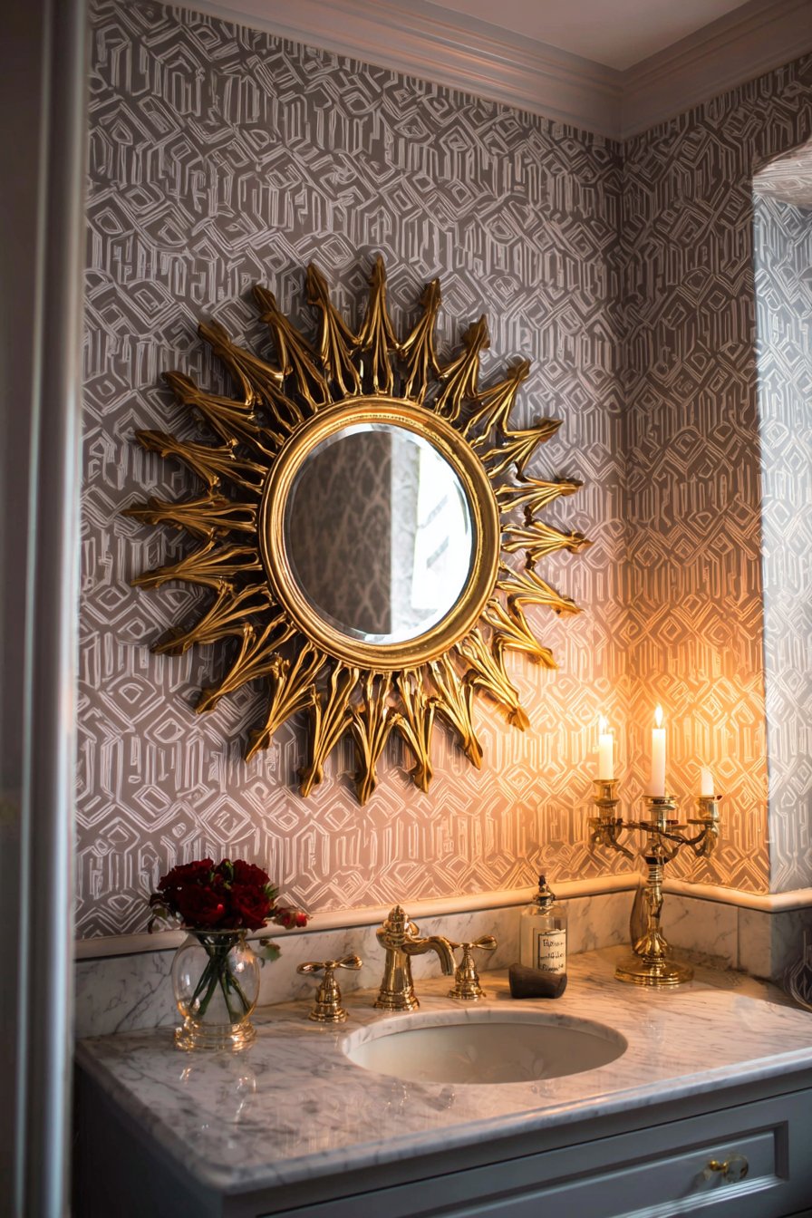 Making an undeniably bold statement, this decorative large bathroom mirror idea features an oversized sunburst design with radiating metal spokes in antique gold finish. The substantial mirror measures six feet in diameter, creating a dramatic focal point above a marble-topped vanity that grounds the ornate mirror with classical simplicity. The radiating spokes—perhaps numbering fifty or more—catch light from multiple angles, creating constantly changing patterns of shadow and highlight that animate the bathroom throughout the day. Surrounding walls feature subtle geometric wallpaper in complementary tones that adds pattern without competing with the mirror’s theatrical presence.