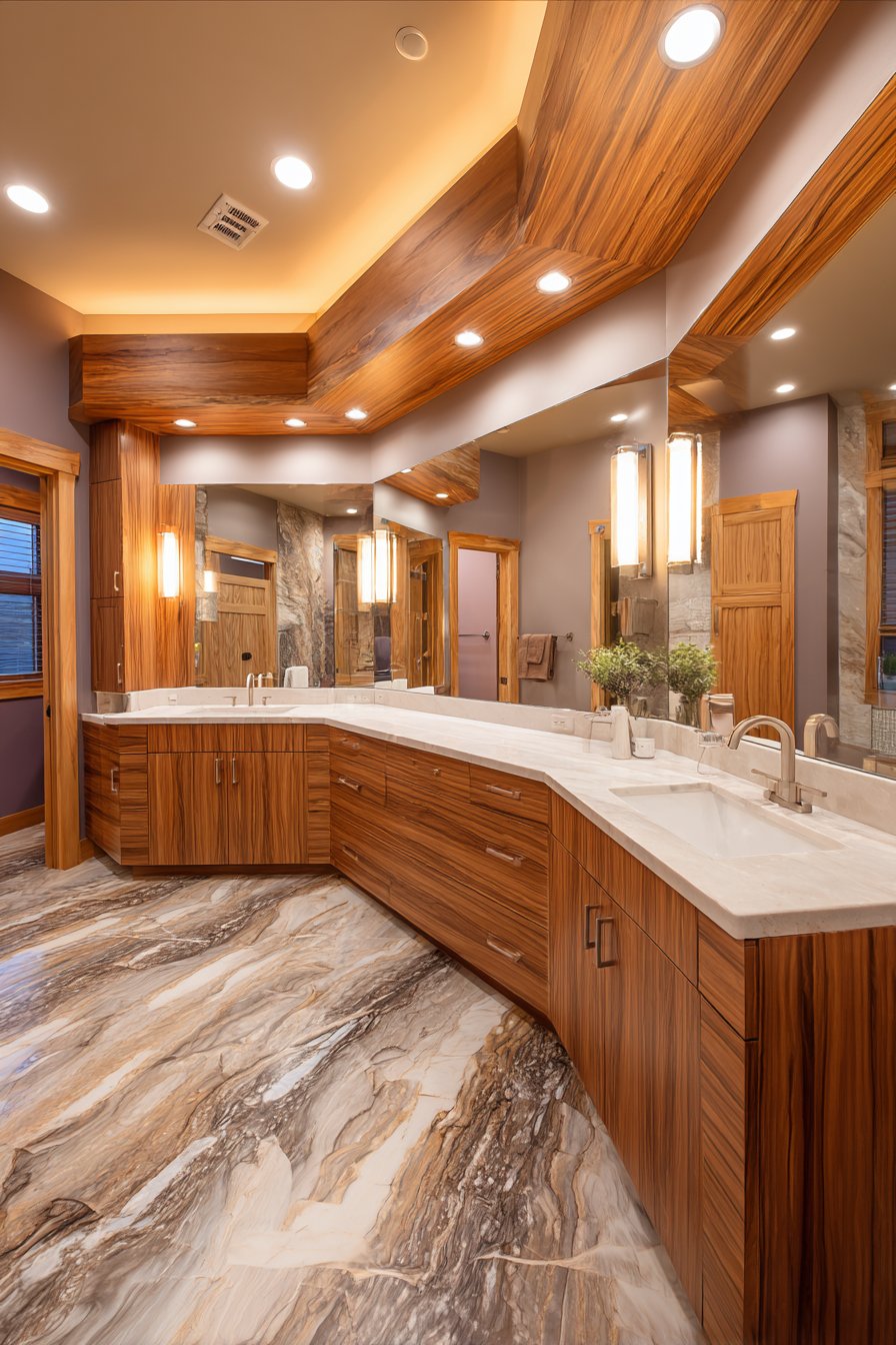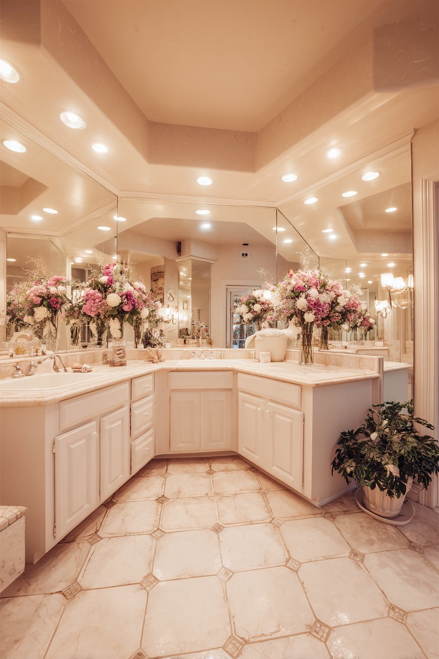 Pushing beyond conventional mirror placement, this creative large bathroom mirror idea features a horizontal mirror installation that wraps around a corner, creating continuous reflection across two adjacent walls. This innovative approach creates uninterrupted reflection above dual vanities positioned at right angles to each other, joined by a corner sink or storage unit. The mirror extends seamlessly from one wall to the next, the corner junction carefully mitered to maintain the illusion of one continuous surface. Below, waterfall-edge quartz countertops echo the mirror’s horizontal emphasis, their edges cascading vertically to meet the floor. Recessed lighting in the ceiling provides even illumination across both vanity areas.