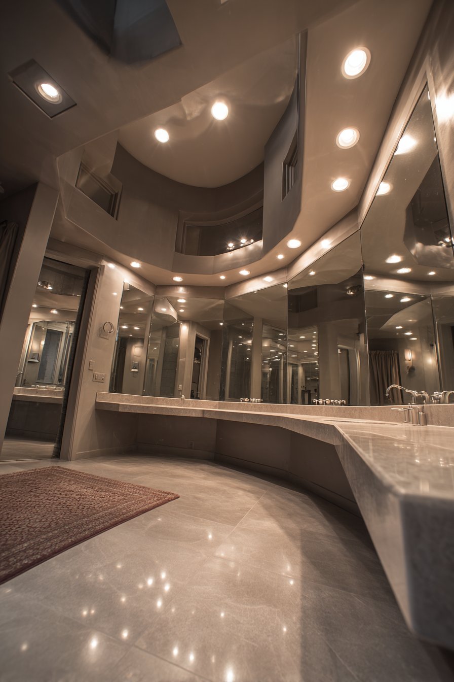 5. Floor-to-Ceiling Seamless Mirror with Skylight Integration