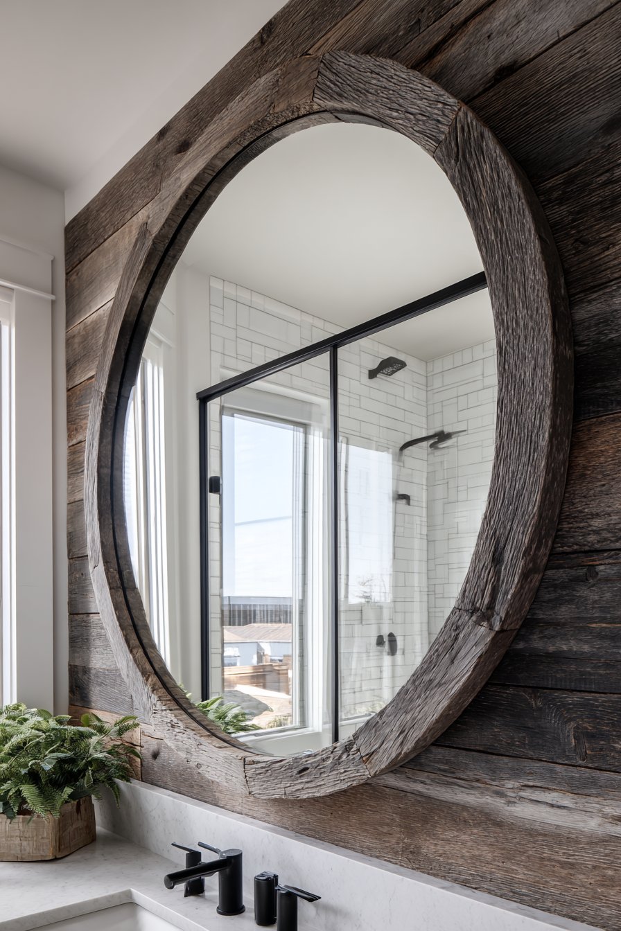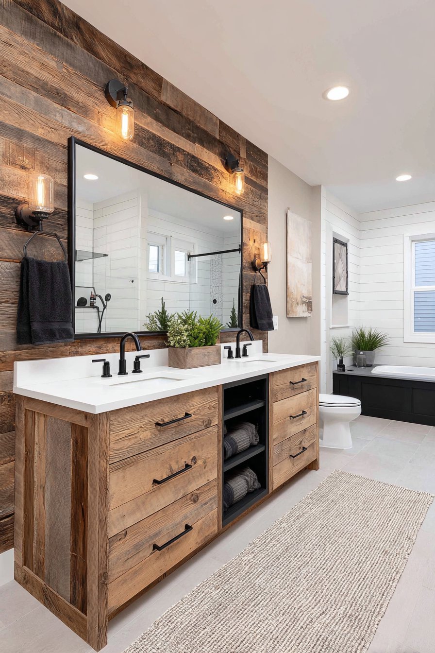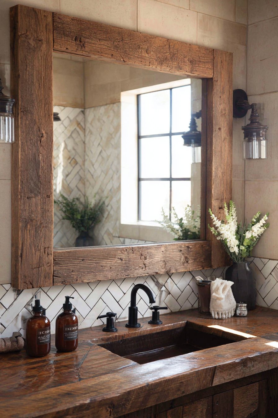 Interior design photography capturing the juxtaposition of rustic and contemporary elements reveals the careful balance required to make modern farmhouse design work—too much rusticity becomes theme-park obvious, while too much contemporary minimalism loses the style’s essential warmth. This large bathroom mirror idea hits that sweet spot, providing generous function through substantial size while adding character through authentic materials. The mirror works beautifully in suburban homes seeking farmhouse character, rural properties renovating with contemporary sensibility, and urban spaces wanting to inject rustic warmth.