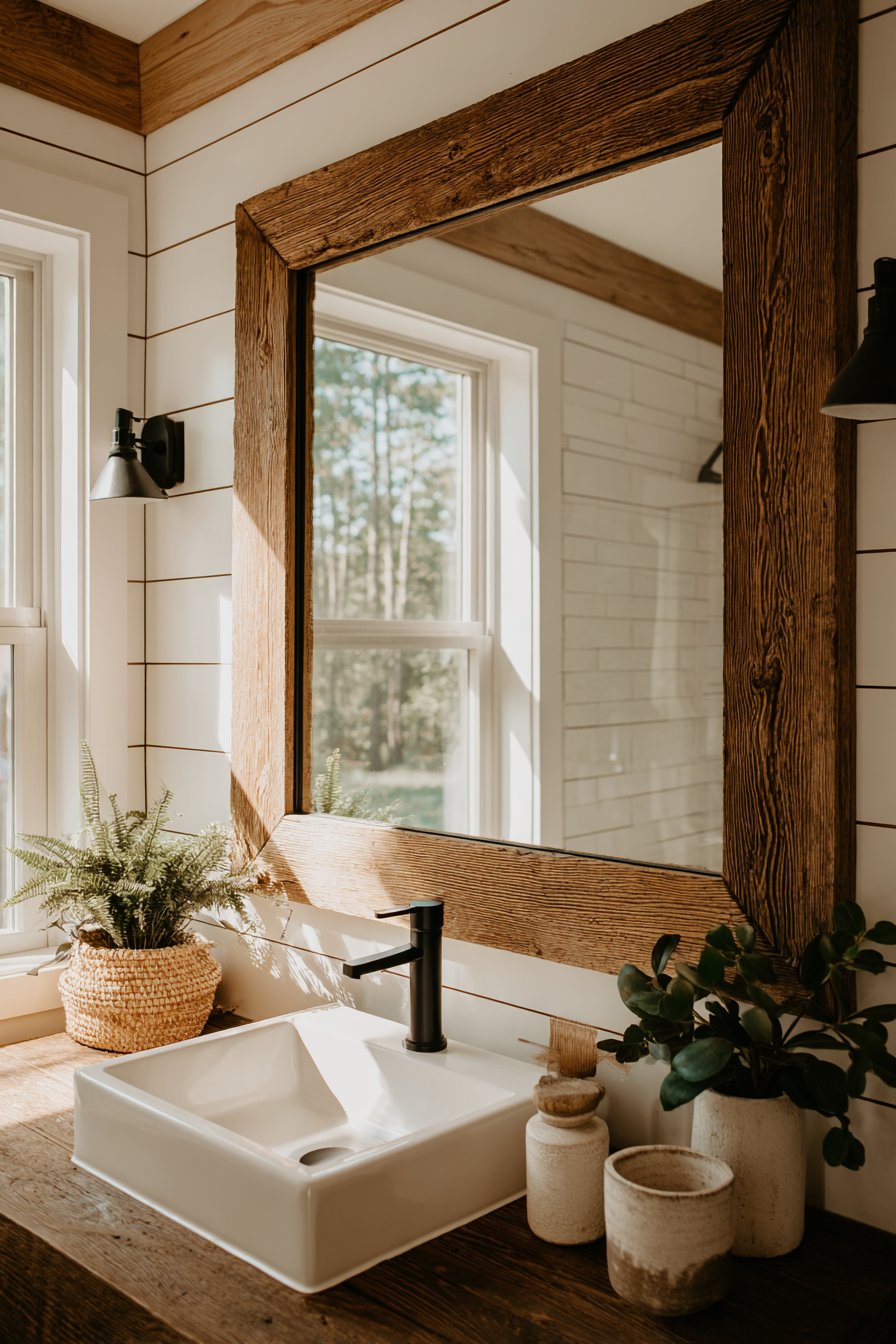 Key Design Tips: Source reclaimed wood from reputable suppliers who can provide information about the wood’s origin and any necessary treatments. Ensure the substantial frame is properly constructed with mortise-and-tenon or dowel joinery for lasting stability. Seal the wood thoroughly against bathroom humidity while maintaining its weathered appearance. Mount the heavy mirror with appropriate hardware rated for its considerable weight. Position the mirror to capture natural light that highlights the wood’s texture and patina. Coordinate with shiplap wall installation to ensure proper proportion—the mirror should neither overpower nor be dwarfed by the wall treatment. Include black matte fixtures throughout the bathroom for stylistic consistency.