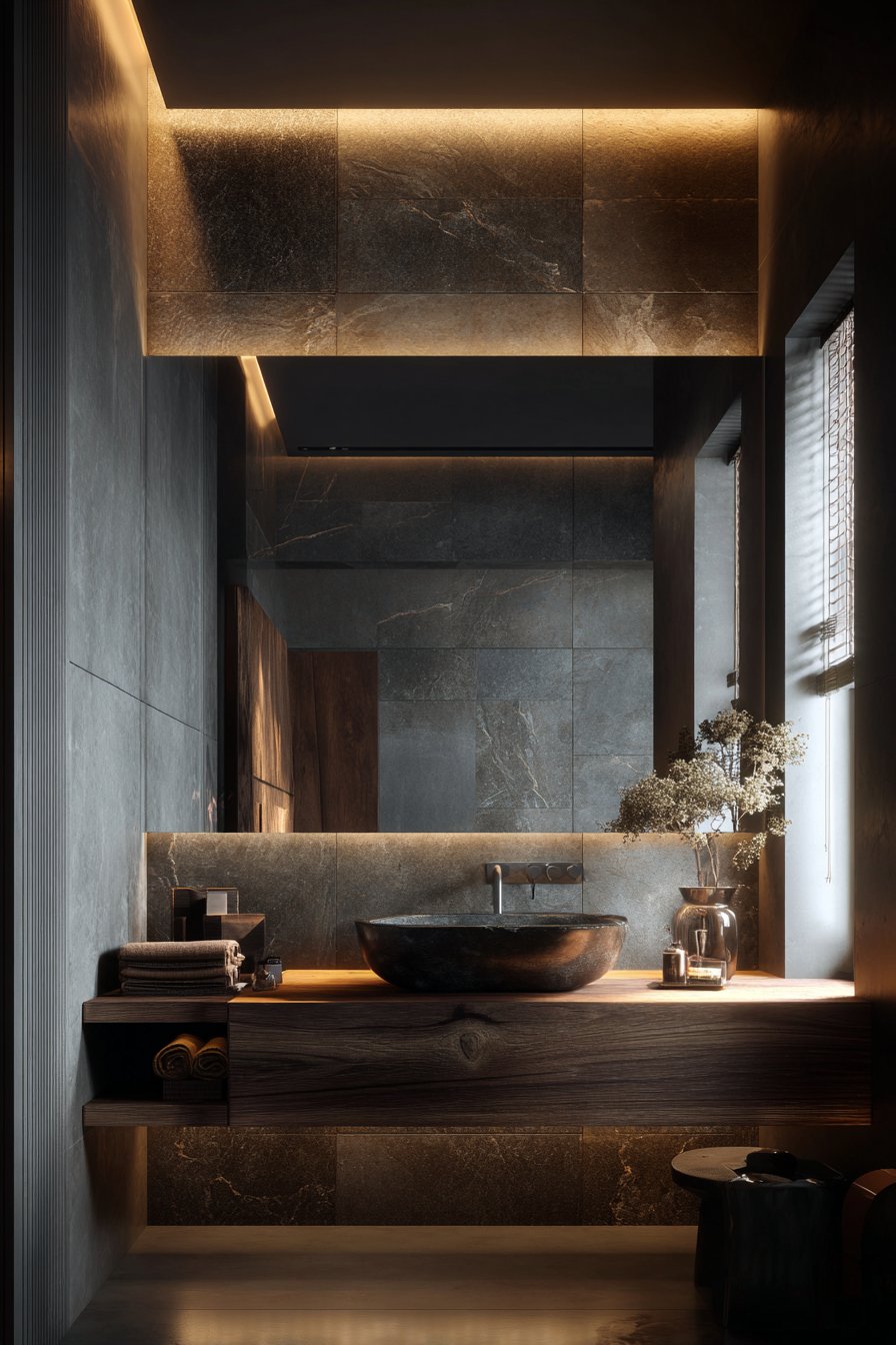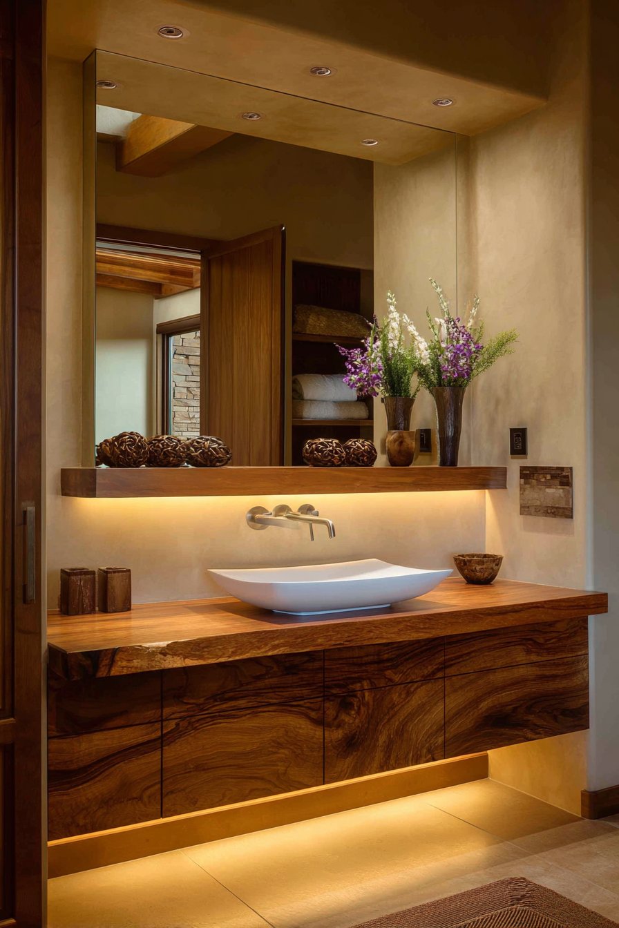 Creating visual complexity through layering, this innovative large bathroom mirror idea features a full-wall mirror installation behind a floating vanity that extends upward to a floating shelf mounted approximately six feet above the countertop. This shelf displays carefully curated bathroom accessories—perhaps sculptural objects, plants, or artisanal soap containers—creating a gallery-like display that’s reflected in the mirror behind, effectively doubling its visual impact. Integrated LED strip lighting beneath the floating shelf casts dramatic downward illumination that highlights the displayed objects while creating theatrical shadows. The layered composition creates dimensional depth that transforms a flat wall into an architecturally complex feature.