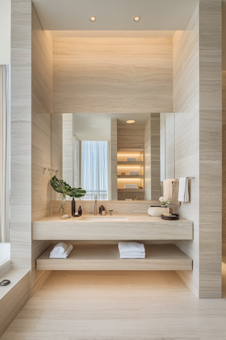 Key Design Tips: Ensure the floating shelf is mounted with robust hardware capable of supporting both its weight and displayed objects. Position the shelf high enough to clear users’ heads but low enough to reach for practical access. Consider the shelf’s depth carefully—too shallow limits display options while too deep creates awkward proportions. Coordinate the LED strip lighting’s color temperature with other bathroom lighting for visual harmony. Select curated display objects carefully—they become twice as prominent when reflected. Maintain some negative space on the shelf to prevent cluttered appearance. Verify the full-wall mirror installation accounts for the shelf’s mounting hardware without compromising mirror integrity.