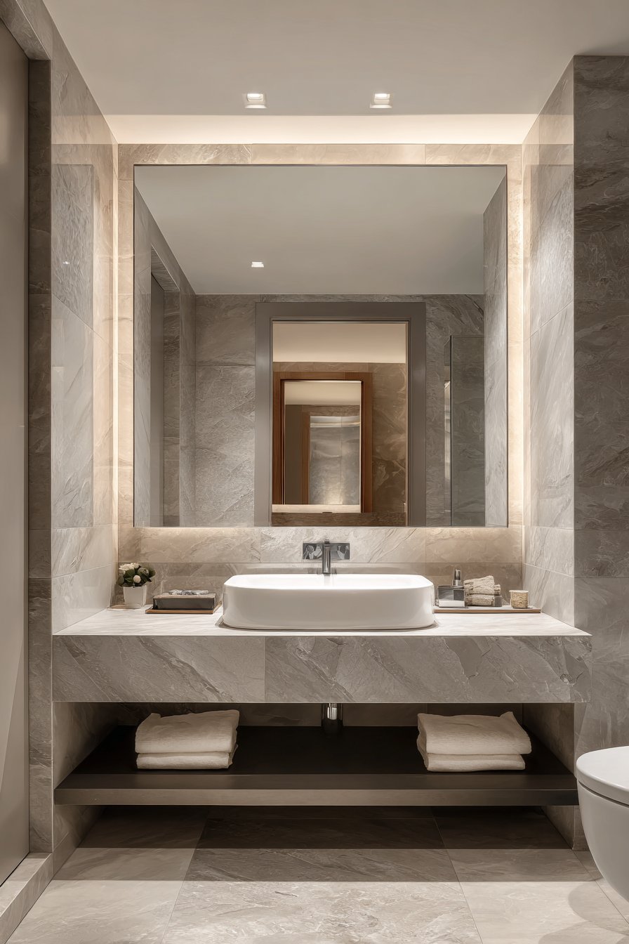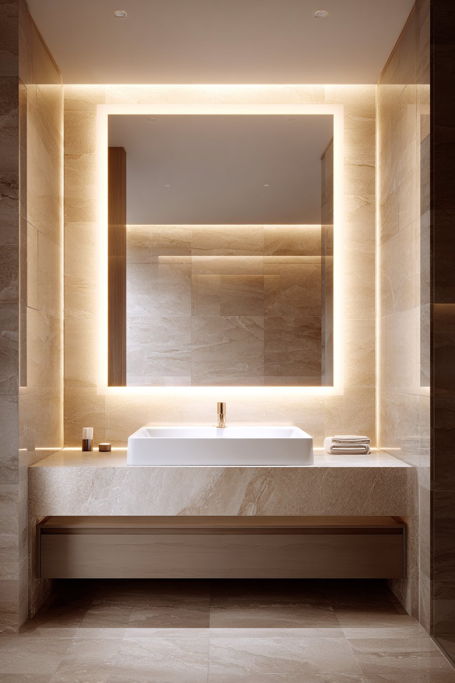 The true genius of this large bathroom mirror idea lies in its ability to create dimensional depth through reflection. As the mirror captures the carefully designed bathroom behind you—with its textured wall tiles, contemporary fixtures, and thoughtfully curated accessories—it effectively doubles the visual space, making even modestly sized bathrooms feel genuinely expansive. The integrated LED system serves dual purposes: providing essential task lighting for grooming activities while creating an ambient glow that transforms the bathroom into a tranquil retreat during evening hours. The backlit effect creates a floating appearance, as if the massive mirror hovers weightlessly against the wall.