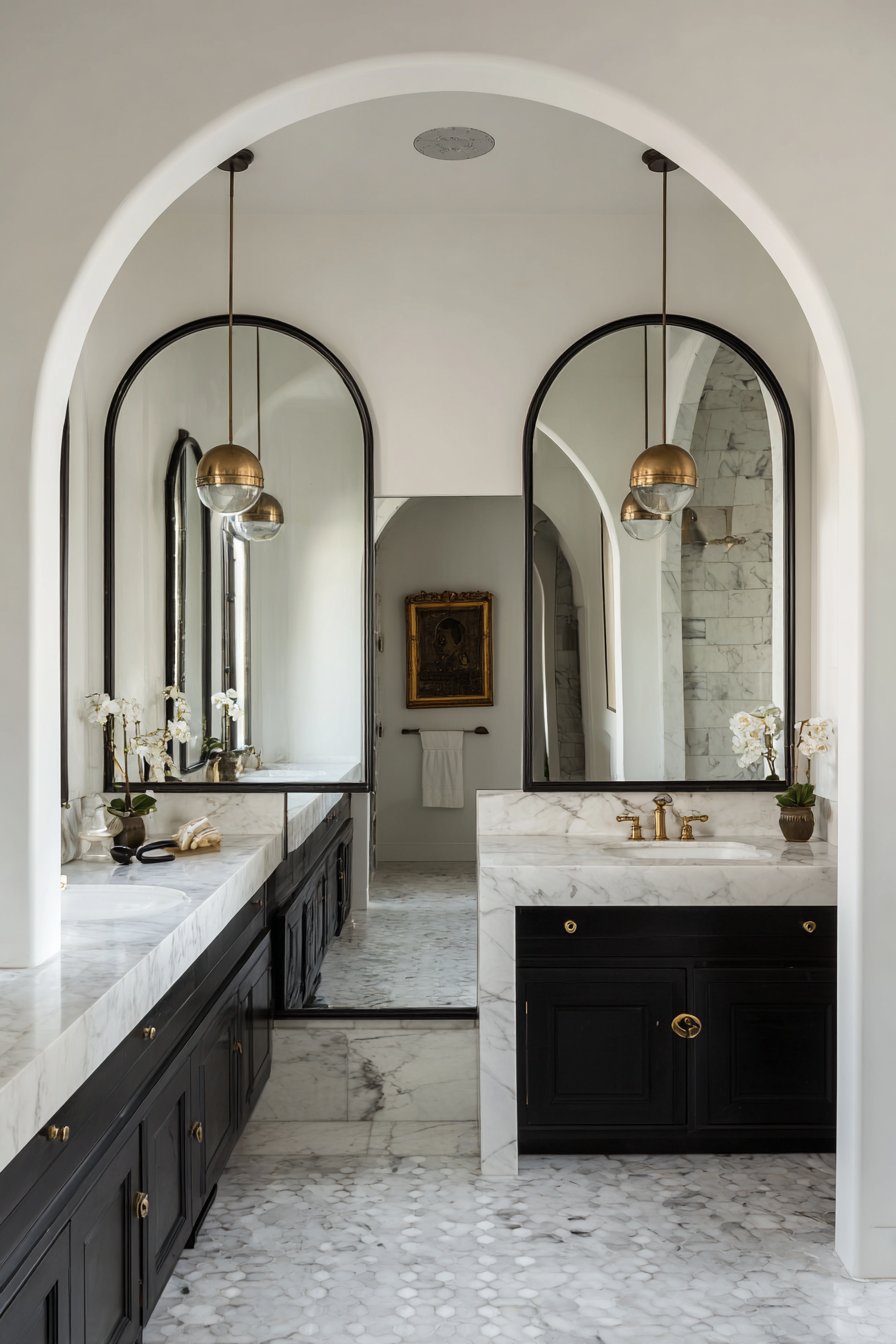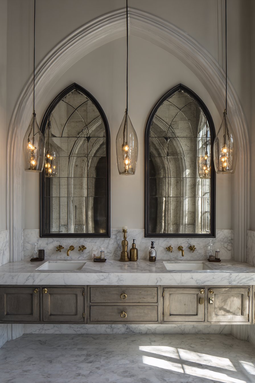 Drawing inspiration from ecclesiastical architecture, this sophisticated large bathroom mirror idea features a pair of graceful arched mirrors with thin black metal frames, each standing seven feet tall and positioned side-by-side above a luxurious double vanity. The cathedral-style arches create vertical emphasis that draws the eye upward while introducing elegant curved elements into the typically angular bathroom environment. The thin black metal frames provide just enough definition to establish each mirror as an individual architectural element while remaining refined enough to feel sophisticated rather than heavy. Between and around these impressive mirrors, pendant lights hang at varying heights, creating visual rhythm and providing adjustable task and ambient lighting.