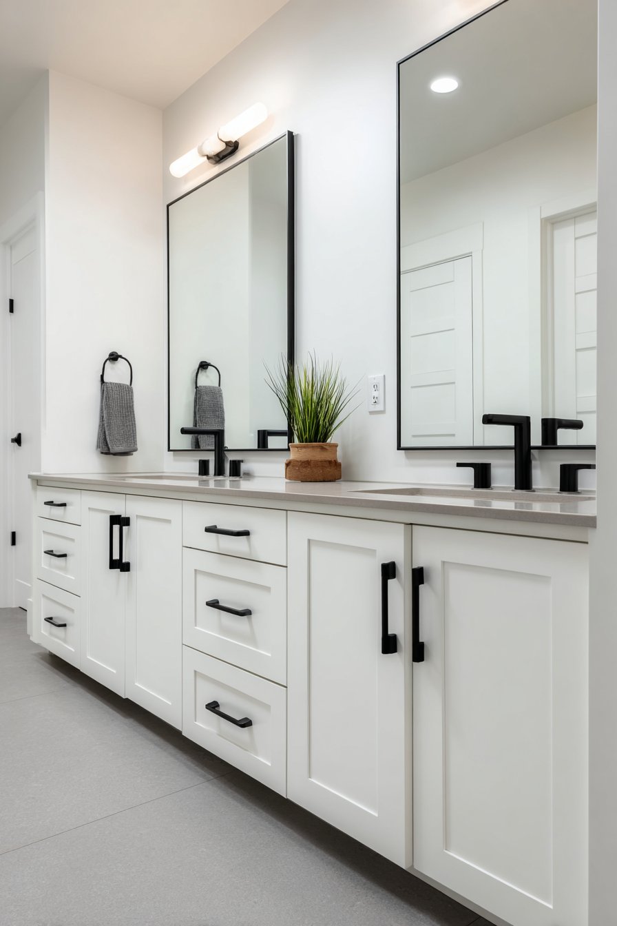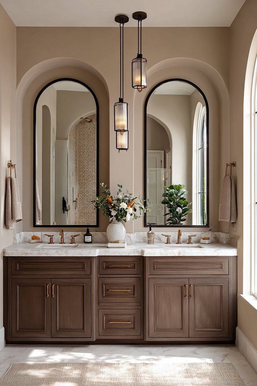 Key Design Tips: Ensure each arched mirror is proportioned for its wall—the arch’s curve should feel generous but not overwhelming. Mount mirrors with their bases aligned horizontally even if ceiling lines aren’t perfectly level. Coordinate the black metal frames with pendant light fixtures and other bathroom hardware. Position pendant lights strategically to avoid casting shadows while providing adequate task lighting. Consider the arch shape carefully—Gothic arches feel dramatically vertical while Roman arches appear more restful. Verify the mirrors’ substantial height is accommodated by ceiling clearances and doesn’t interfere with any overhead elements. Include proper backing and mounting for the tall, potentially heavy mirror installations.