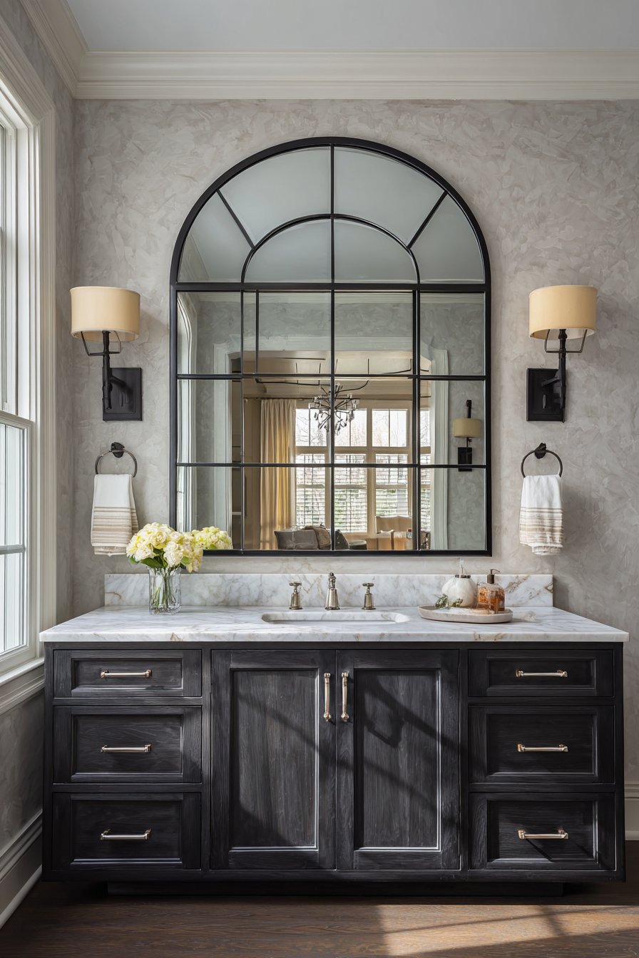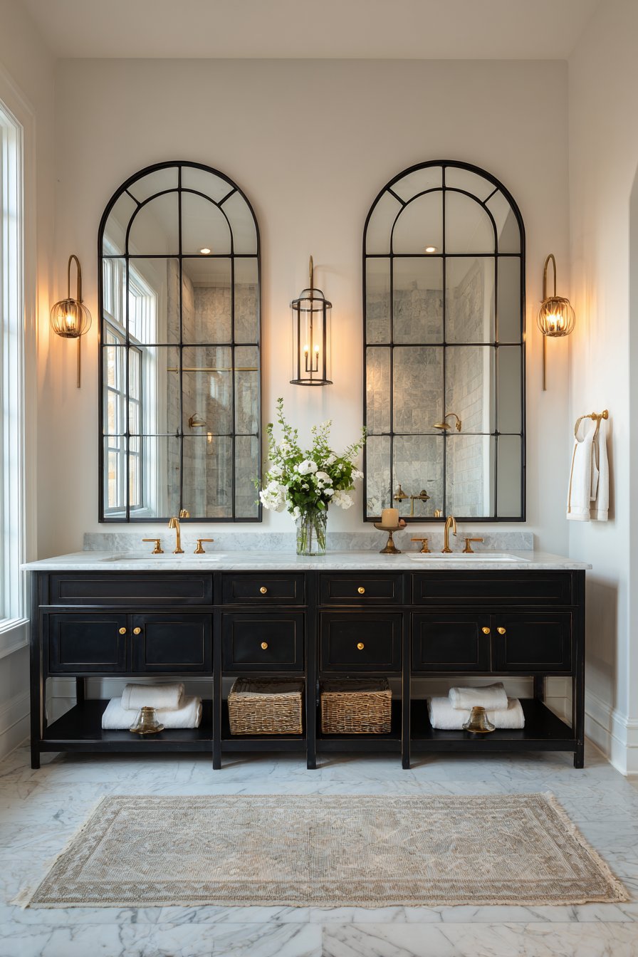 The cathedral arch form carries associations with grandeur, spirituality, and timeless beauty—qualities that translate surprisingly well to residential bathroom design. The vertical emphasis of seven-foot-tall arches helps bathrooms with high ceilings feel properly proportioned while adding architectural gravitas to standard eight-foot ceilings. Against white marble surfaces and alongside brass hardware, the black metal frames provide necessary contrast and definition, preventing the space from becoming visually washed out. The paired arrangement creates symmetry and balance while allowing each user of the double vanity their own defined space complete with dedicated reflection and lighting.