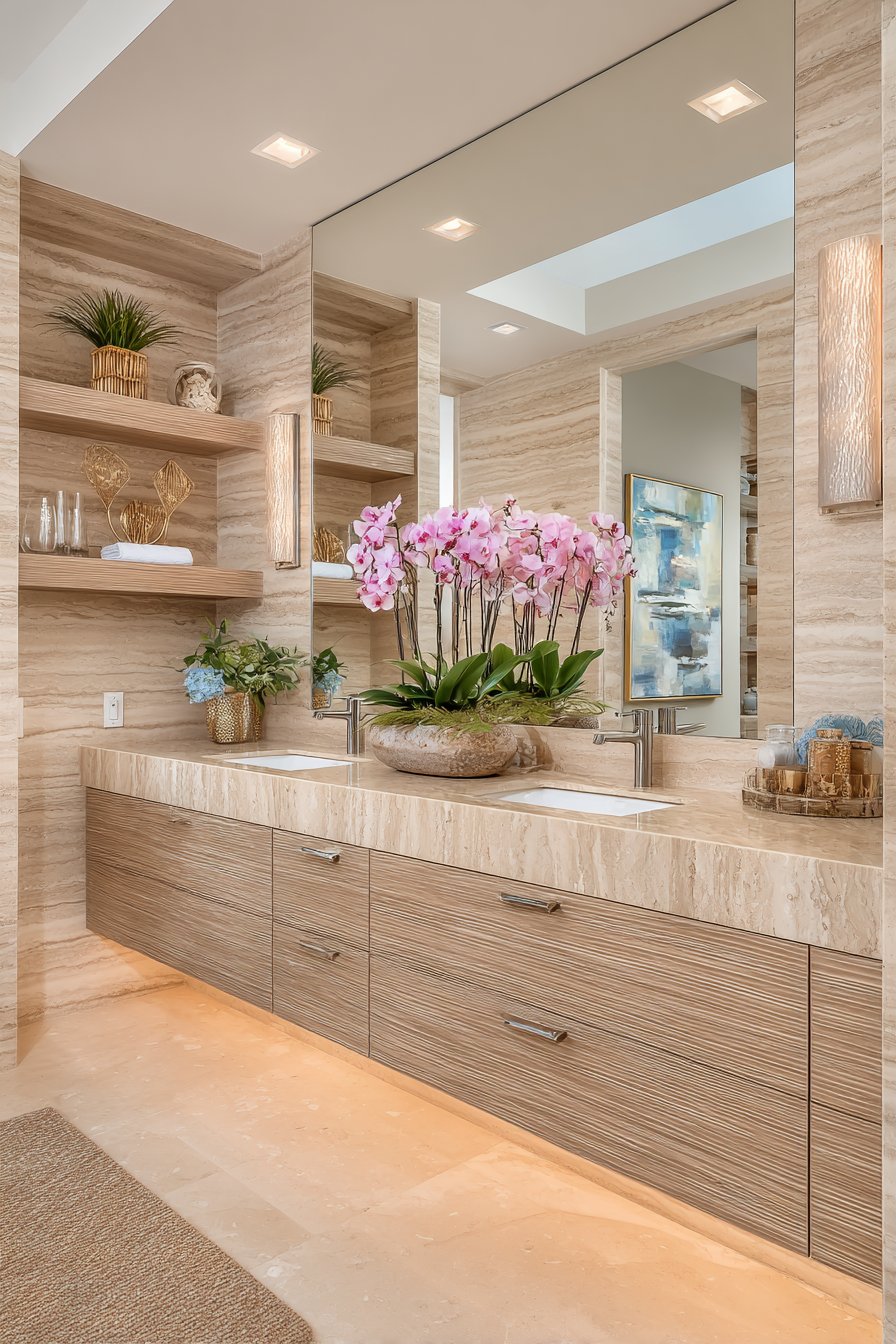 Wide-angle interior design photography emphasizing spatial perception and layered lighting captures the sophisticated visual effects this large bathroom mirror idea creates. The composition works on multiple levels—there’s the physical reality of vanity, mirror, and floating shelf, but also the reflected reality visible in the mirror, creating layers of visual information that reward extended viewing. This approach particularly suits contemporary bathrooms where creating visual interest through geometric layering and strategic lighting is preferred over applied ornament. The design also offers practical advantages—the floating shelf provides accessible storage and display while the full-wall mirror maximizes reflection and light distribution.
