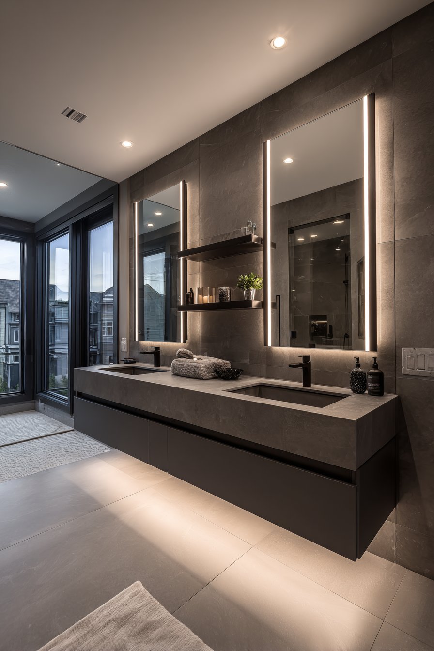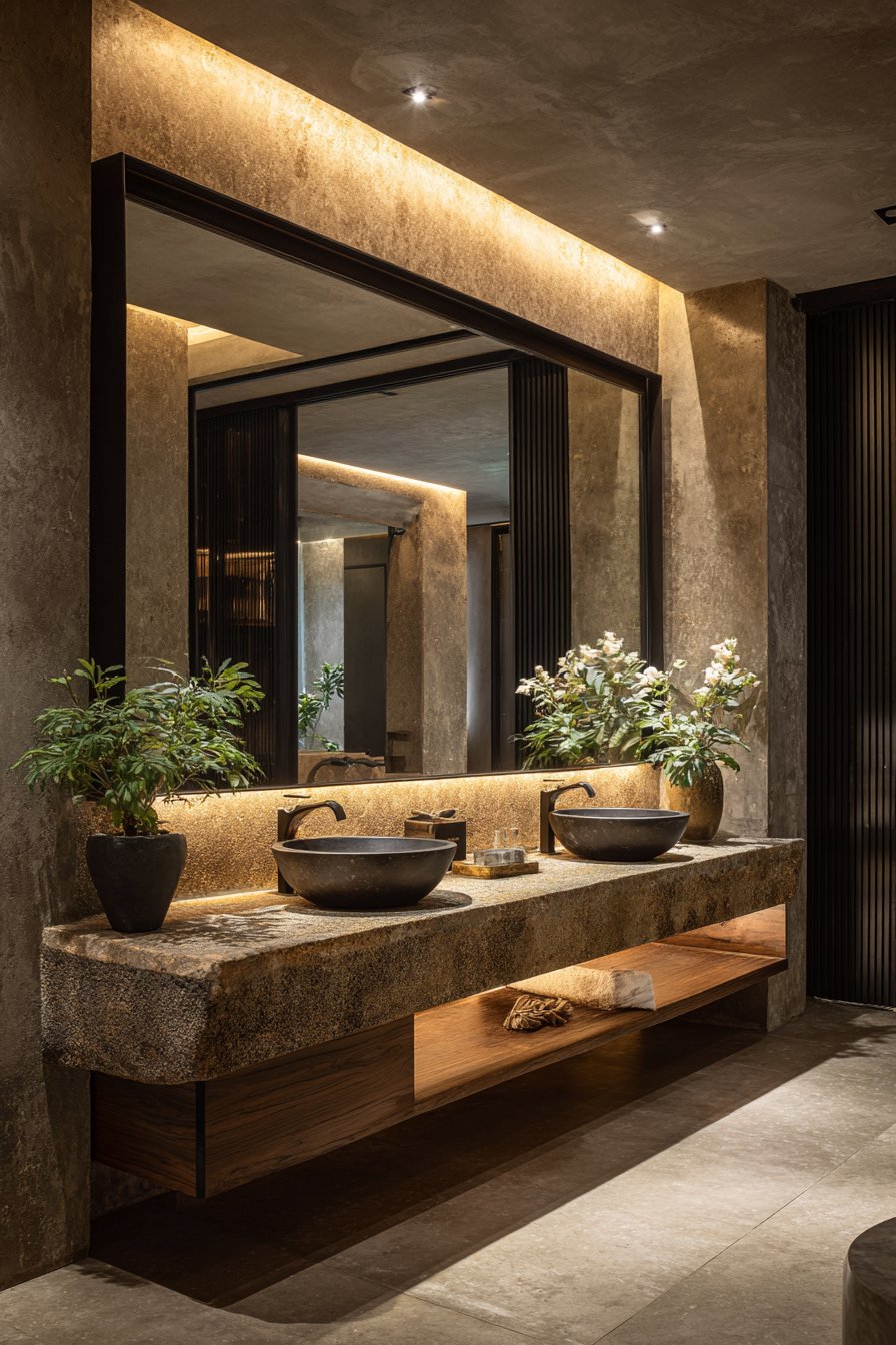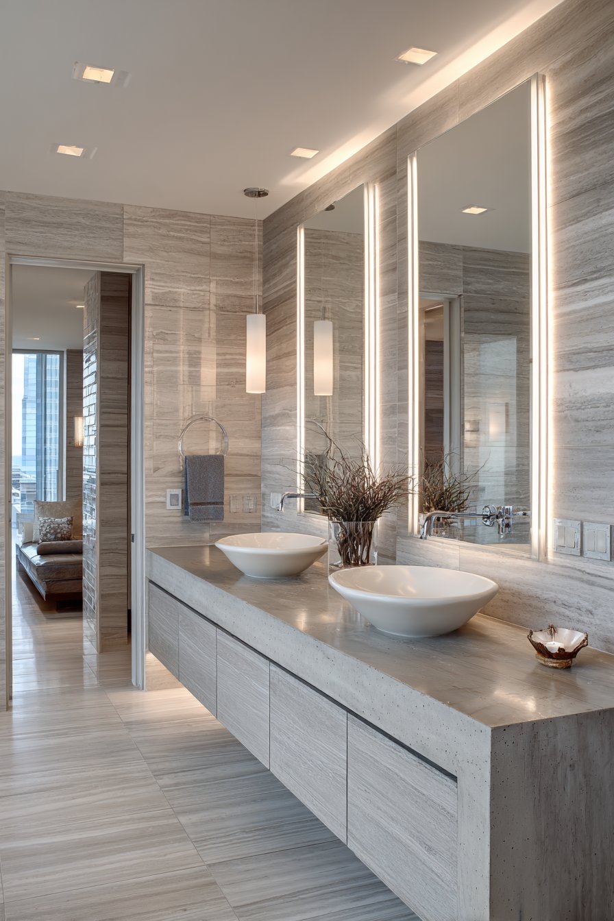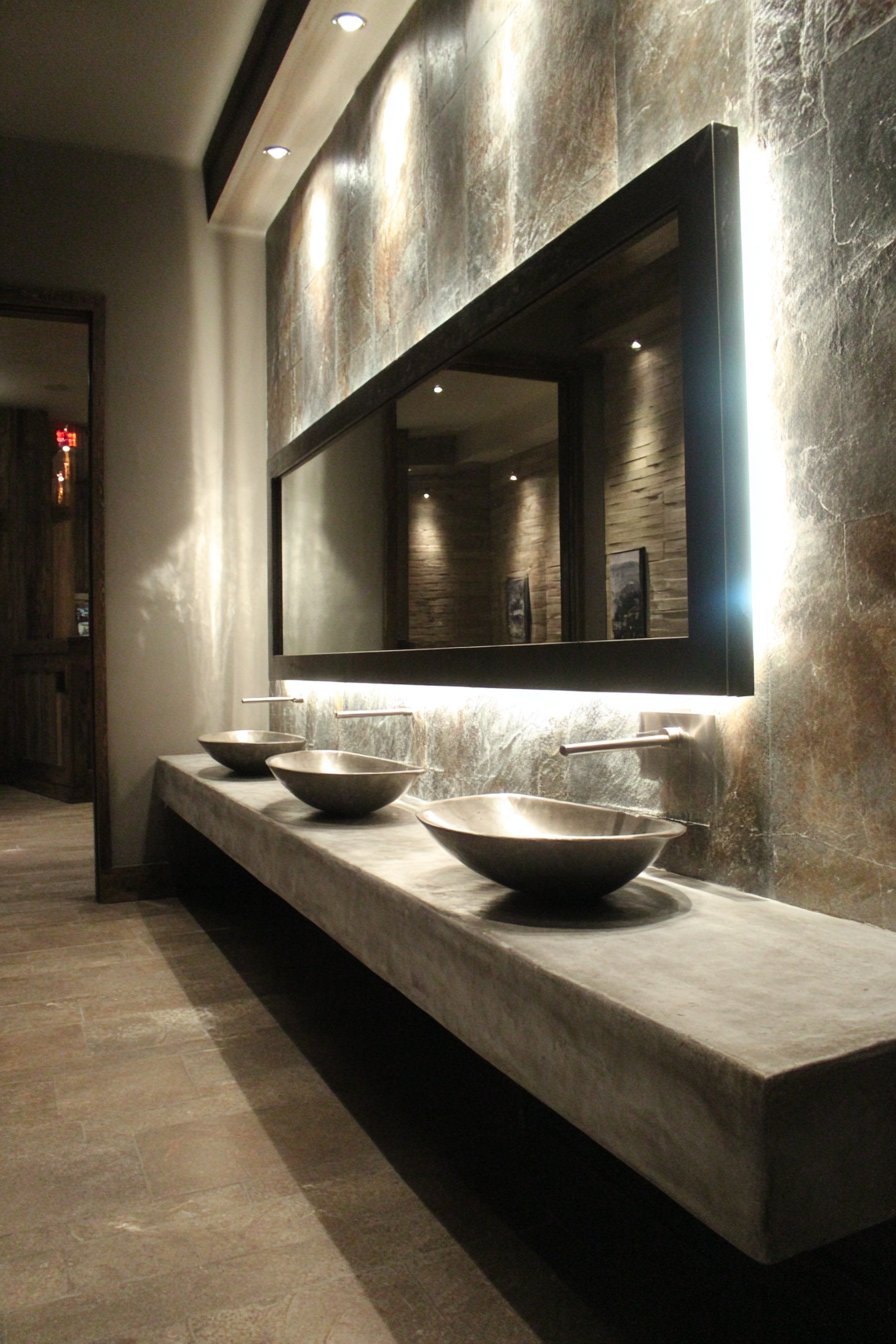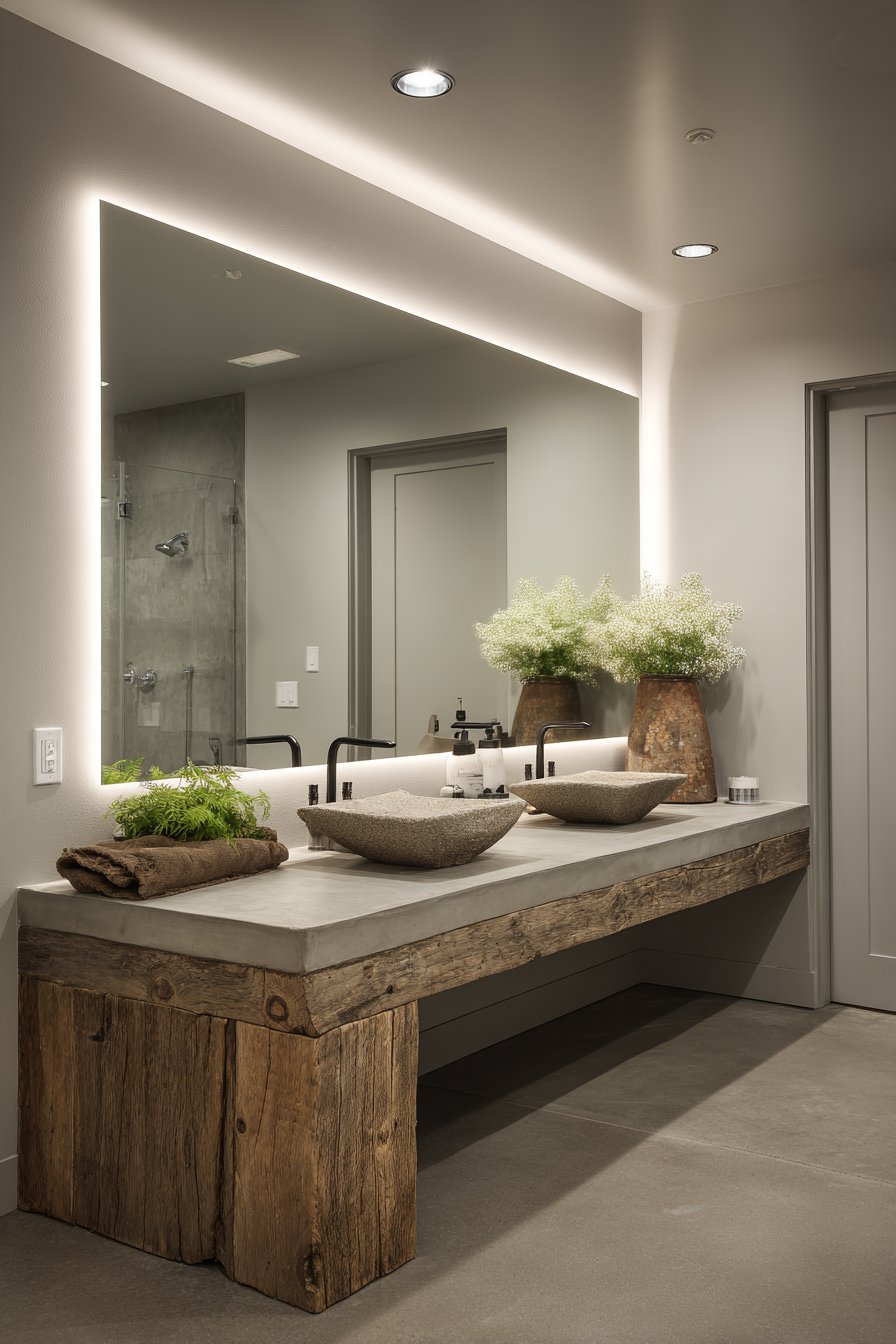 This innovative large bathroom mirror idea transforms the entire vanity wall into one continuous reflective surface, interrupted only by horizontal LED strip lighting positioned along the top and bottom edges. The result is a strikingly contemporary installation that appears to float against the wall, suspended by bands of light. Below this impressive mirror sits a lengthy single-slab concrete vanity—a bold material choice that grounds the ethereal quality of the backlit mirror with raw, tactile presence. The dual vessel sinks positioned along this substantial vanity become sculptural elements in their own right, their forms reflected and multiplied in the expansive mirror surface above.