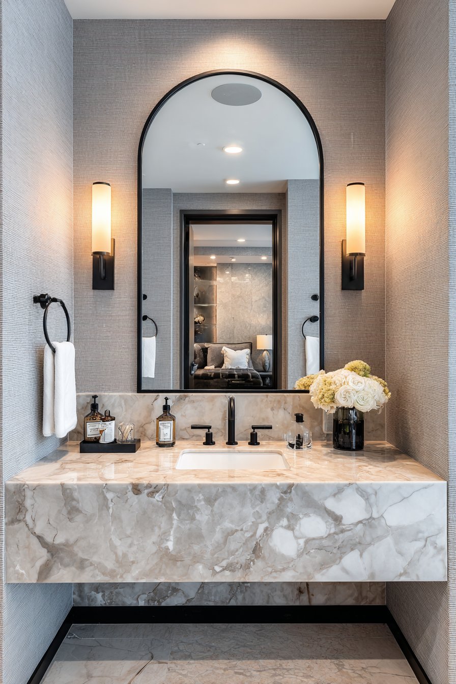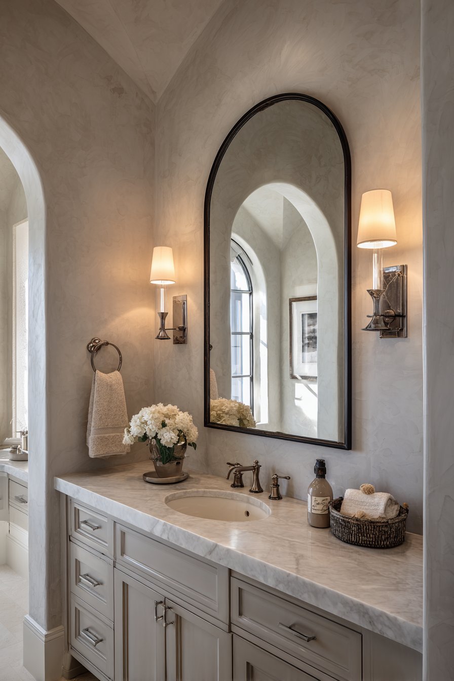 The oversized arched mirror represents a return to classical architectural proportions while maintaining thoroughly modern sensibility through its minimalist matte black metal frame. Rising dramatically from the marble vanity countertop to near-ceiling height, this large bathroom mirror idea creates an immediate focal point that draws the eye upward, emphasizing vertical space and adding an element of grandeur to the room. The arch’s graceful curve softens the typically angular geometry of bathroom spaces, introducing an organic element that feels both timeless and contemporary. Flanking the mirror, carefully positioned dual sconce lighting casts warm illumination across the wall, creating gentle shadows that accentuate the surrounding textured plaster.