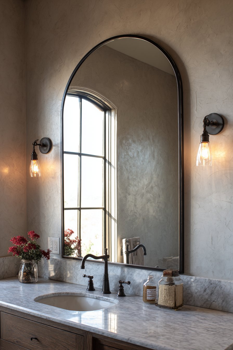 This design approach excels in bathrooms with higher ceilings, where the vertical emphasis of the arched mirror helps establish proper scale and prevents the space from feeling top-heavy or disconnected. The matte black frame provides just enough definition to distinguish the mirror as an intentional design element rather than a purely functional fixture, while remaining understated enough not to overwhelm the space. Against light gray textured plaster walls, the black frame creates sophisticated contrast that reads as elegant rather than stark. The mirror’s substantial size—often extending six to seven feet in height—makes it impossible to ignore, effectively establishing itself as the room’s dominant design feature.