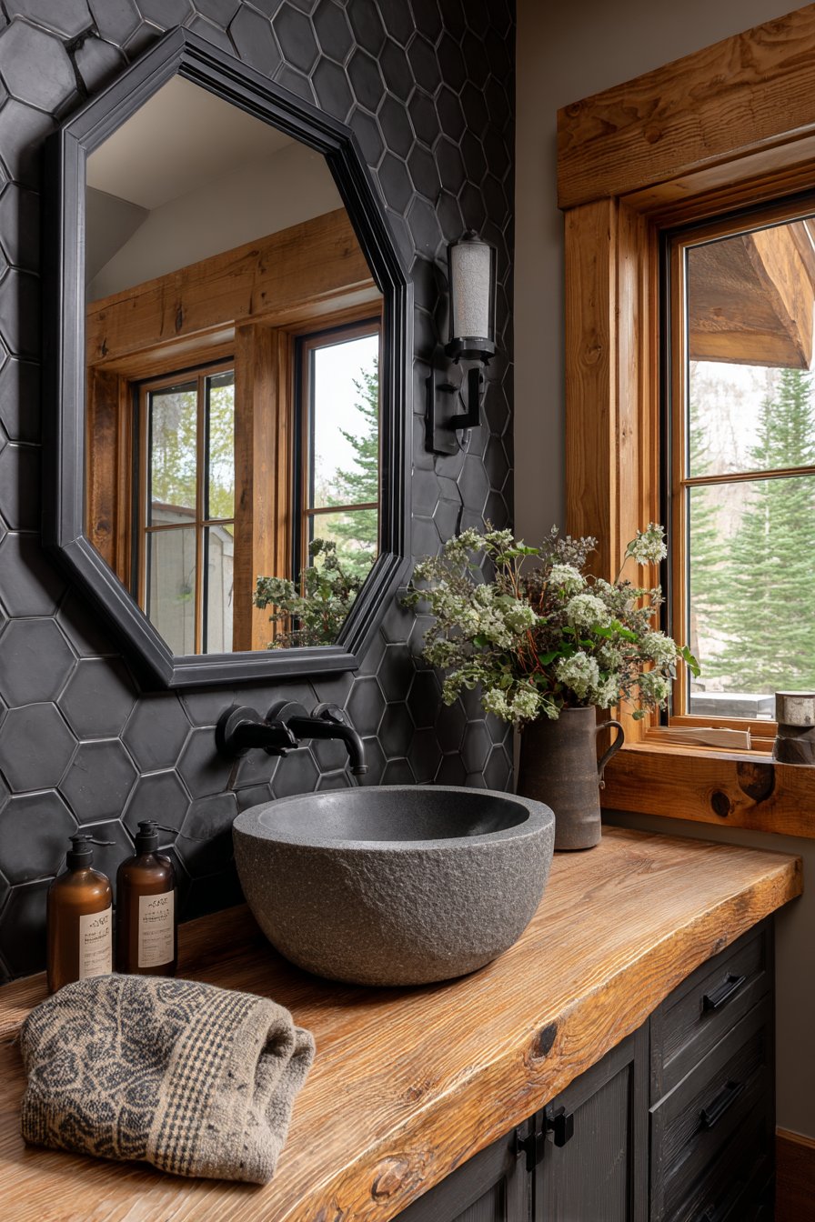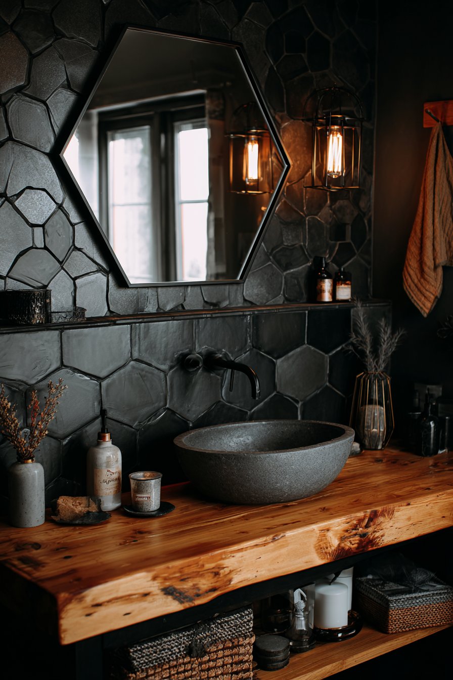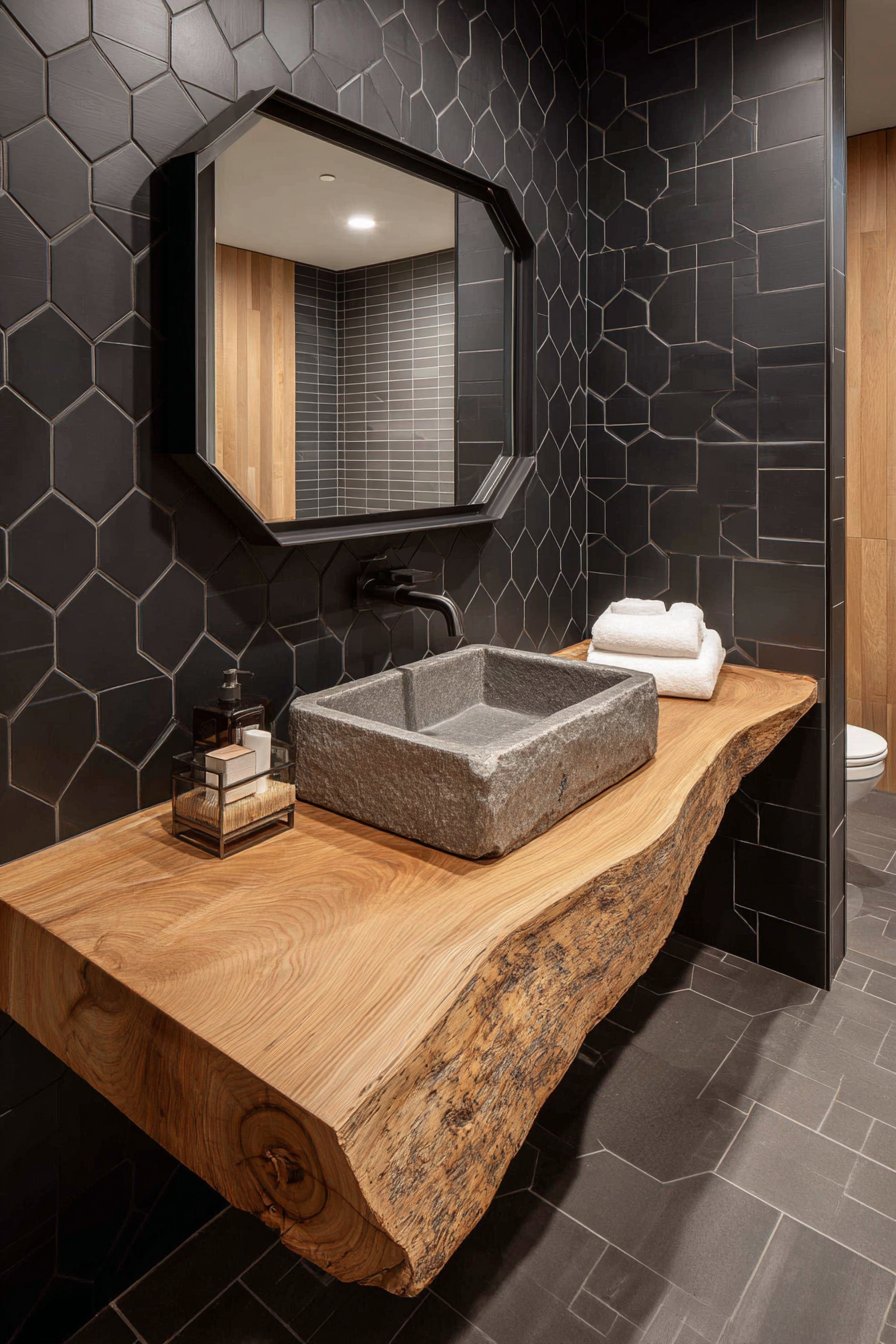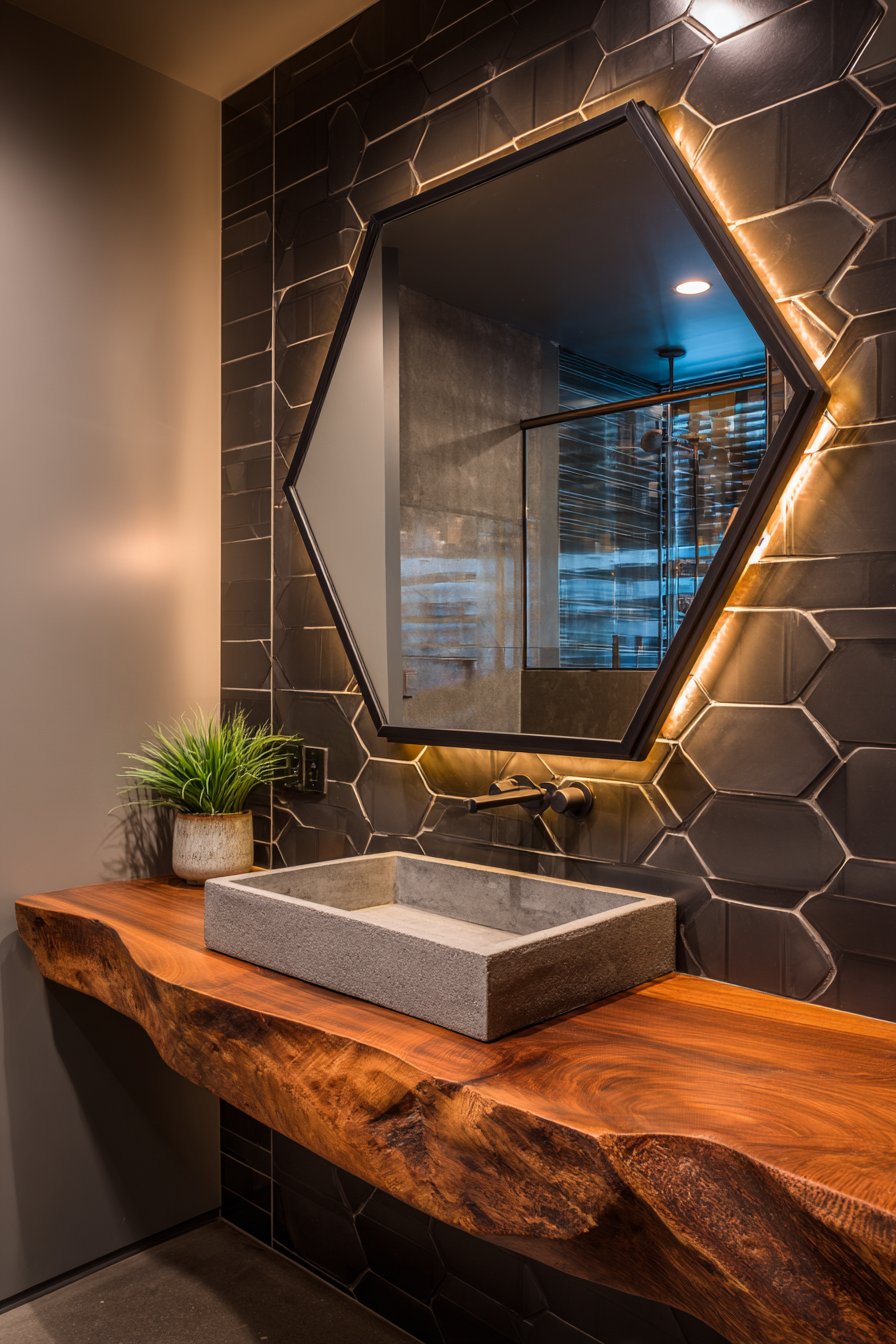 Key Design Tips: Ensure the hexagonal mirror is precisely level—even slight misalignment is obvious with geometric forms. Mount the mirror at appropriate height so its center serves functional reflection needs. Coordinate the black metal frame with black tile and other dark finishes for cohesive monochromatic scheme. Seal the live-edge wood vanity thoroughly against water damage while preserving its natural character. Position the concrete vessel sink to work with the live-edge wood’s irregular form. Consider the hexagon’s orientation carefully—corners pointing up and down create vertical emphasis while flat sides positioned horizontally feel more stable. Verify wall structure can support the substantial mirror and heavy vanity.