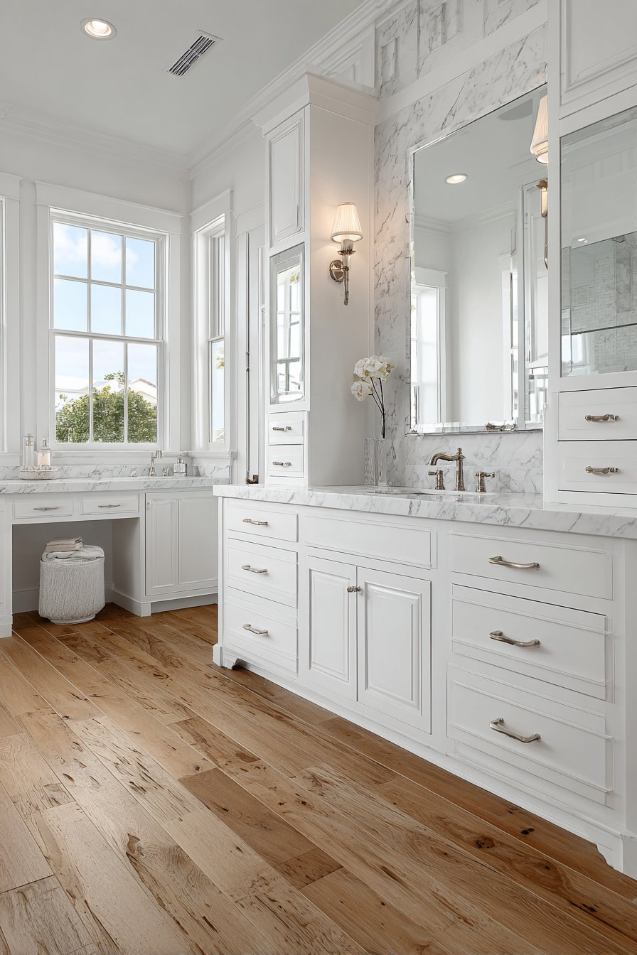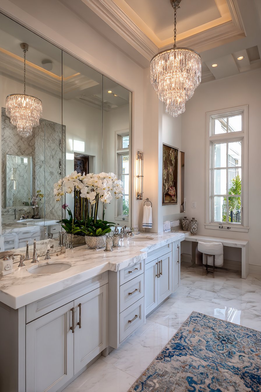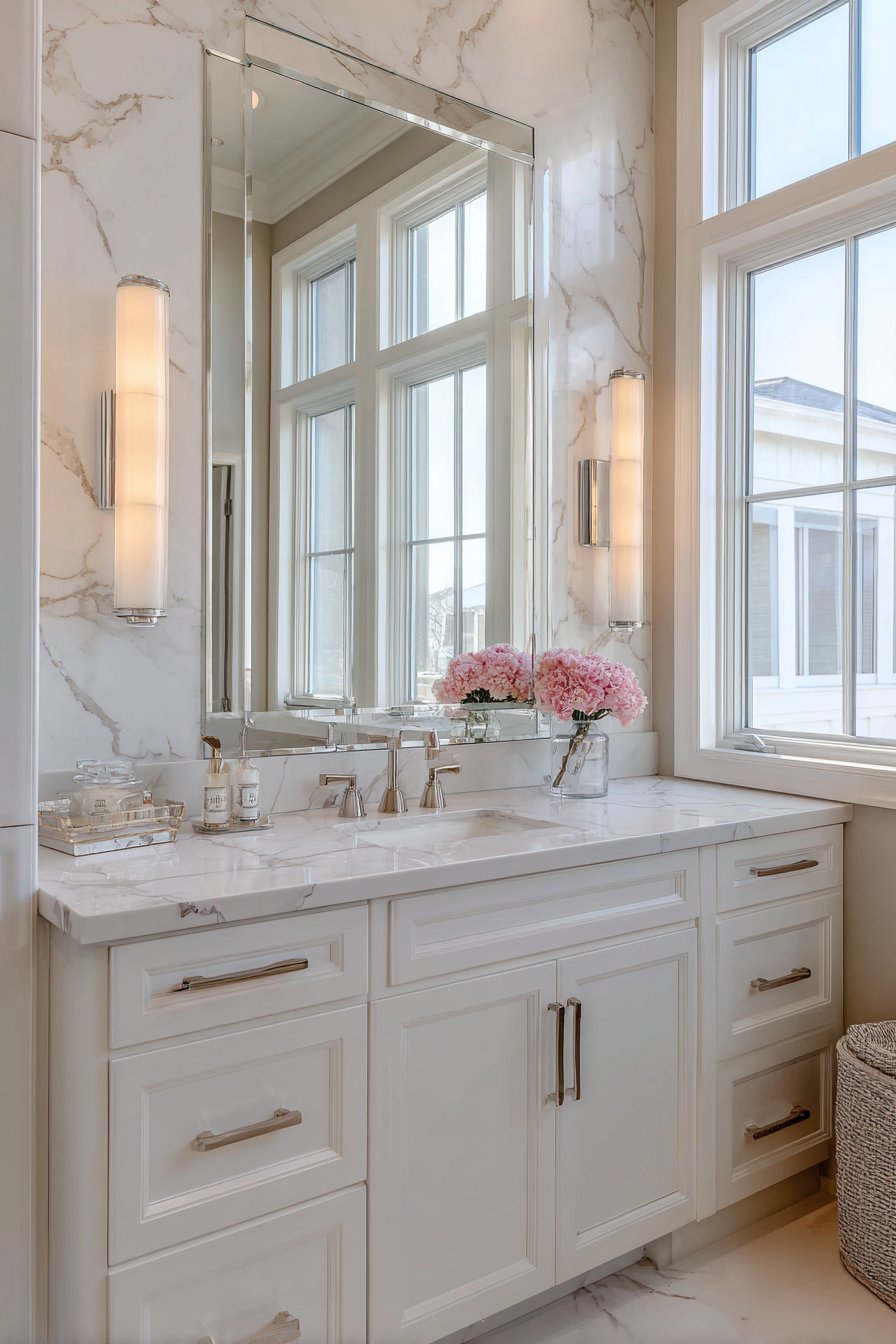 Interior design photography captures how the symmetrical arrangement creates visual harmony, with the reflected images creating a sense of infinite progression. The marble divider between mirrors serves as a grounding element, providing physical and visual separation while maintaining the overall composition’s unity. This large bathroom mirror idea works beautifully in traditional, transitional, and even contemporary bathrooms, demonstrating impressive versatility. The key is ensuring that all elements—mirrors, lighting, hardware, and vanity—are carefully proportioned and aligned to maintain the symmetry that makes this design work.