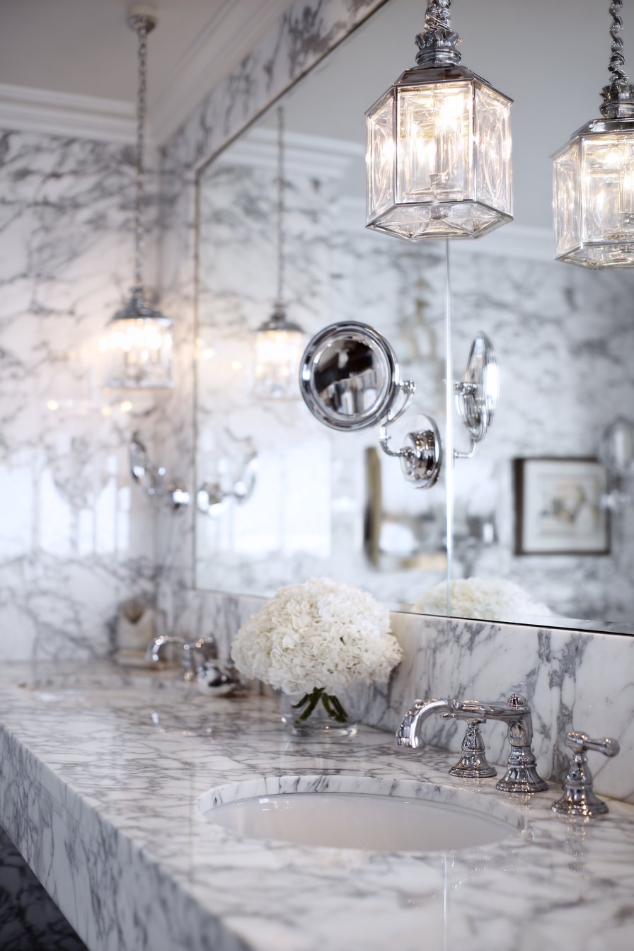 4. Dramatic Oversized Round Mirror with Marble Feature Wall