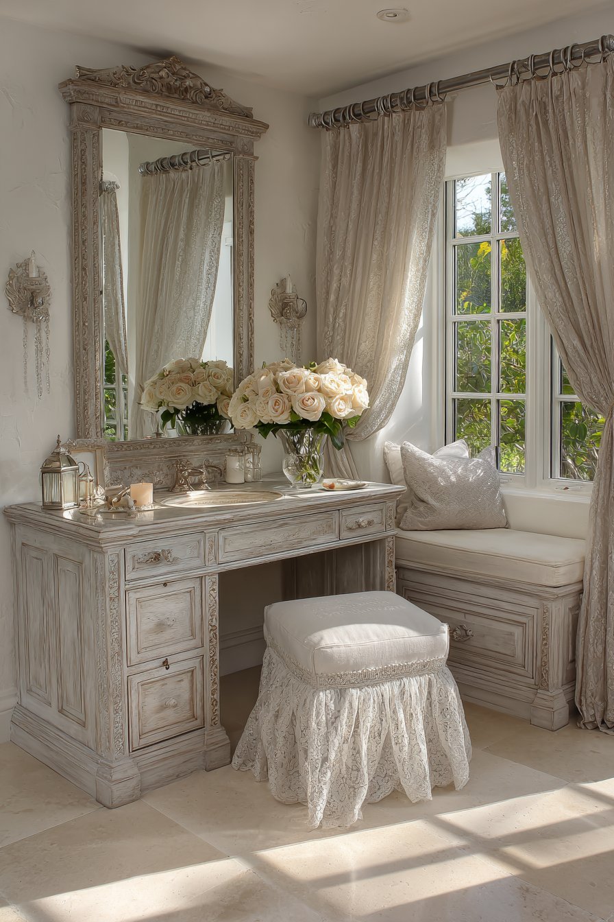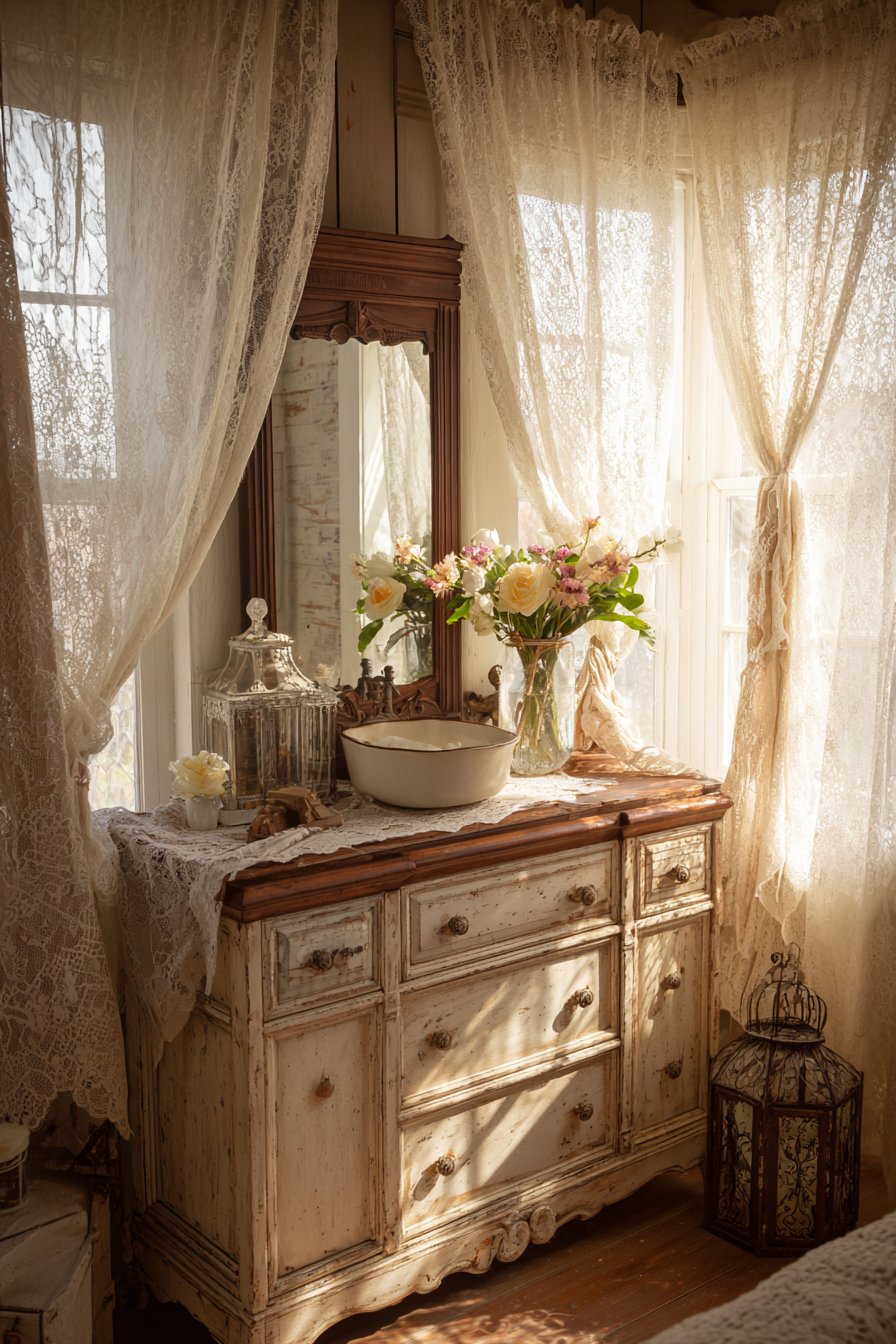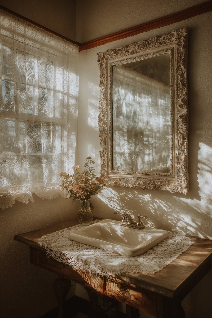 The whitewashed finish on the carved frame creates shabby-chic appeal that feels collected and loved rather than pristine and new. This treatment allows the frame’s ornate carving to remain visible and tactile while softening its visual impact, preventing it from overwhelming the space with excessive decoration. The repurposed dresser vanity reinforces the vintage aesthetic while demonstrating the creative reuse central to shabby-chic style—furniture pieces with previous lives in other rooms find new purpose in the bathroom, bringing their history and character along. The lace curtains complete the romantic picture, diffusing natural light into soft, flattering illumination.