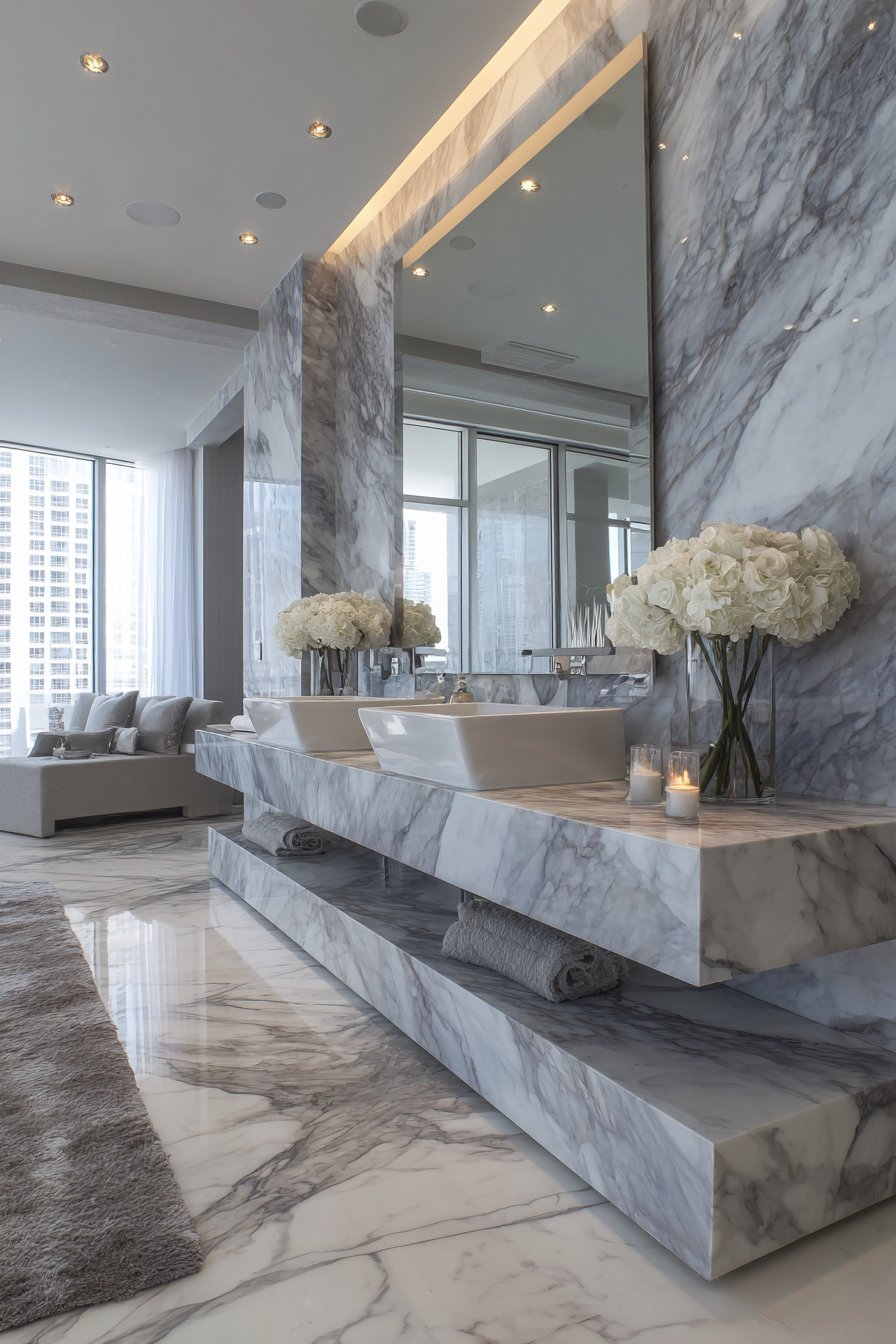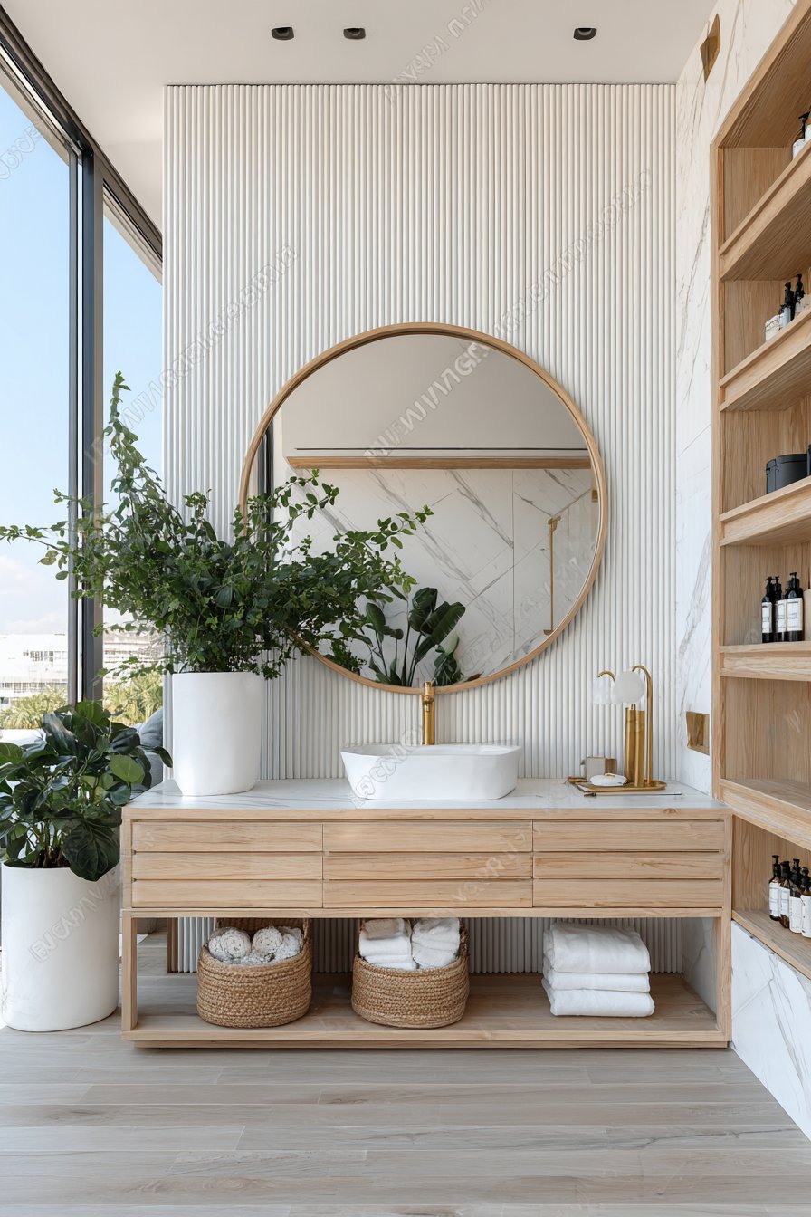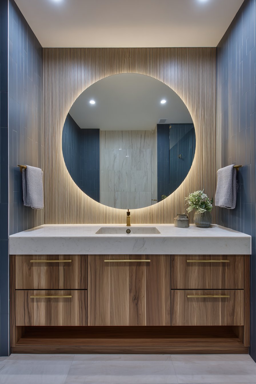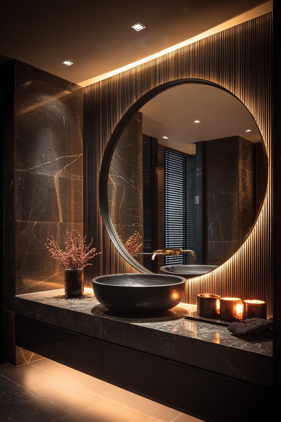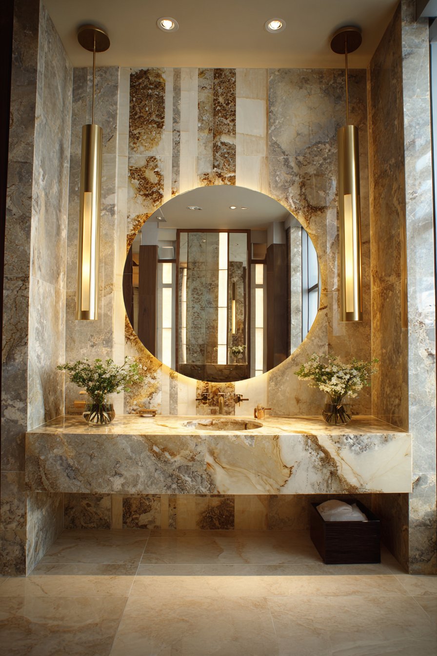 Wide-angle interior photography captures how this installation transforms the bathroom into a statement-making space where every element has been considered for maximum impact. The circular mirror’s reflection creates a portal-like effect, drawing viewers into the depths of the reflected space while the vertical marble slabs create strong architectural presence. This design approach requires confidence and commitment—it’s not a subtle solution, but rather an intentional choice to make the vanity area the bathroom’s undeniable focal point.