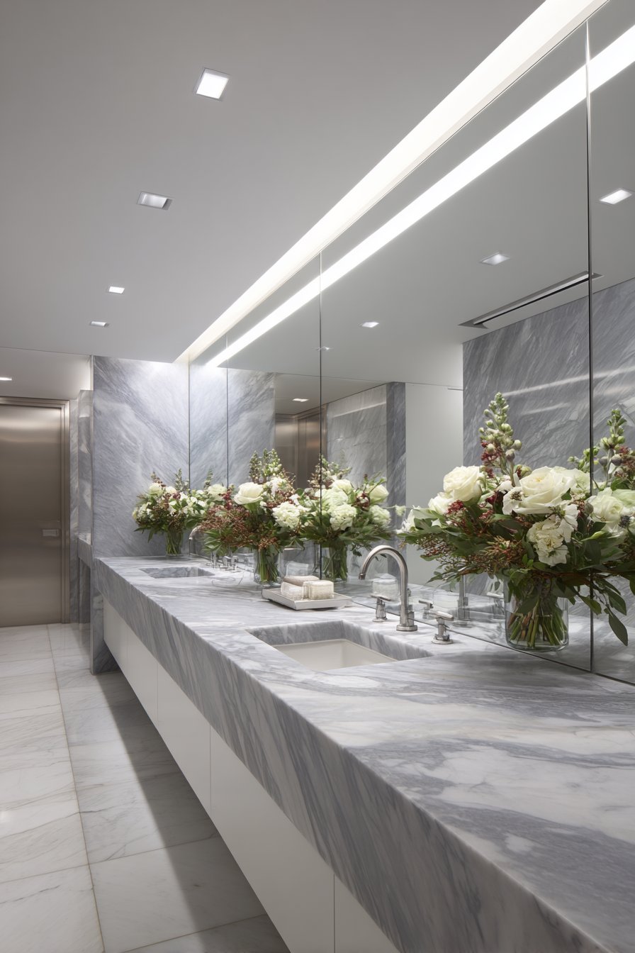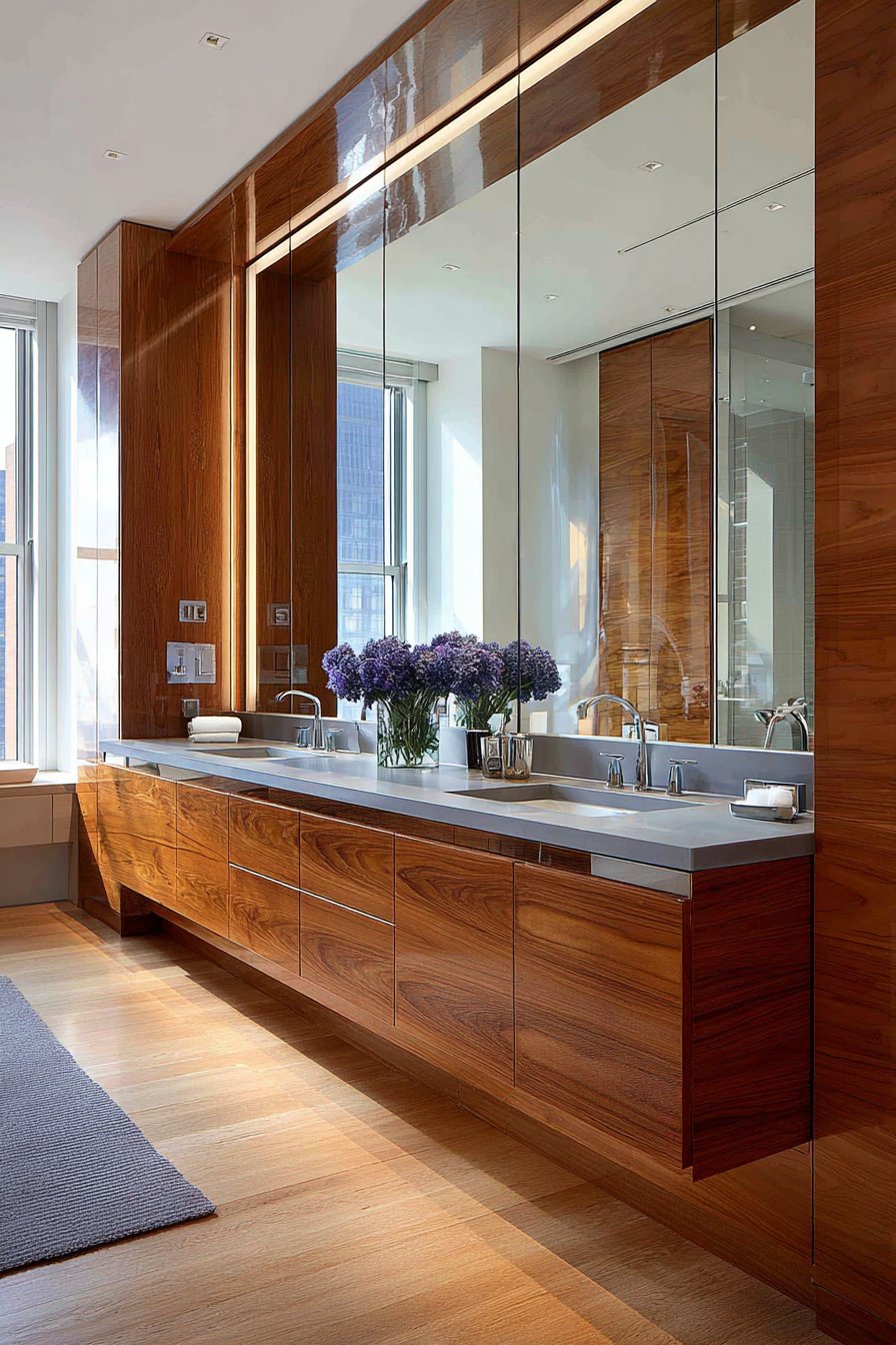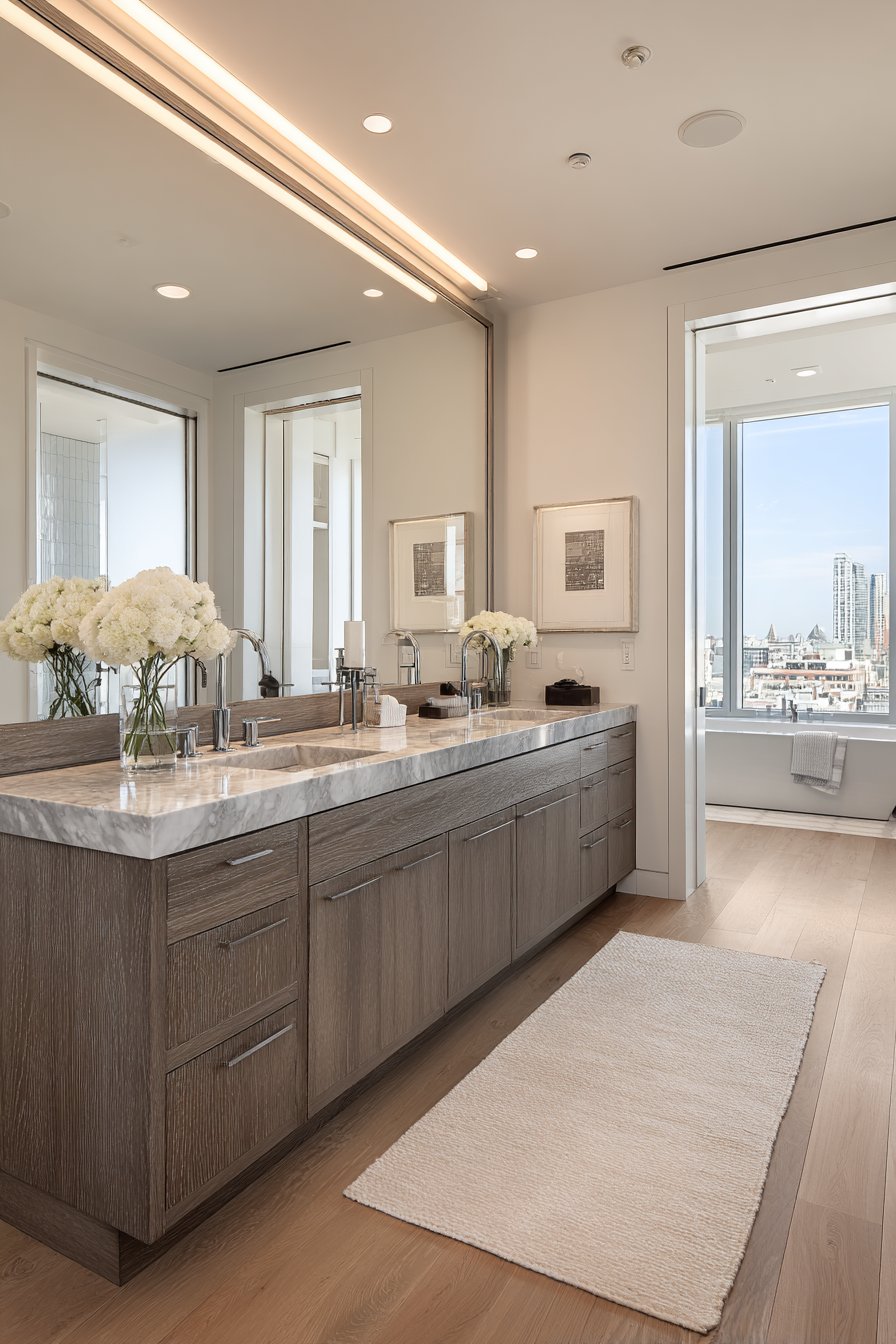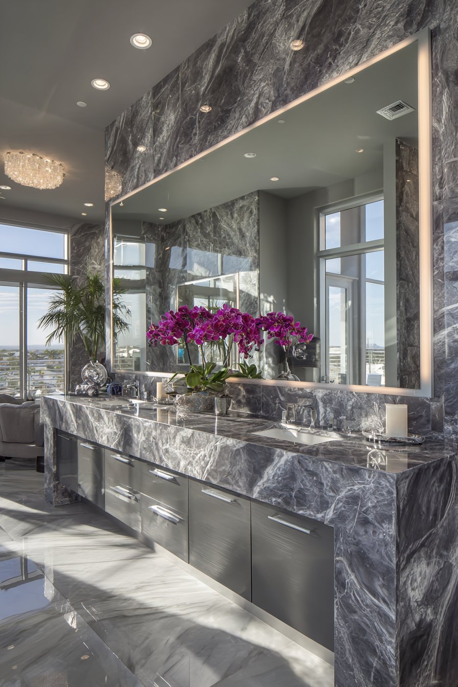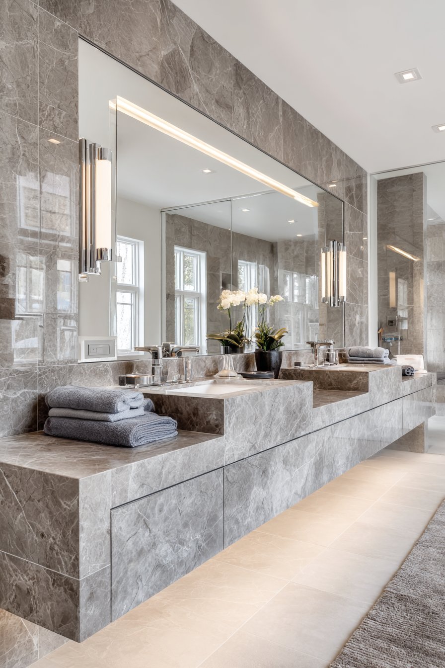 When bathroom real estate allows, this large bathroom mirror idea makes a dramatic statement through sheer horizontal expanse. A frameless rectangular mirror extends the full width of a ten-foot vanity, creating a continuous reflective surface that transforms the entire wall into one uninterrupted plane of reflection. This bold approach to mirror installation emphasizes width over height, creating a cinematic, gallery-like quality that feels both sophisticated and unexpected. The integrated horizontal LED lighting behind the mirror’s top edge provides even illumination across the entire span, eliminating shadows while creating a subtle floating effect. Below, the vanity features gray-veined marble and polished chrome fixtures that catch and reflect light.