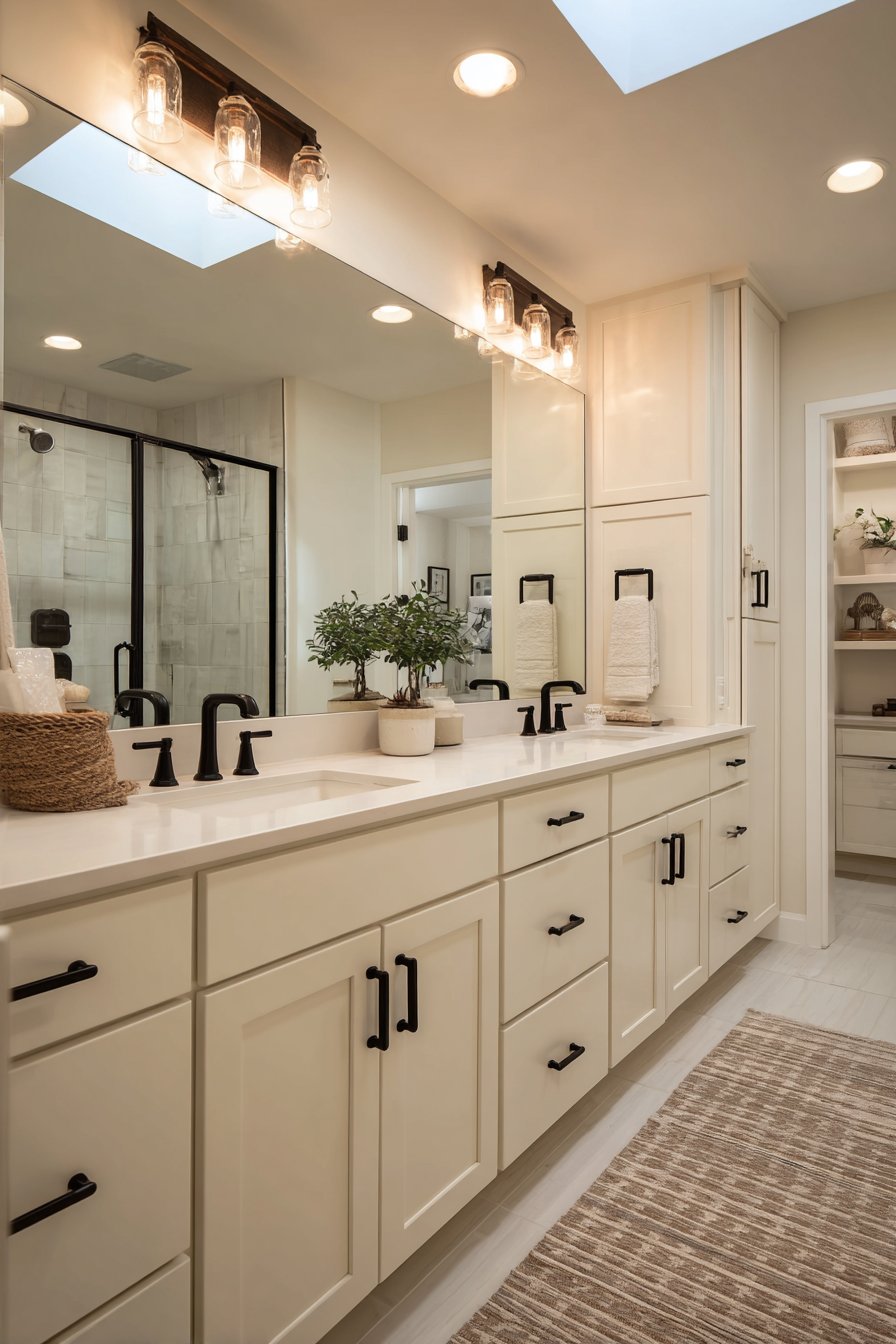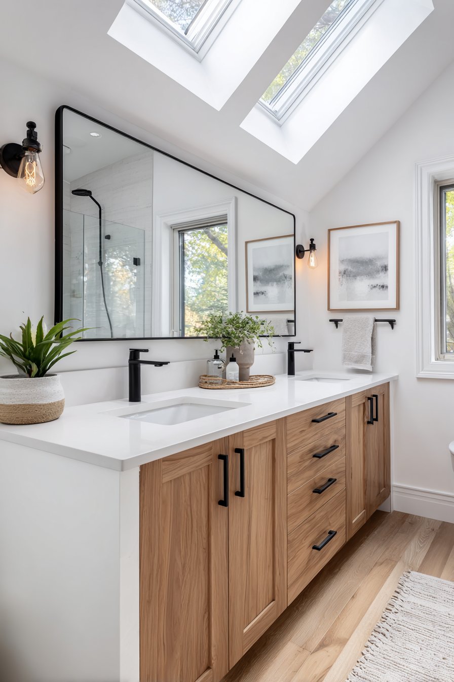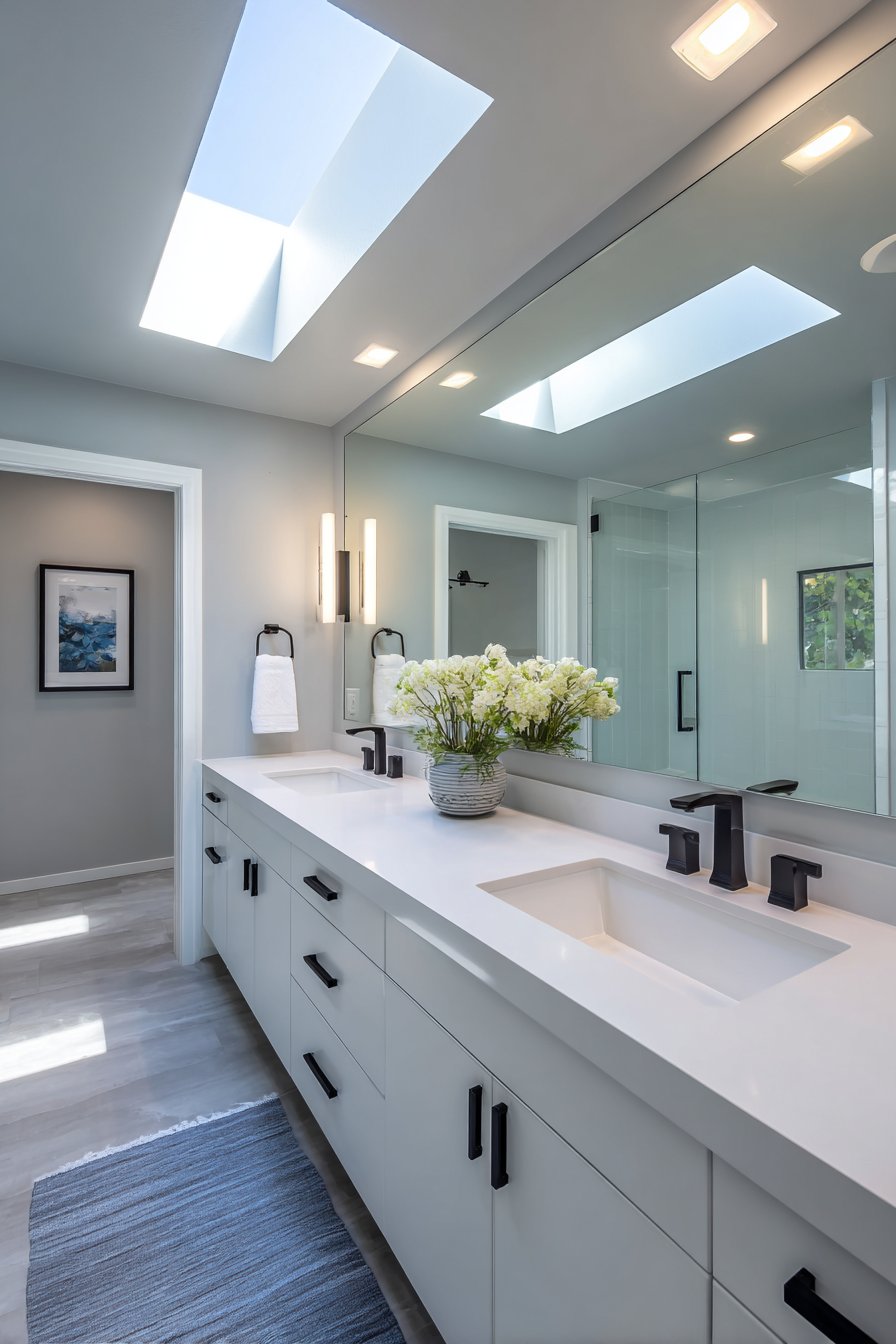 This sophisticated large bathroom mirror idea represents the ultimate in spatial manipulation through reflective surfaces. A full-height frameless mirror panel, installed from countertop to ceiling, creates an uninterrupted vertical plane of reflection above a minimalist floating vanity. What elevates this design from merely impressive to genuinely transformative is its strategic relationship with skylights positioned above—the mirror captures and reflects this natural overhead lighting, effectively doubling its impact and flooding the bathroom with bright, natural illumination throughout the day. The matte black hardware and crisp white cabinetry create high-contrast punctuation points against the mirror’s reflective neutrality.