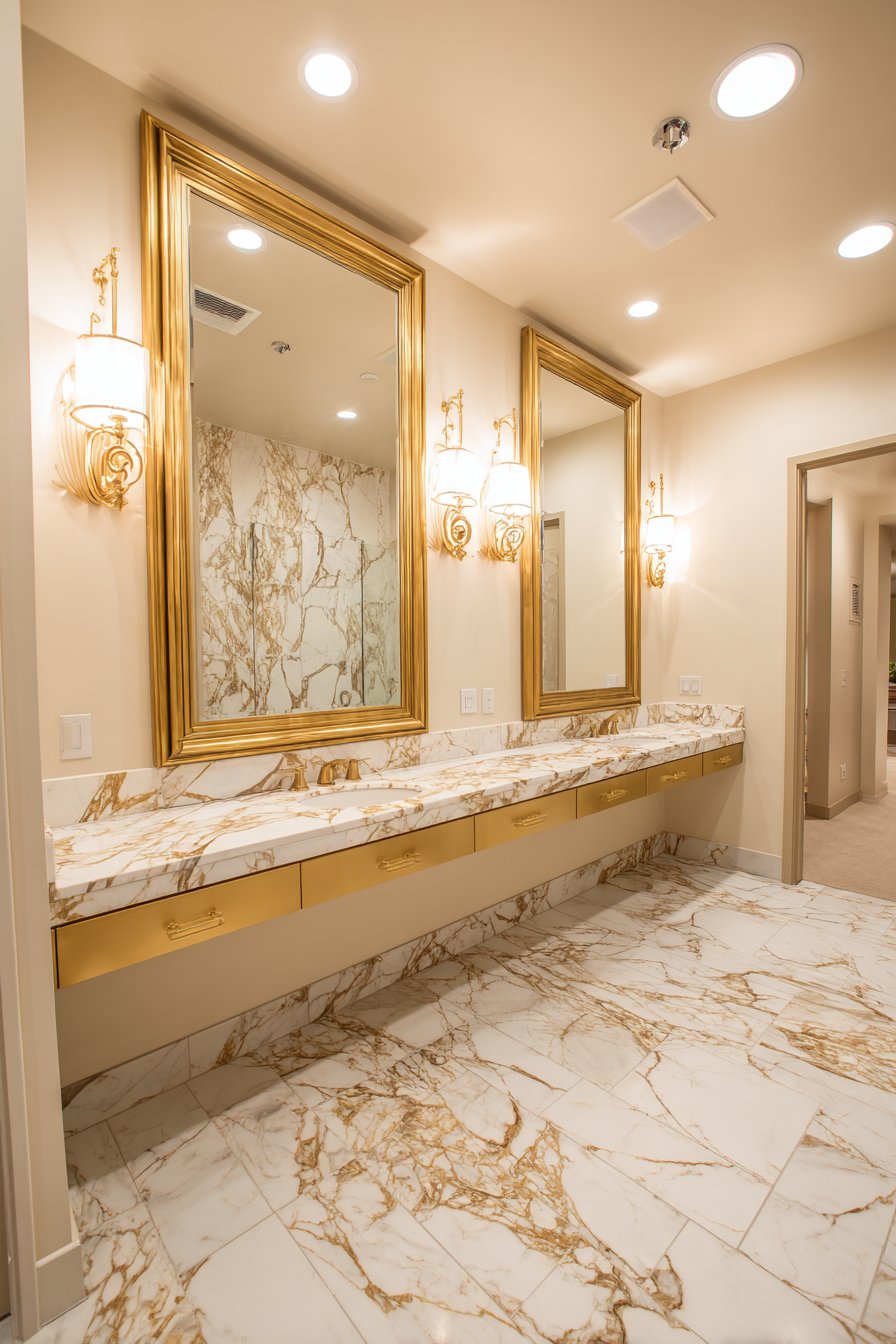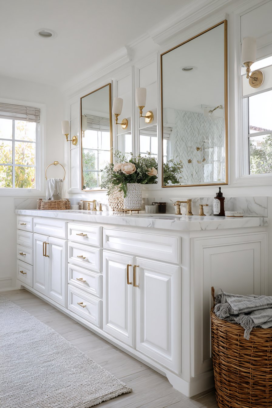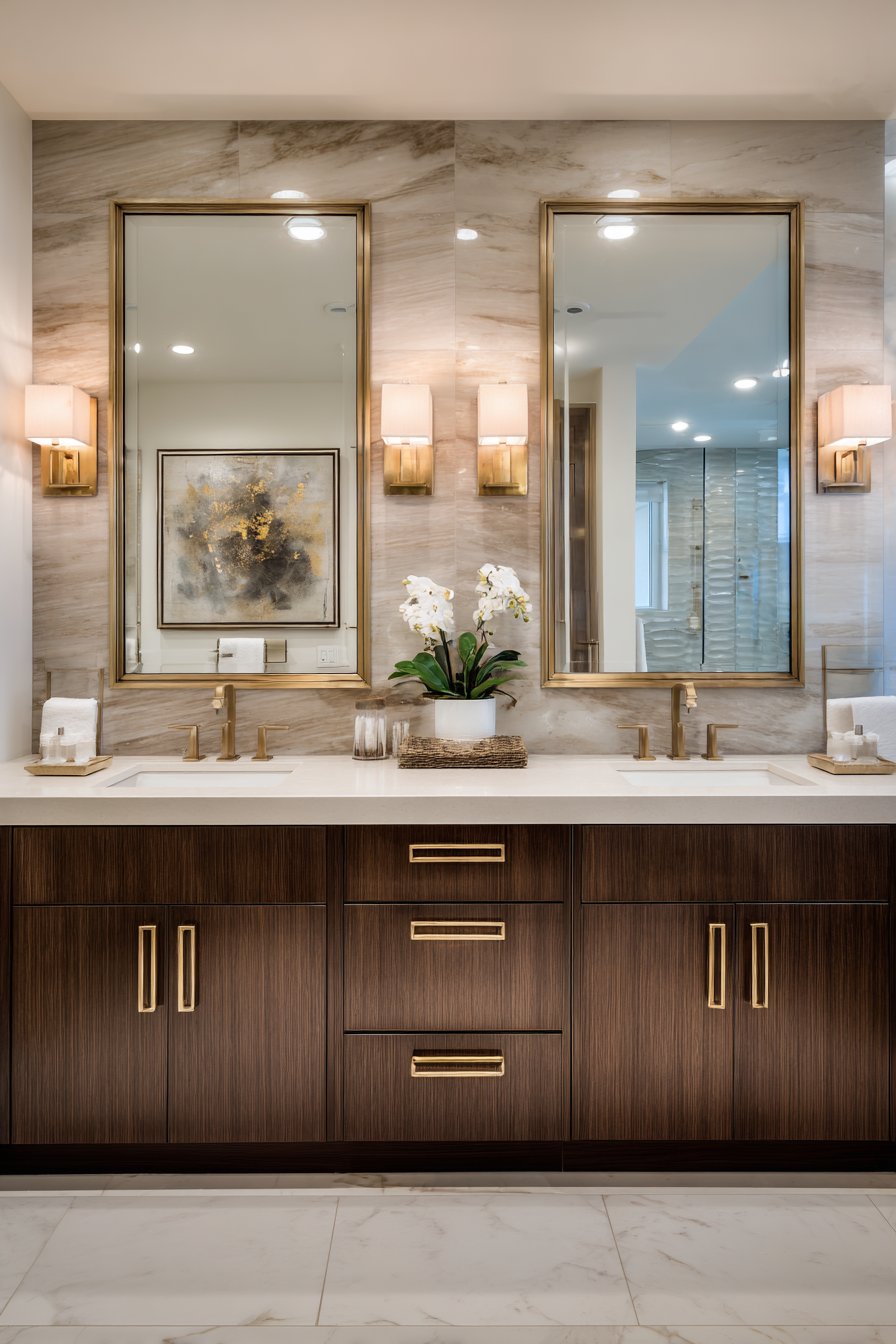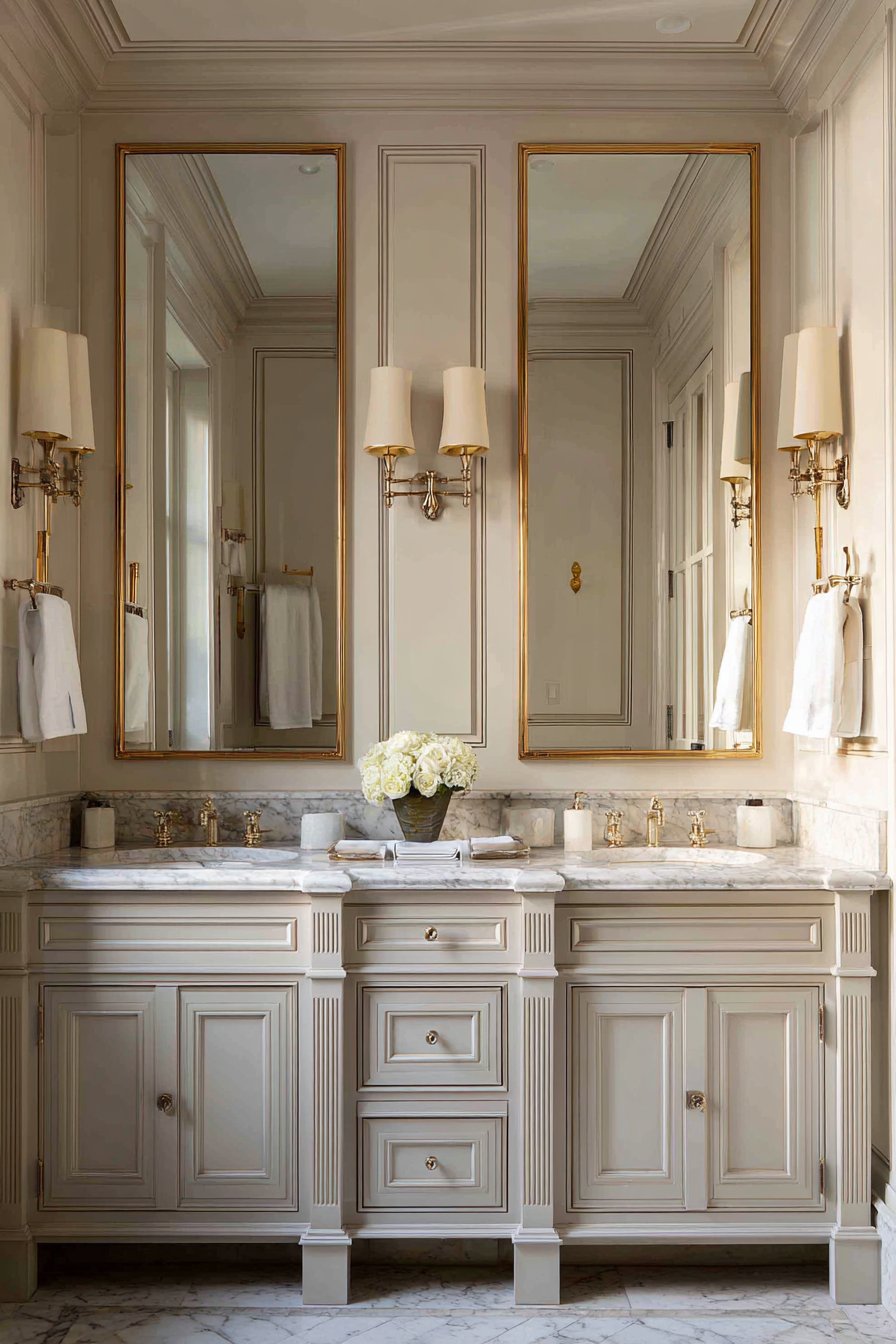 This design approach speaks to classical principles of proportion and balance while incorporating contemporary scale and materials. The dual-mirror configuration offers practical advantages for shared bathrooms—each person has their own defined space with dedicated lighting, reducing morning congestion and conflicts. The gold frames add warmth and glamour, elevating the design from simply functional to genuinely luxurious. When properly proportioned and positioned, the twin mirrors create a sense of order and intentionality that feels calm and organized, qualities particularly valuable in bathrooms that serve as morning preparation spaces.