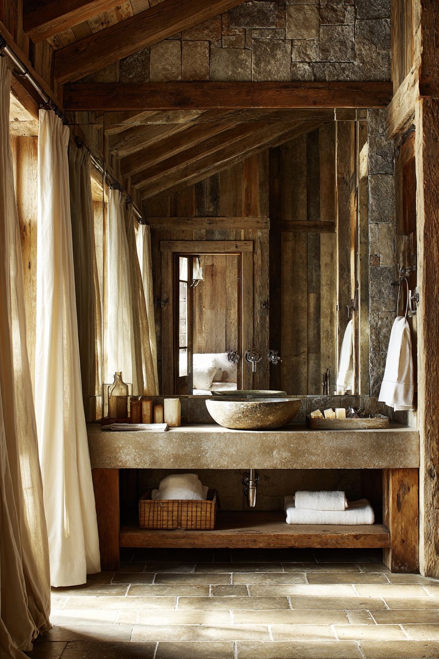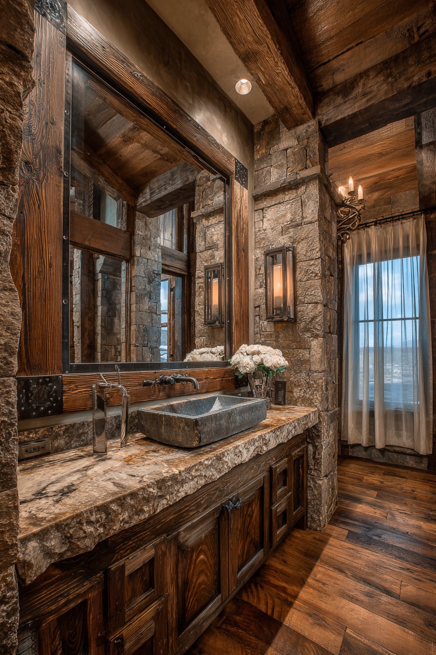 For those drawn to vintage character and authentic patina, this large bathroom mirror idea offers a compelling alternative to pristine contemporary designs. An expansive antiqued mirror featuring subtle foxing—those characteristic dark spots that develop on aging mirrors—and appropriate patina is mounted in a substantial frame crafted from reclaimed wood. The weathered wood shows authentic wear patterns, nail holes, and color variations that speak to its previous life, perhaps as barn siding or industrial flooring. This substantial mirror complements a rustic bathroom featuring exposed beam ceiling and a stone vessel sink, creating a cohesive aesthetic that celebrates natural materials and time-worn beauty.