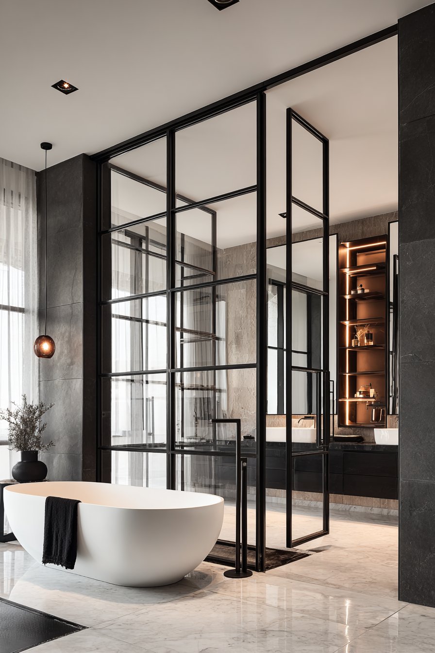 The window-like quality of this mirror arrangement creates fascinating spatial ambiguity—at first glance, it can read as actual windows opening to another space, only revealing its true reflective nature upon closer examination. This playful visual trick adds depth and intrigue to the bathroom design. The vertical emphasis of the tall, narrow panels draws the eye upward, emphasizing ceiling height and creating a sense of grandeur even in modestly proportioned rooms. The bronze mullions catch light beautifully, their warm metallic finish providing subtle contrast against the mirror’s cool reflectivity and adding a touch of luxury without overwhelming the design.