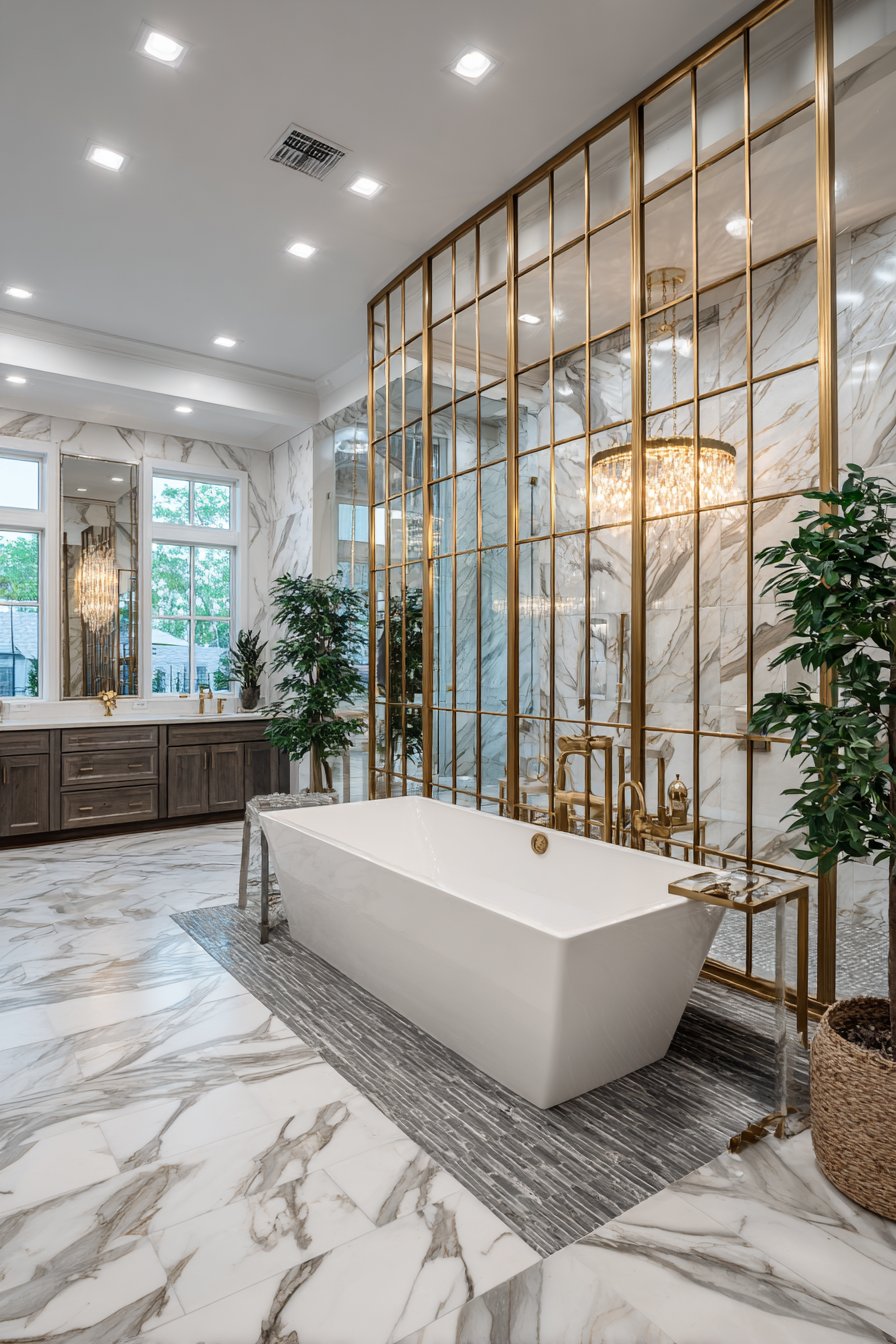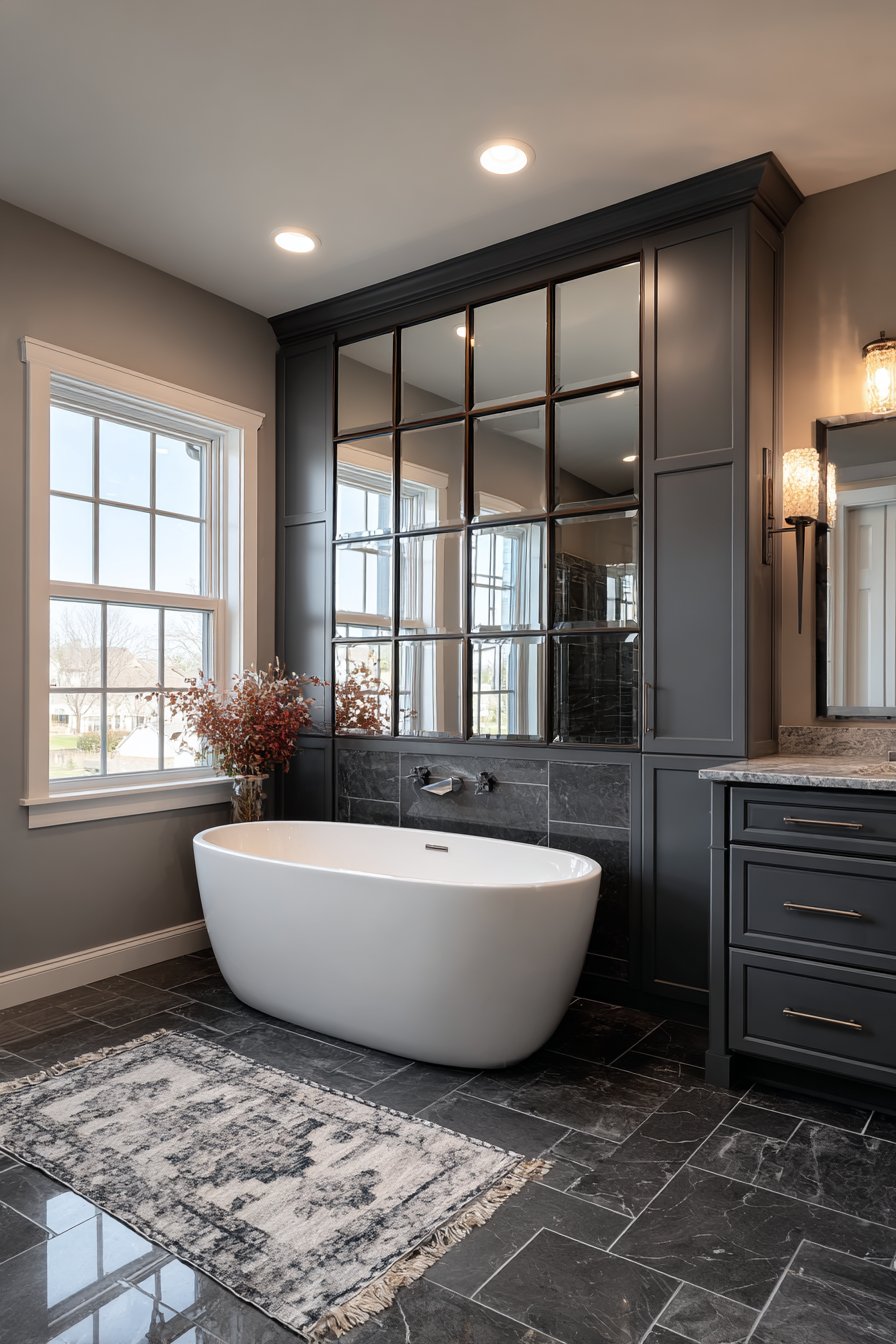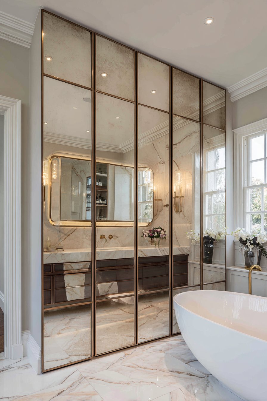 Drawing inspiration from traditional window design, this sophisticated large bathroom mirror idea features a floor-to-ceiling triptych arrangement where three tall vertical mirror panels are separated by slim bronze mullions. Each panel measures approximately seven feet in height, and together they create a window-like effect that adds architectural gravitas to the bathroom. The bronze mullions provide subtle definition without heavy visual weight, allowing the mirrors to function as a unified composition while maintaining individual identity. This installation reflects a thoughtfully designed bathroom featuring a freestanding tub and marble flooring, the reflection creating layers of visual complexity and interest.