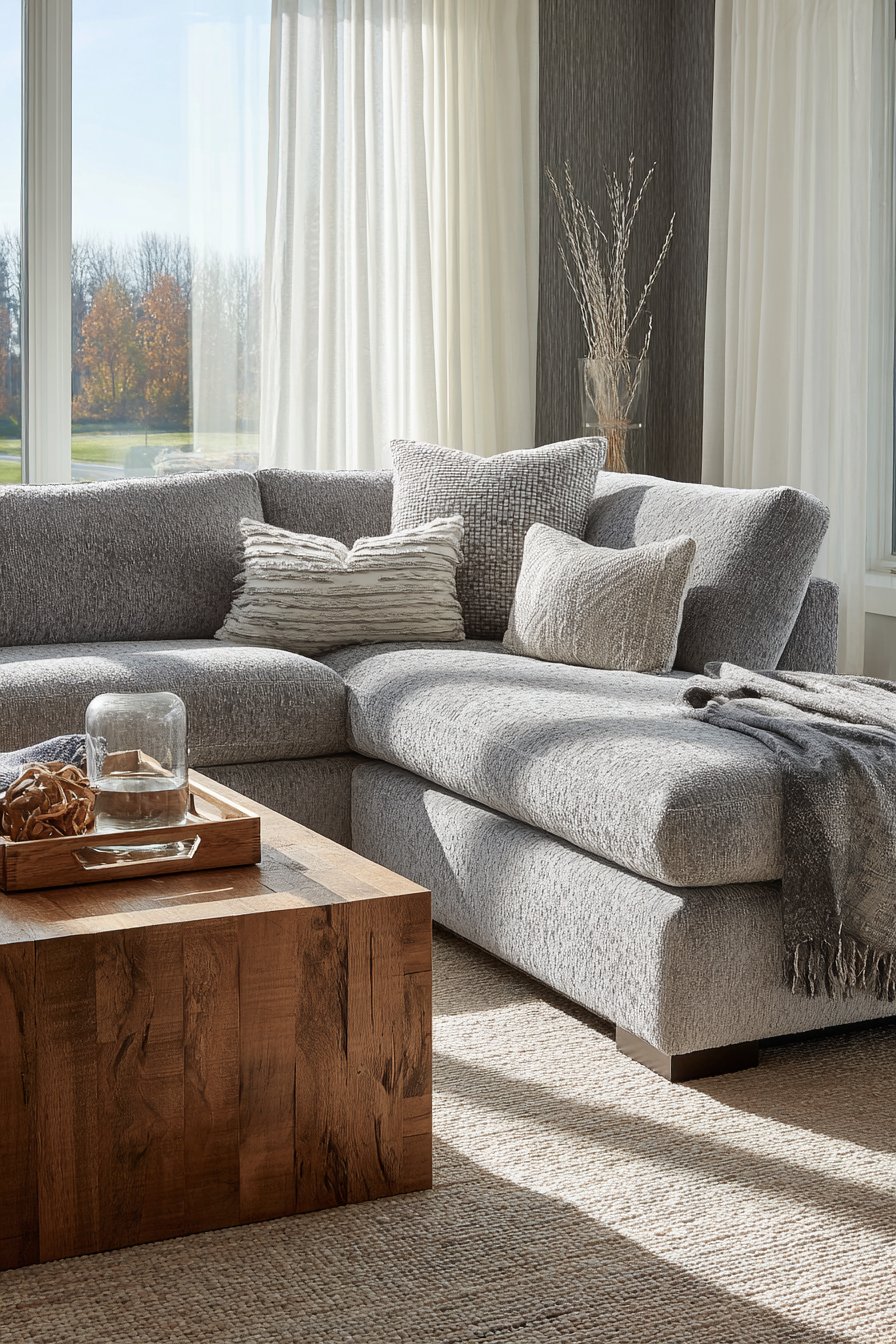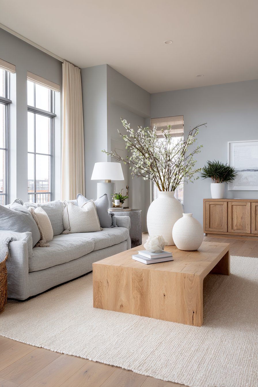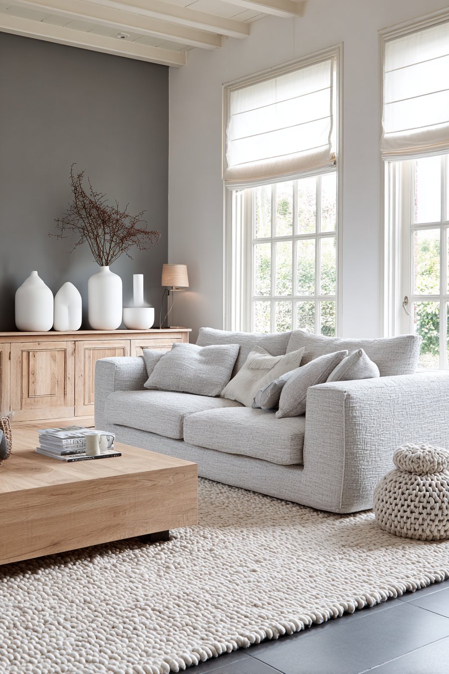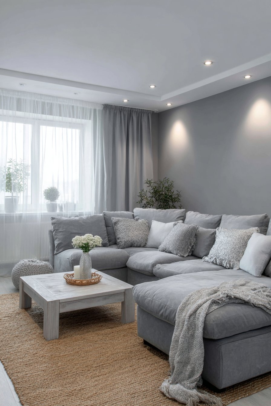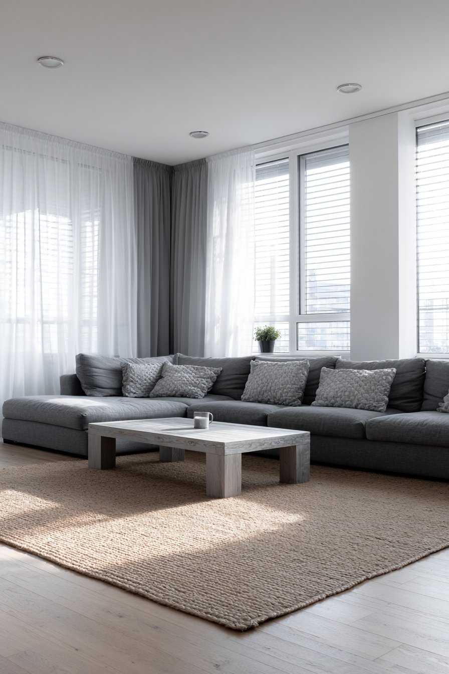 Natural materials ground this grey living room color idea and prevent it from feeling cold or sterile. A natural jute area rug introduces organic texture underfoot, while a whitewashed oak coffee table brings warmth through its blonde wood tones and visible grain patterns. Floor-to-ceiling sheer curtains filter natural light beautifully, creating soft shadows that emphasize the tonal depth of the grey palette throughout the day. The way sunlight moves across these varied grey surfaces creates an ever-changing landscape of subtle color variations.