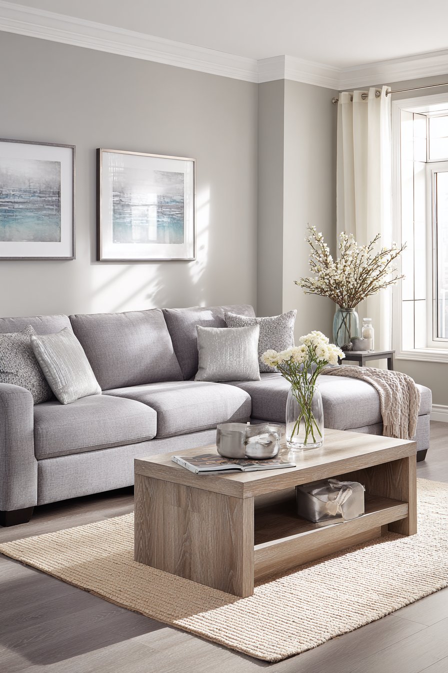 A living room designed around varying shades of grey creates an unexpectedly sophisticated and calming environment that proves neutrals are anything but boring. This monochromatic approach to living room color ideas demonstrates how a single color family, when thoughtfully layered, can produce remarkable depth and visual interest. The space features a plush grey sectional sofa that anchors the room, upholstered in a textured fabric that catches light differently throughout the day. Textured throw pillows in silver and pewter add subtle variation while maintaining the cohesive color story.