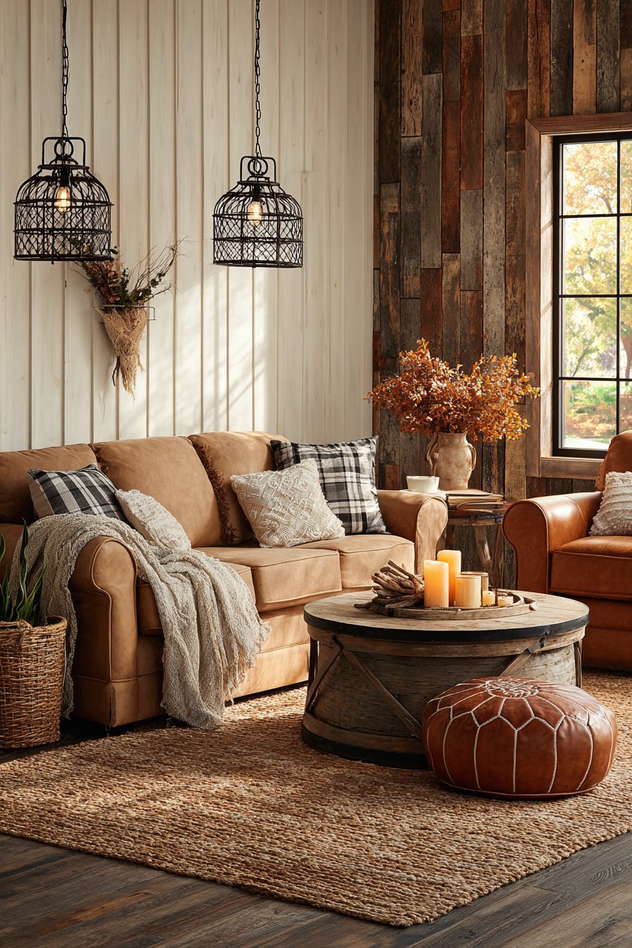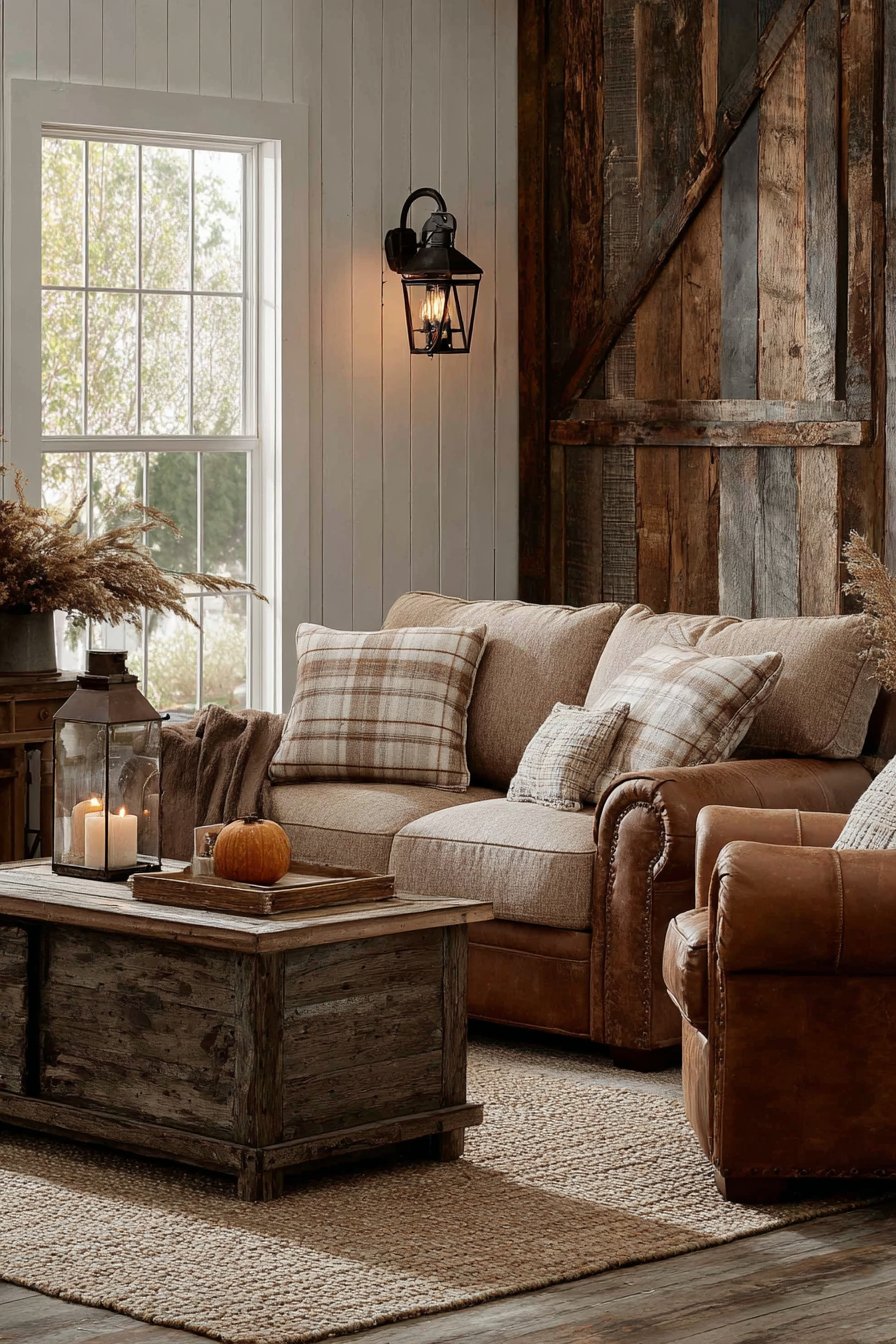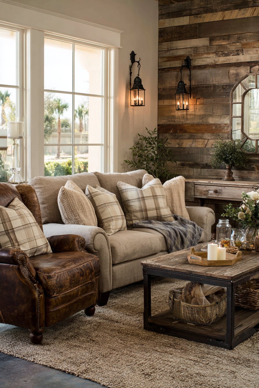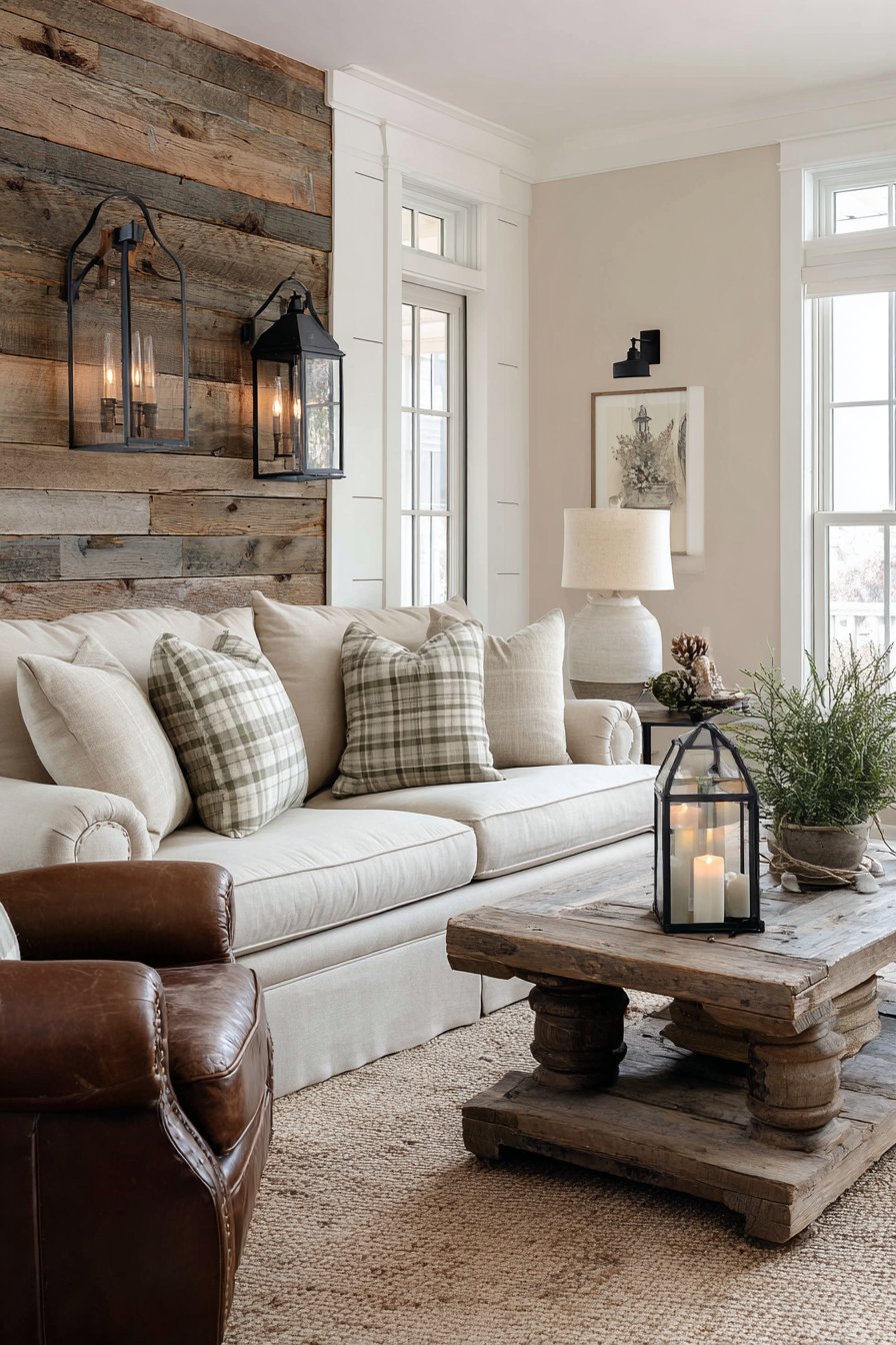 The reclaimed barn wood accent wall adds textural depth in natural brown tones, bringing authentic rustic character that can’t be replicated through paint alone. These weathered boards with their varied patina and natural aging demonstrate how material choices reinforce living room color ideas. The distressed leather armchair in cognac and weathered wood coffee table enhance the rustic palette while adding essential worn character that makes farmhouse style feel genuine rather than staged.
