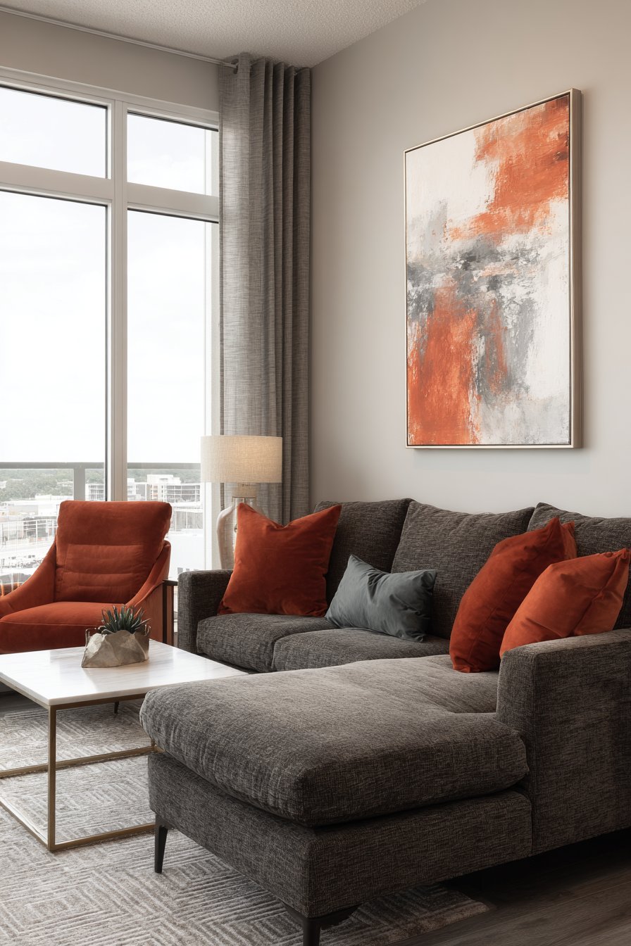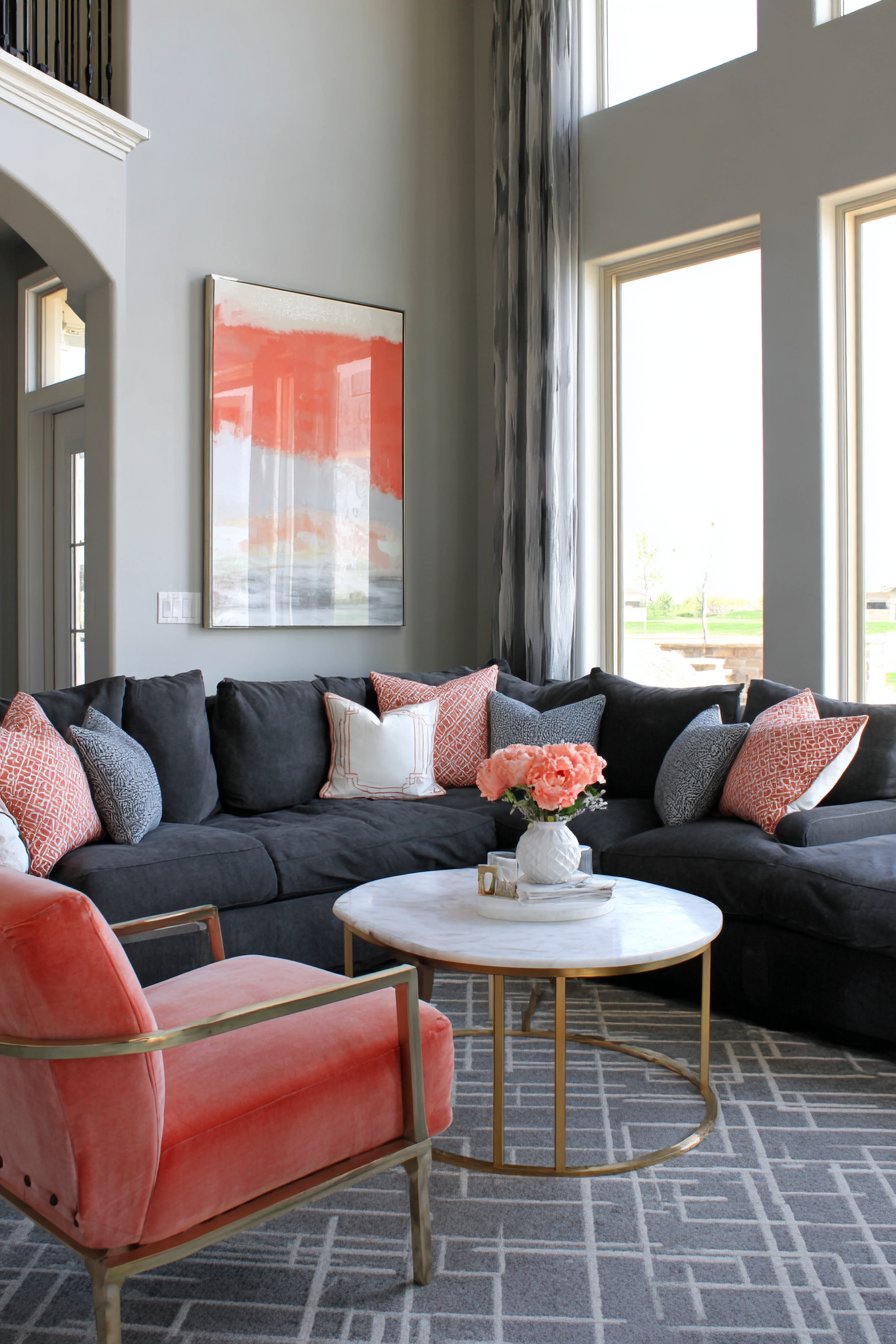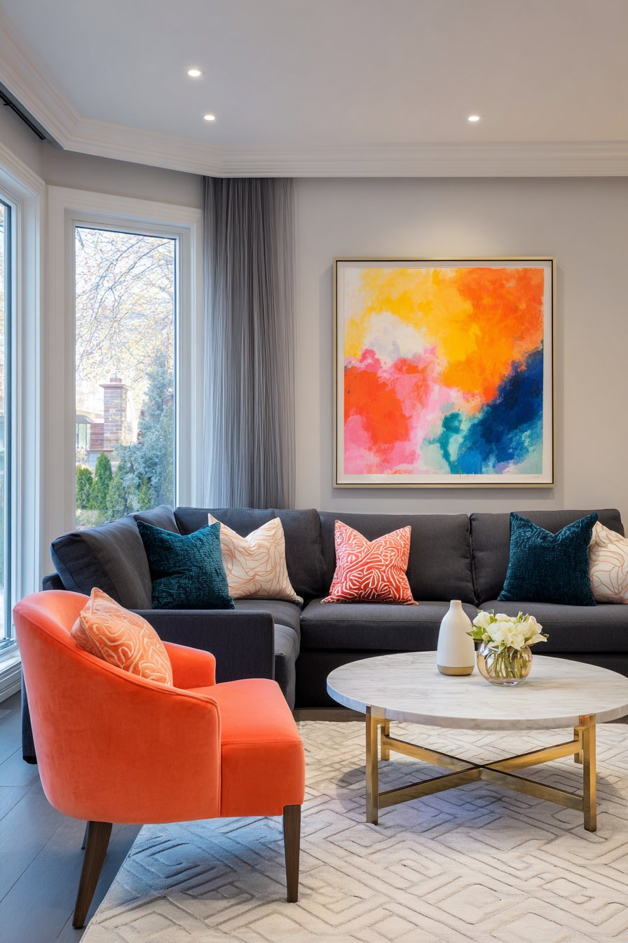 Modern living room color ideas that pair a neutral charcoal base with vibrant coral and teal accents create sophisticated spaces with controlled pops of energizing color. This approach demonstrates the power of the 60-30-10 color rule, using neutral charcoal as the foundation while carefully introducing bold accent colors for impact. The charcoal grey sectional with clean, contemporary lines anchors the space against light grey walls, creating a layered neutral foundation that prevents the accent colors from overwhelming.