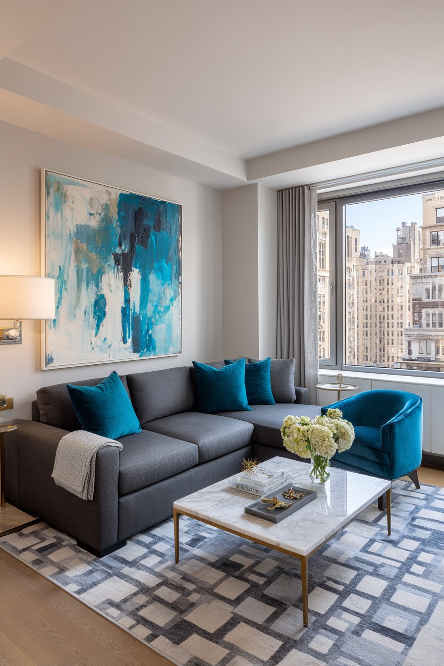 The coral velvet accent chair creates a warm, vibrant focal point while the teal throw pillows introduce cool color balance, demonstrating how living room color ideas can successfully incorporate both warm and cool accent tones when grounded by neutral foundations. Abstract art above the sofa incorporates all three colors in bold brushstrokes, serving as the color story’s blueprint and tying the scheme together visually. The white marble coffee table with brass legs adds elegance and light reflection while maintaining the contemporary aesthetic.