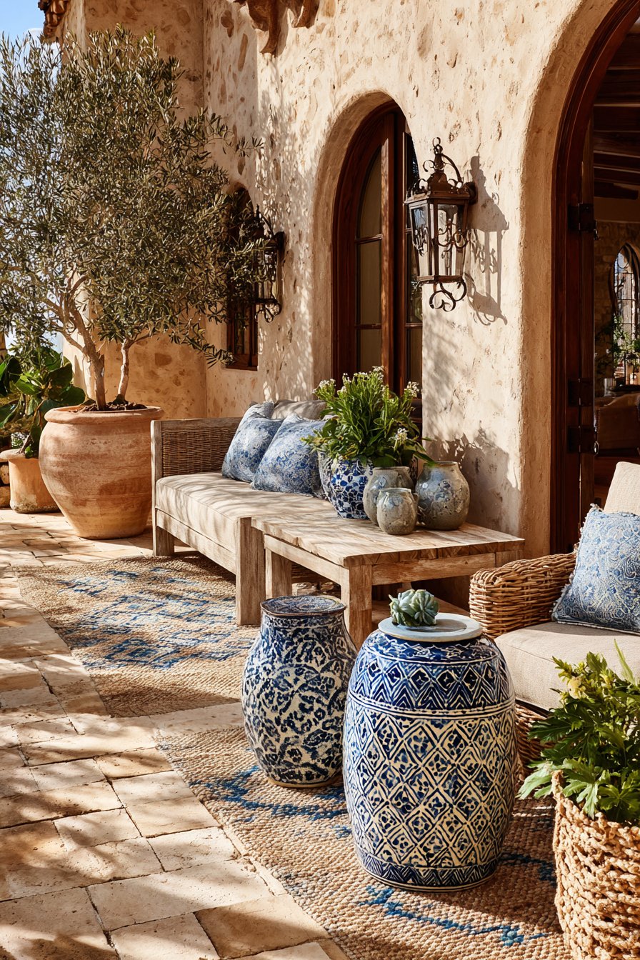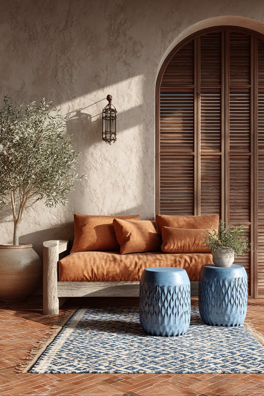 Azure blue ceramic garden stools serving as side tables make a bold statement while echoing traditional Mediterranean tiles and pottery. These vibrant blue accents against the warm terracotta and beige create the characteristic color contrast found throughout Mediterranean regions. The woven area rug in natural fibers with blue and terracotta geometric patterns anchors the space while reinforcing the color story through traditional Mediterranean motifs.