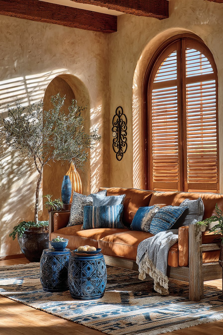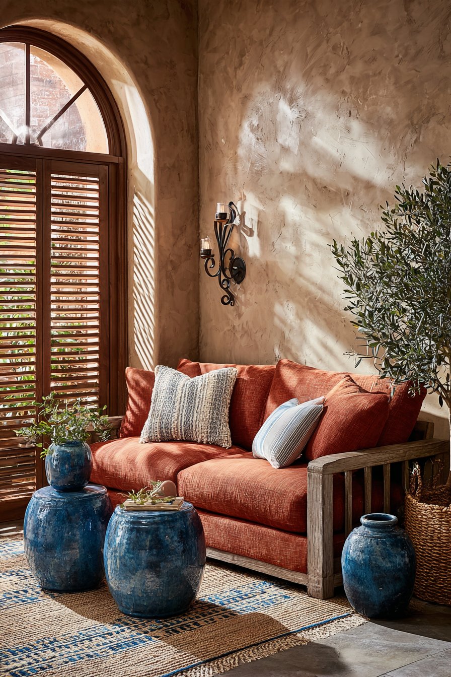 Arched doorway and wrought iron wall sconces add essential architectural and decorative details that enhance the Mediterranean character beyond just color choices. Potted olive tree and ceramic vases in blue and terracotta reinforce the connection to Mediterranean landscapes where these elements occur naturally. Natural sunlight through wooden shutters creates dappled shadows that add to the sun-drenched atmosphere central to Mediterranean living room color ideas.