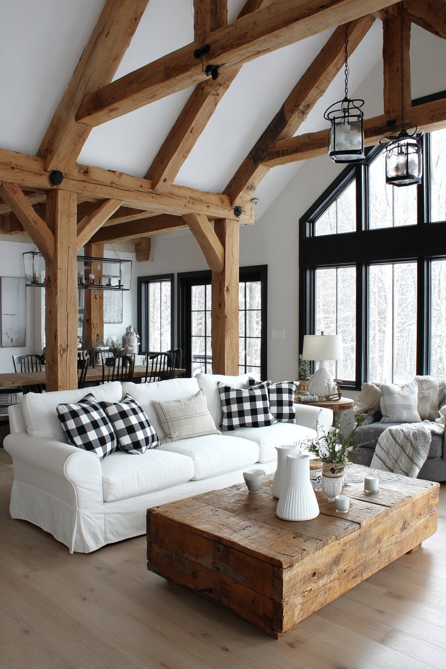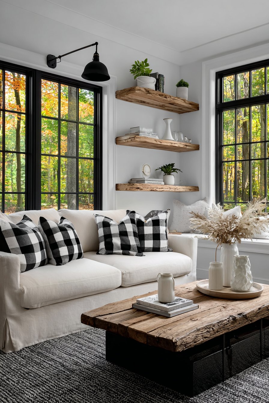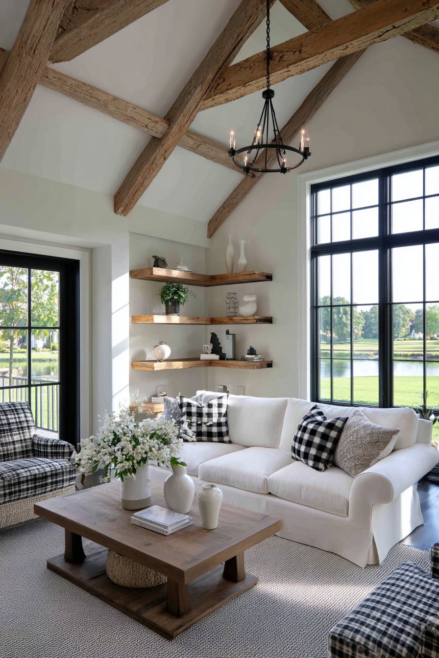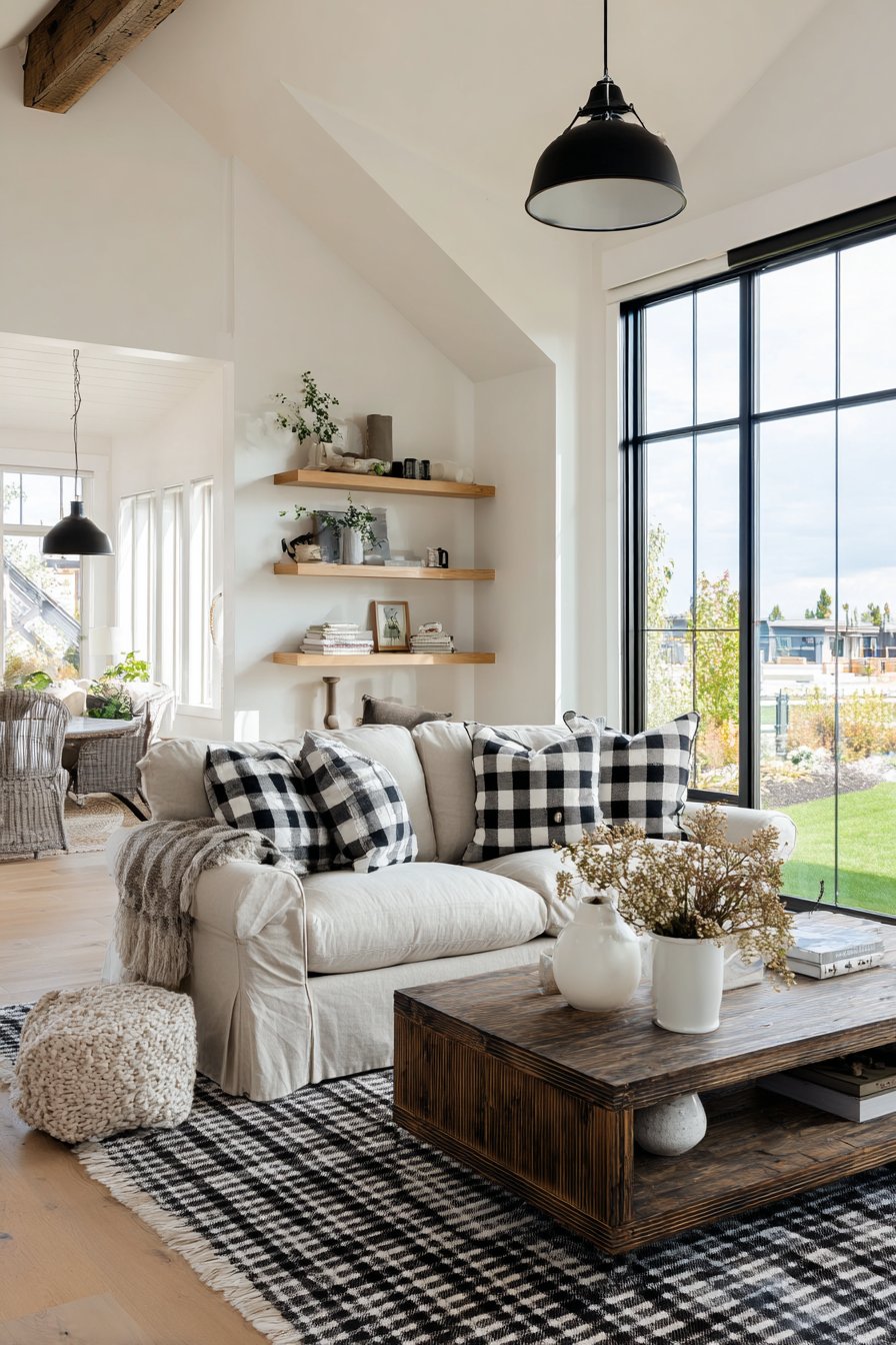 Black window frames and black metal pendant lights create striking graphic contrast that gives this farmhouse living room color idea contemporary edge. This confident use of black as accent rather than just supporting detail distinguishes modern farmhouse from purely traditional country style. The chunky reclaimed wood coffee table and floating shelves in natural oak add essential warmth and organic texture that prevents the black and white palette from feeling too stark.