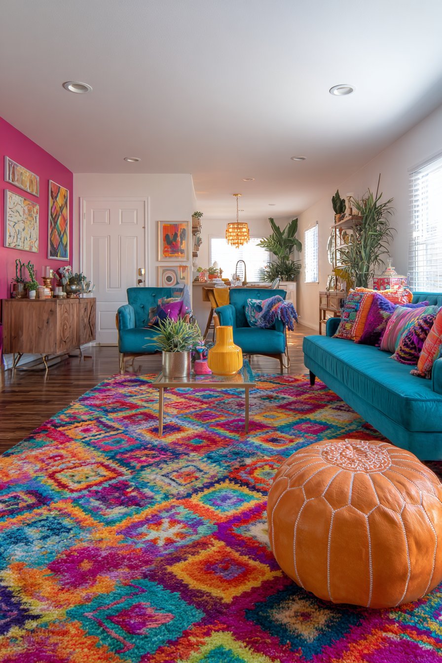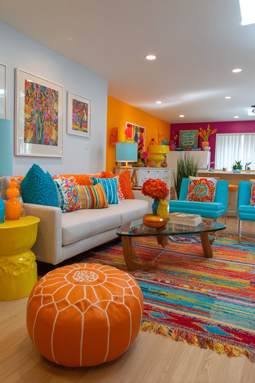 Turquoise velvet armchairs flank the seating area while a fuchsia accent wall creates an unapologetically bold backdrop. The orange Moroccan-style pouf and yellow ceramic side table add playful global-inspired elements that enhance the maximalist spirit. An eclectic gallery wall features artwork incorporating all the vibrant hues, serving as the visual anchor that makes sense of the diverse color palette.