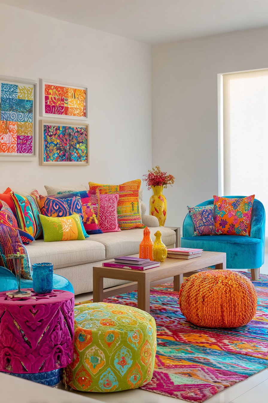 The multi-colored kilim rug layers pattern and color while grounding the space, its traditional geometric patterns providing structure within the colorful abundance. White walls on three sides prevent overwhelming and provide visual breathing room essential to maximalist living room color ideas. Natural light and warm artificial lighting work together to showcase the joyful color interactions, as good lighting prevents vibrant spaces from feeling chaotic or garish.