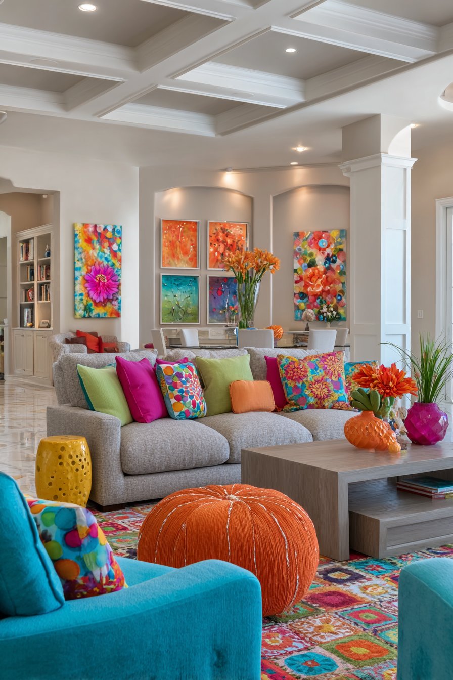 Bold, exuberant living room color ideas embracing maximalist multi-color palettes prove that more can indeed be more when executed with intention and confidence. This approach celebrates color in all its glory, creating spaces that radiate joy and personality. A neutral oatmeal linen sofa serves as the perfect canvas for an explosion of colorful throw pillows in fuchsia, orange, turquoise, and yellow, demonstrating how neutral foundations enable bold color experimentation.