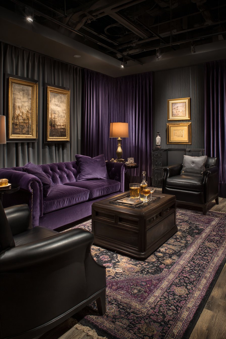 The deep purple and grey area rug with traditional pattern grounds the space while introducing complementary tones that bridge the charcoal and plum. Strategically placed lighting from multiple sources becomes absolutely crucial in dark living room color ideas—proper illumination creates ambiance and sophistication rather than gloom, highlighting the rich colors rather than obscuring them in shadow.