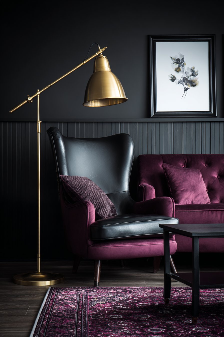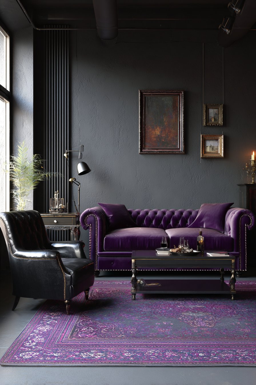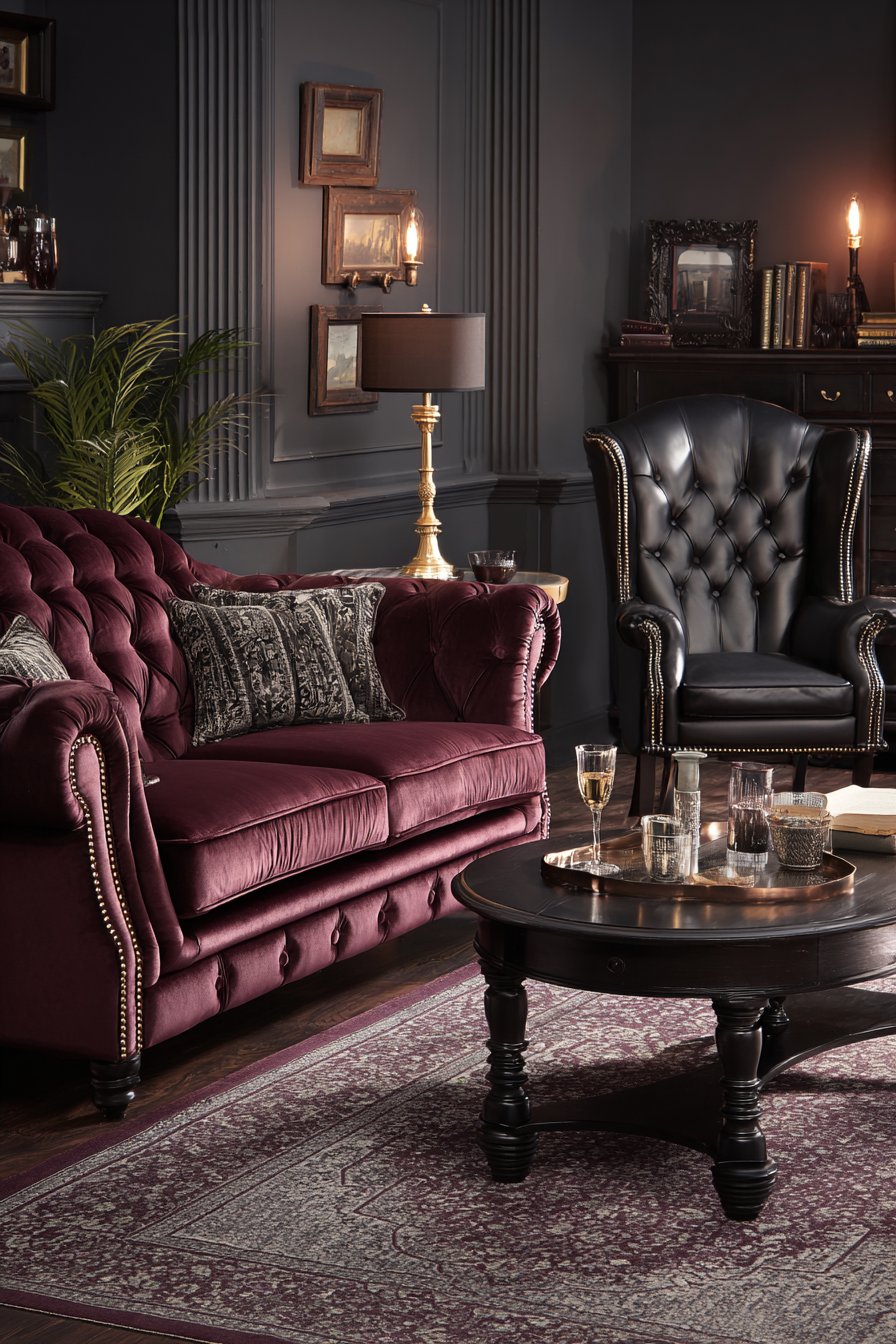 Moody, luxurious living room color ideas featuring deep charcoal and plum with brass accents create intimate spaces of dramatic sophistication. This dark, rich palette challenges conventional design wisdom while creating rooms of unmatched atmosphere and elegance. Walls painted in sophisticated charcoal create an enveloping backdrop for a plum velvet sofa with deep button tufting, its jewel tone and luxurious texture standing beautifully against the dark walls.