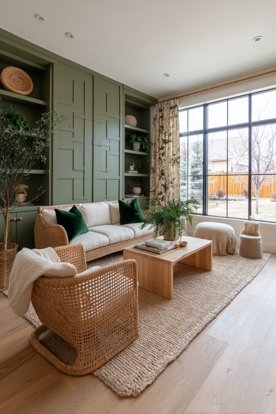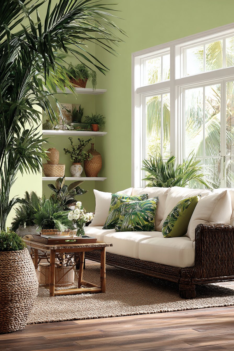Nature-inspired living room color ideas featuring lush green tones with natural materials create indoor sanctuaries that celebrate botanical beauty and organic living. This approach brings the outdoors in through both color choices and material selections. Walls painted in soft sage green provide a soothing backdrop for a rattan sofa with cream cushions, immediately establishing the tropical foundation through both color and natural material.