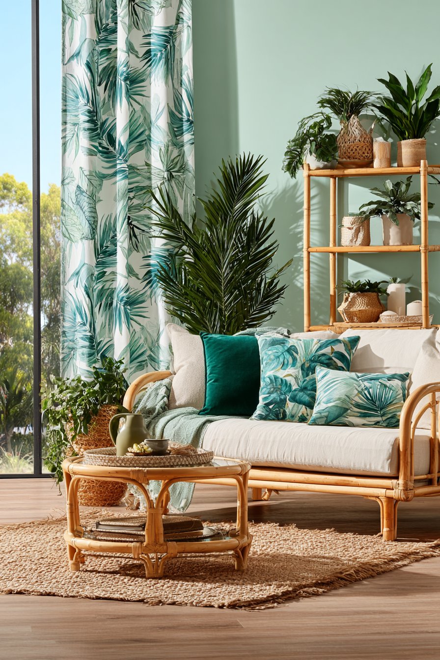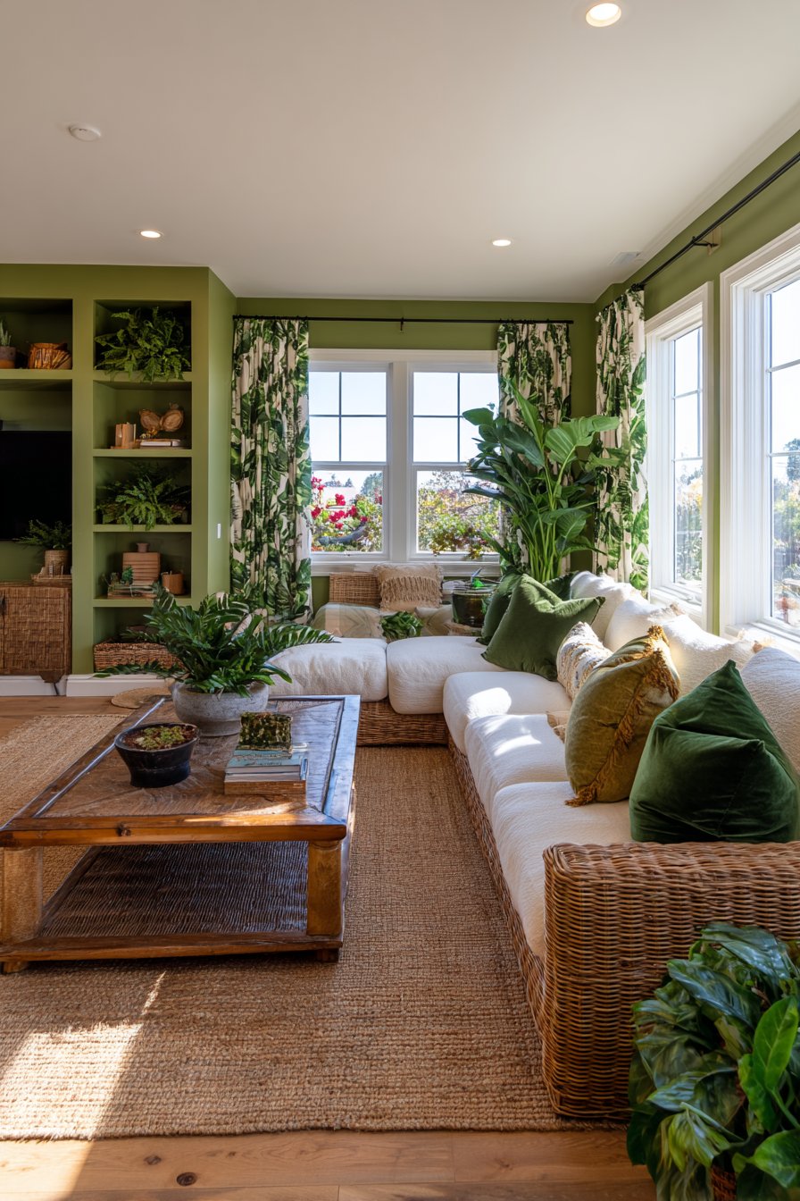 To create successful tropical green living room color ideas, layer multiple shades of green from pale sage to deep forest to create depth and prevent monotony within this analogous color scheme. Incorporate abundant natural materials—rattan, bamboo, jute, seagrass, natural wood—that authentically represent tropical environments and enhance the organic feeling. Add actual living plants generously throughout the space to reinforce the botanical theme and bring authentic green tones that shift with seasons and lighting. Balance the green dominance with warm neutral tones in natural materials (honey-toned wood, cream fabrics, natural fiber rugs) to prevent the space from feeling too saturated or artificial. Maximize natural light to keep the greens feeling fresh and vibrant rather than murky or dark, as green can appear quite different under natural versus artificial lighting.
