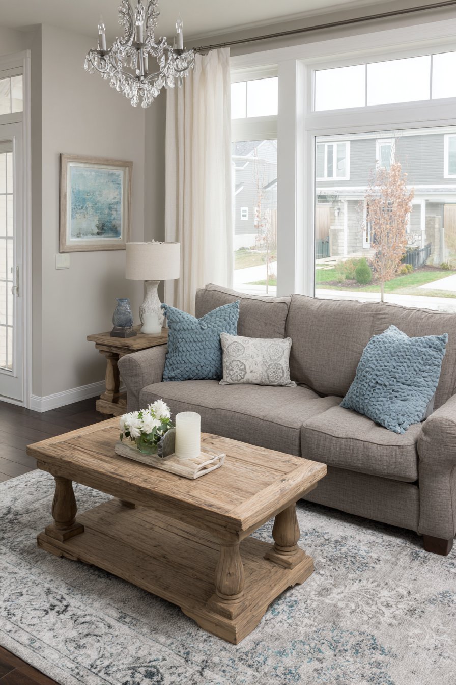 The light blue-grey accent wall adds gentle color interest without overwhelming, demonstrating how living room color ideas can incorporate subtle color while maintaining overall neutrality. Ivory area rug with delicate taupe pattern defines the seating zone while adding soft pattern that enhances rather than dominates. Weathered oak coffee table and side tables introduce natural warmth essential to preventing taupe and ivory schemes from feeling too formal or hotel-like.