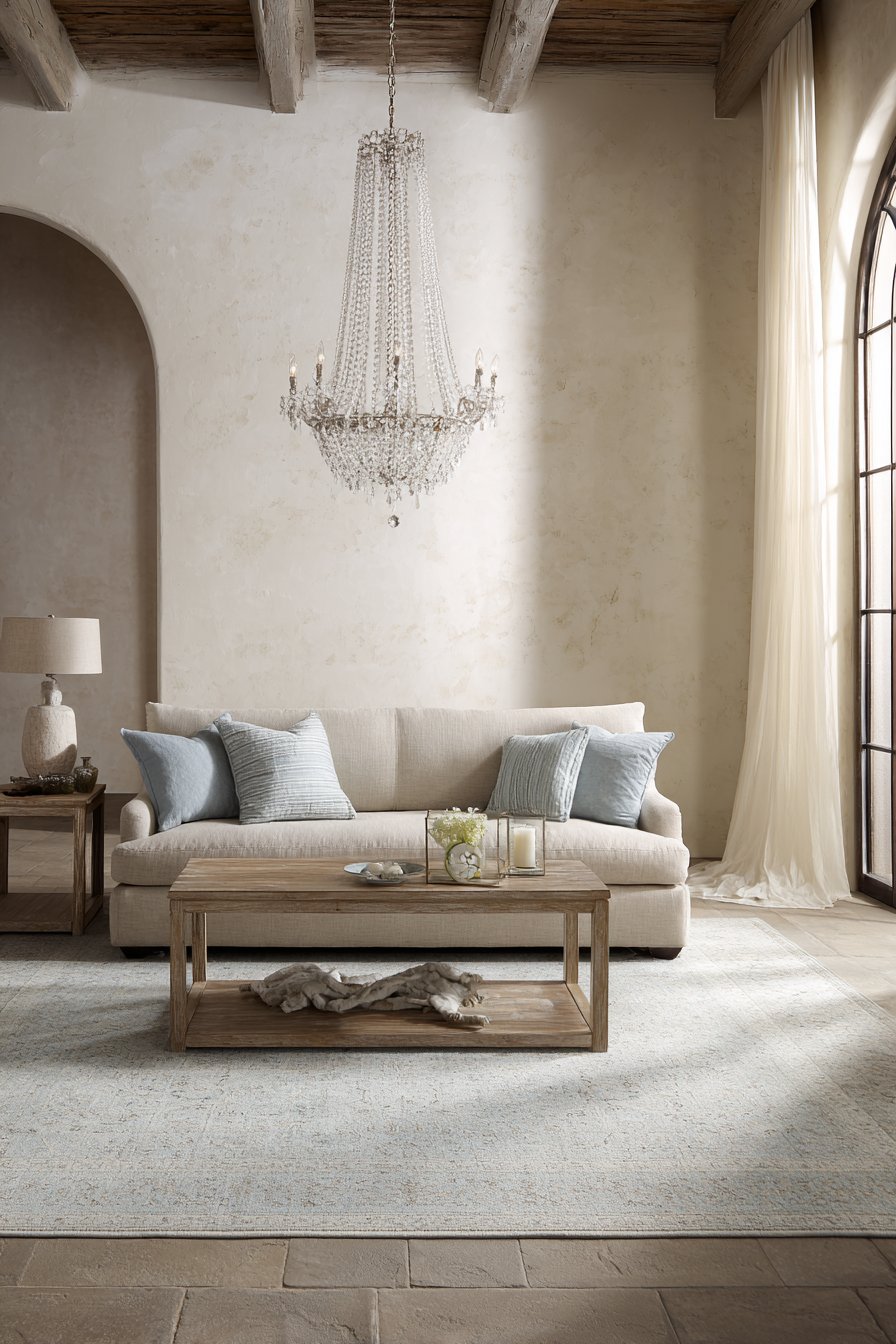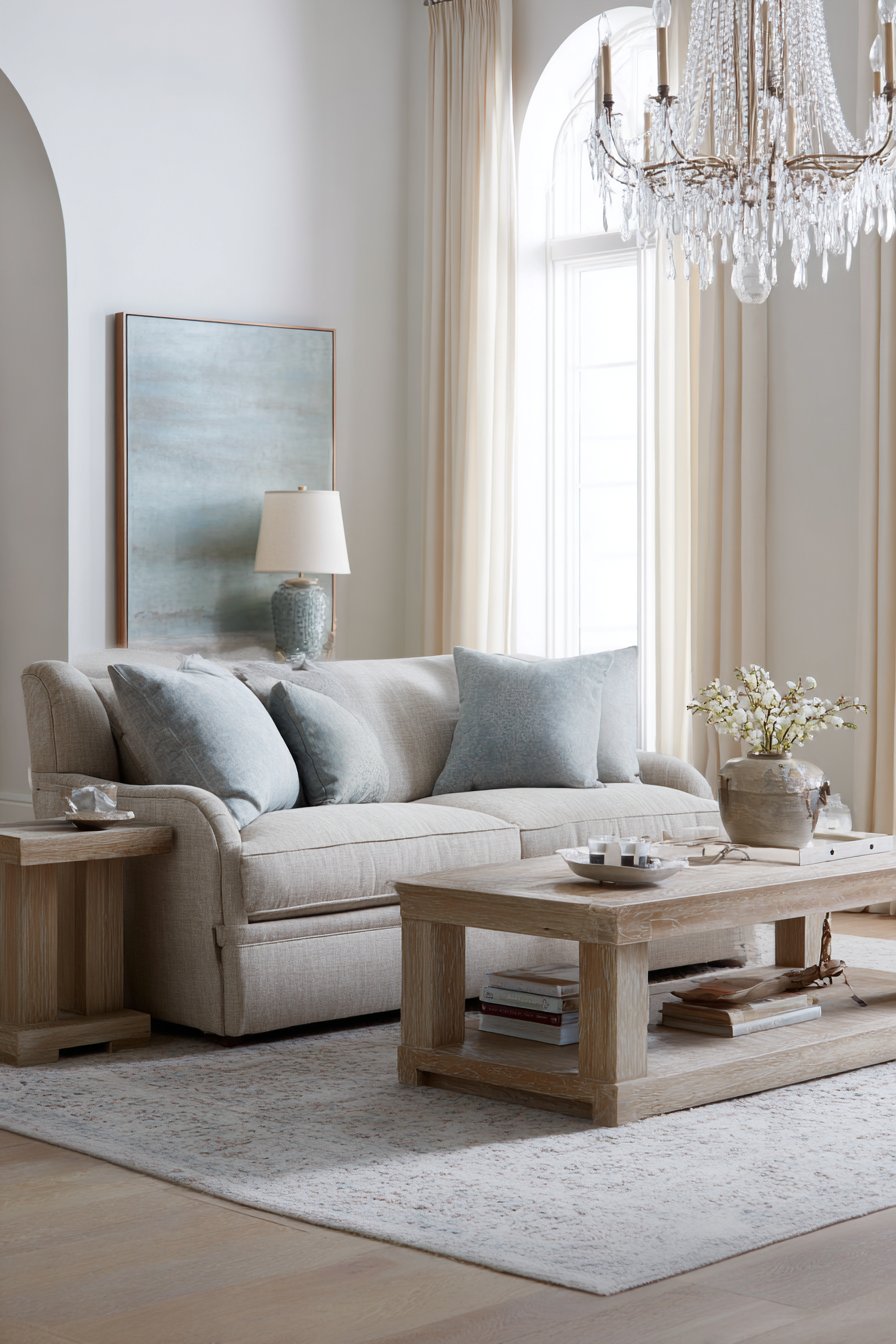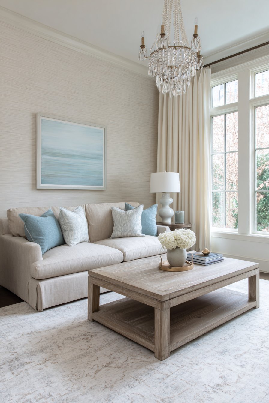 Soft blue throw pillows and ceramic table lamp provide restrained color pops that add personality without disrupting the serene palette. Brushed nickel and crystal chandelier adds elegance and light reflection while maintaining the refined aesthetic. Flowing ivory curtains frame windows allowing filtered natural light that brings out the subtle warmth in taupe tones.