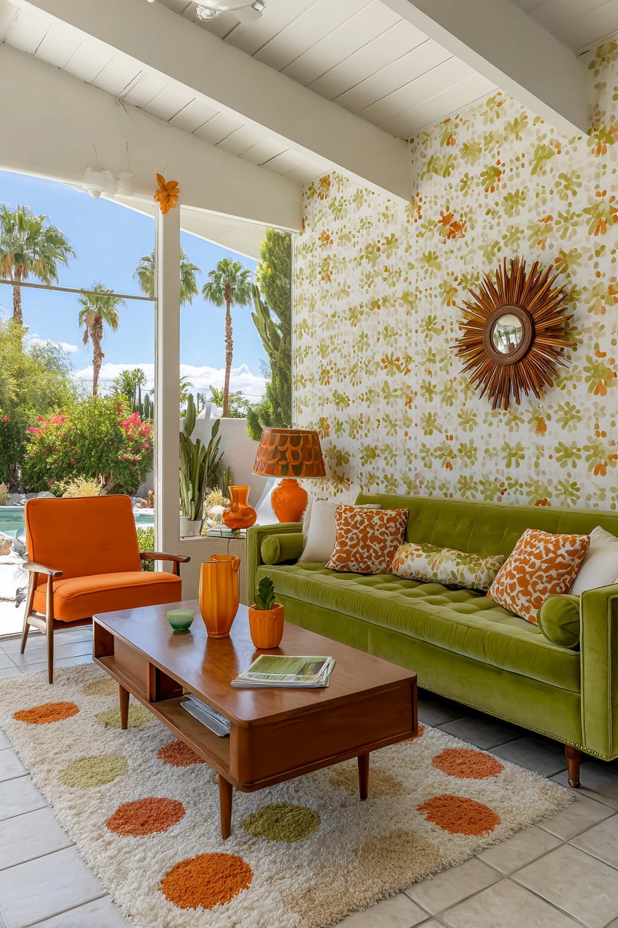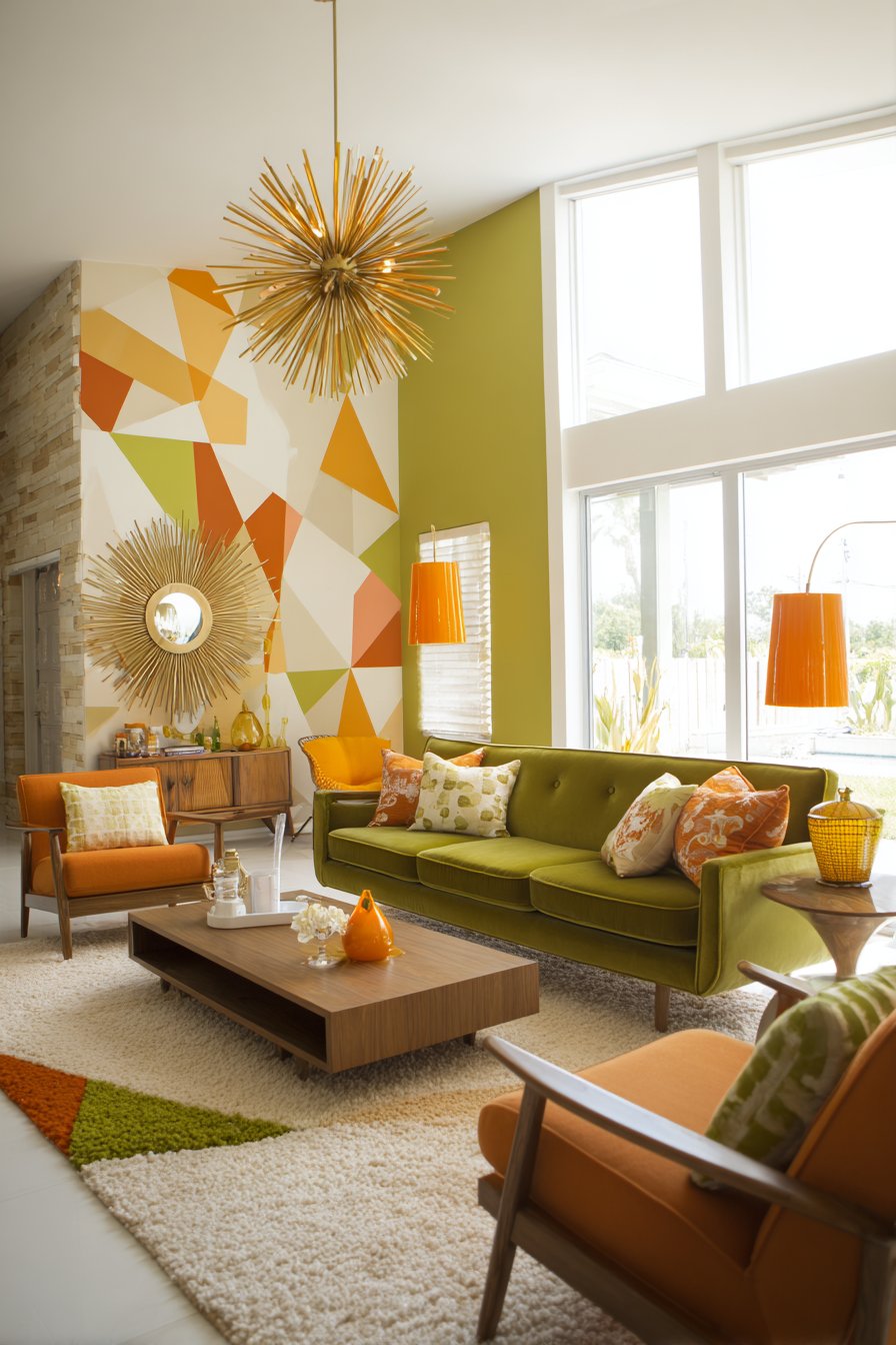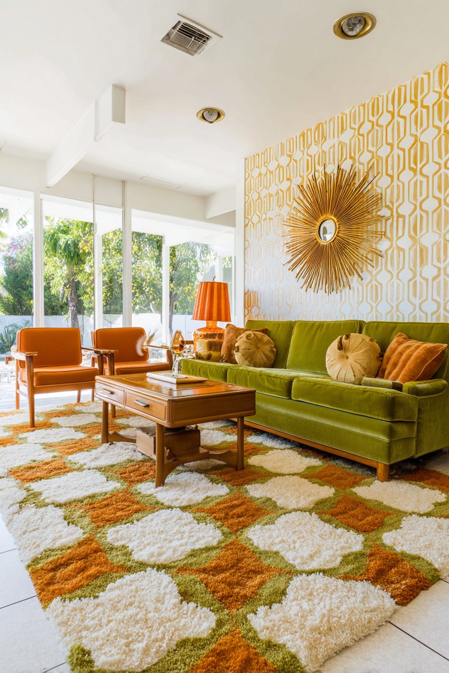 Brass sunburst mirror and amber glass table lamps add period-appropriate metallic touches that complement the warm earth tones beautifully. Natural light from large windows highlights the nostalgic living room color ideas while preventing the saturated colors from appearing too dark or heavy. The overall effect creates spaces that celebrate vintage design with confidence and joy.