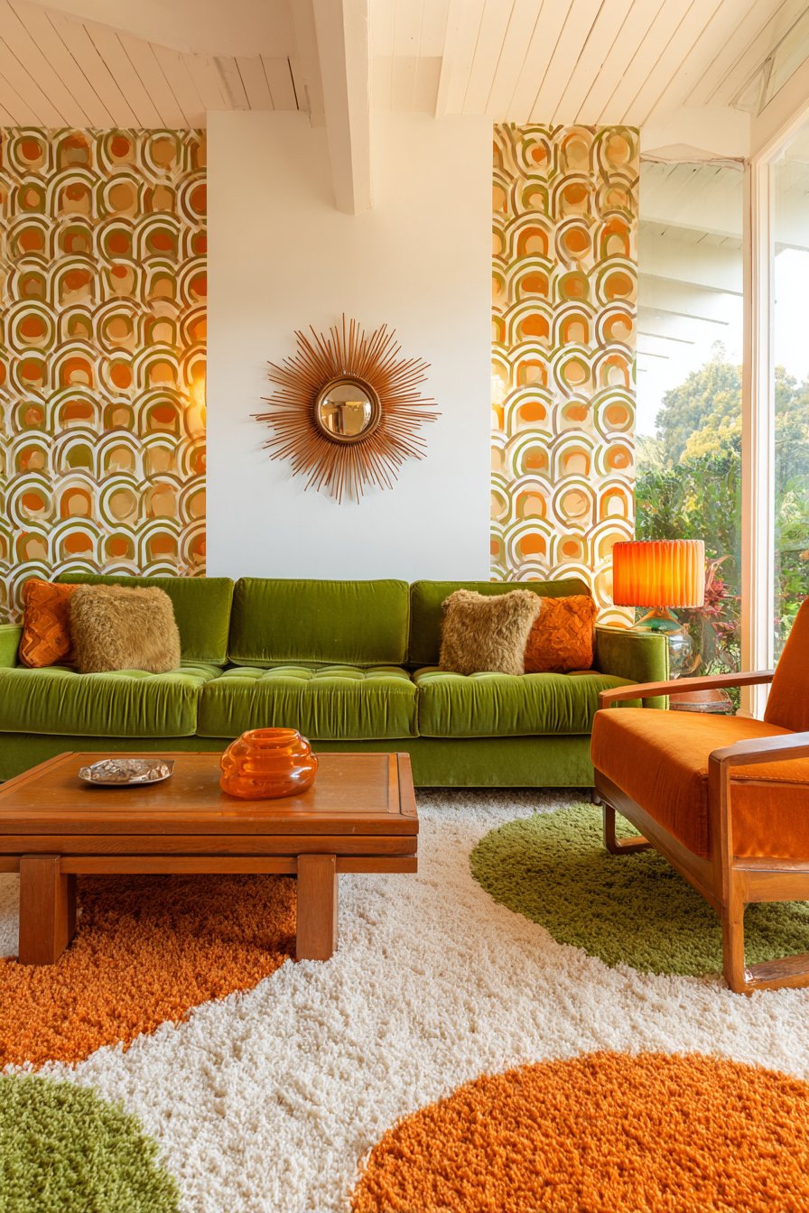 Burnt orange accent chairs with wooden arms flank a teak wood coffee table, creating an authentic period color combination that feels both nostalgic and fresh again. One accent wall features geometric wallpaper incorporating both colors against a cream background, adding pattern and intensifying the retro aesthetic. Shag area rug in cream with orange and green accents grounds the vintage palette while contributing classic 70s texture.